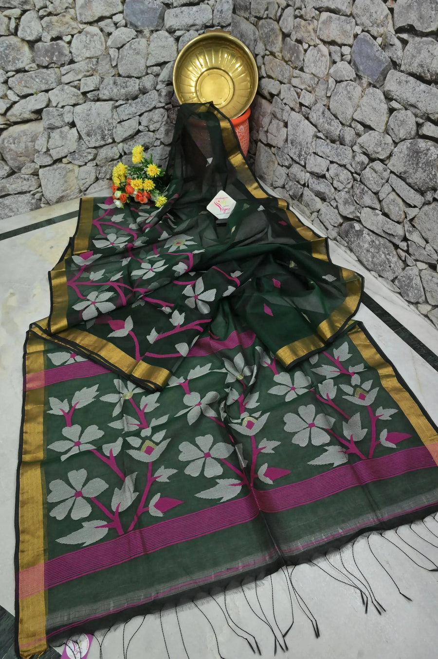 Bottle Green Color Muslin Jamdani Saree with Allover...