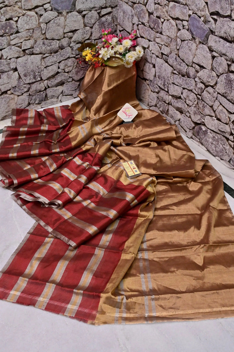 Brass Golden and Red Color Pure Tissue Chanderi Silk...