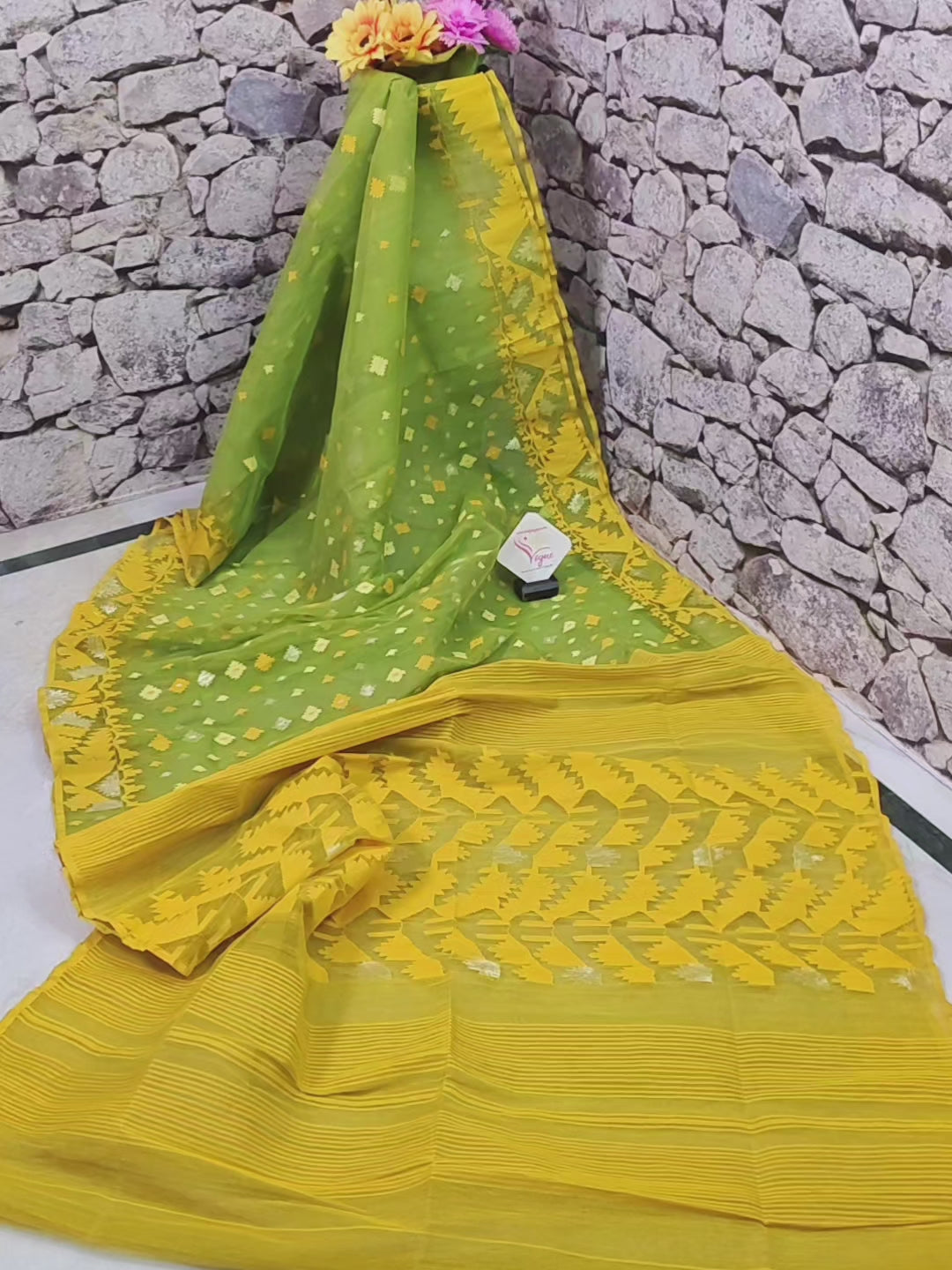 Step into the timeless charm of tradition with this playful Bangladeshi Dhakai Cotton Jamdani Saree, swirling in lively light green and yellow shades. Adorned with shimmering threads of golden, silver, and copper zari, every motif dances with the skillful touch of Bengal’s master weavers.