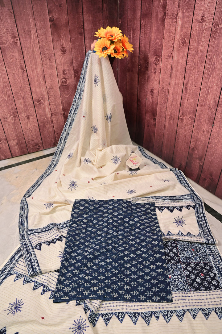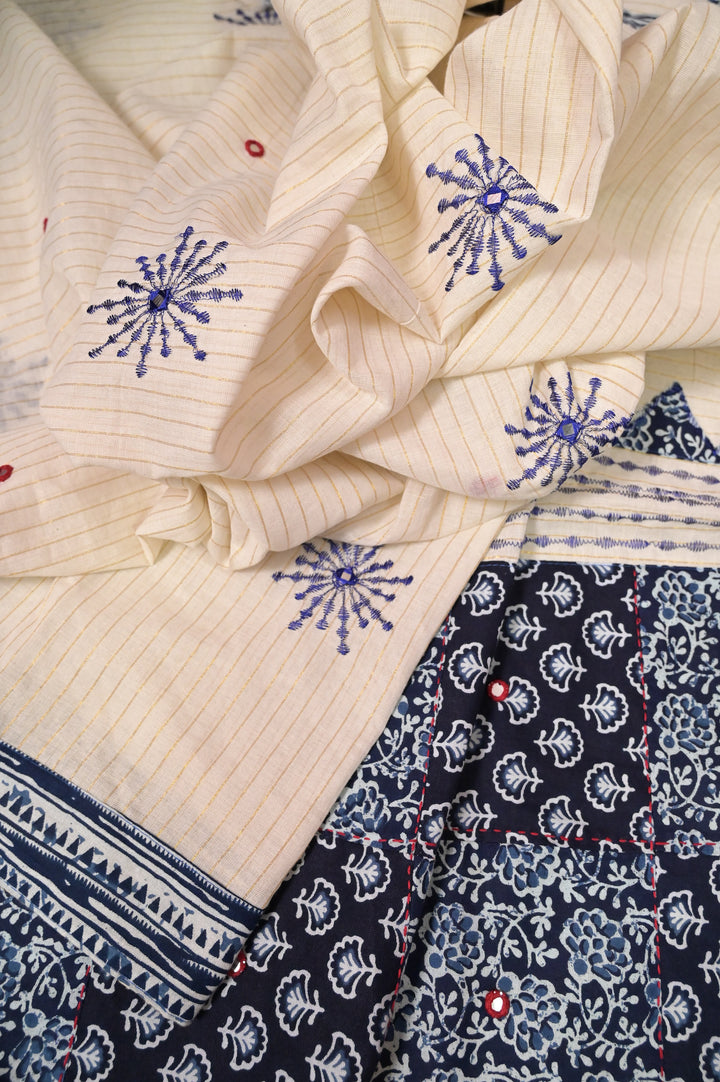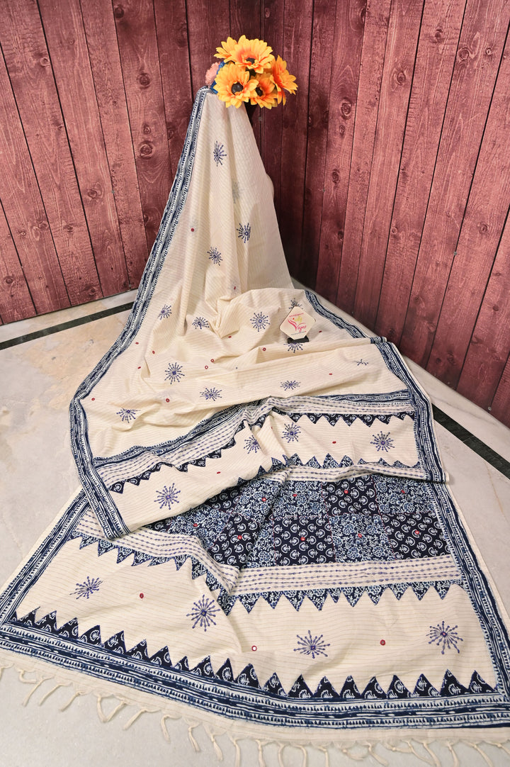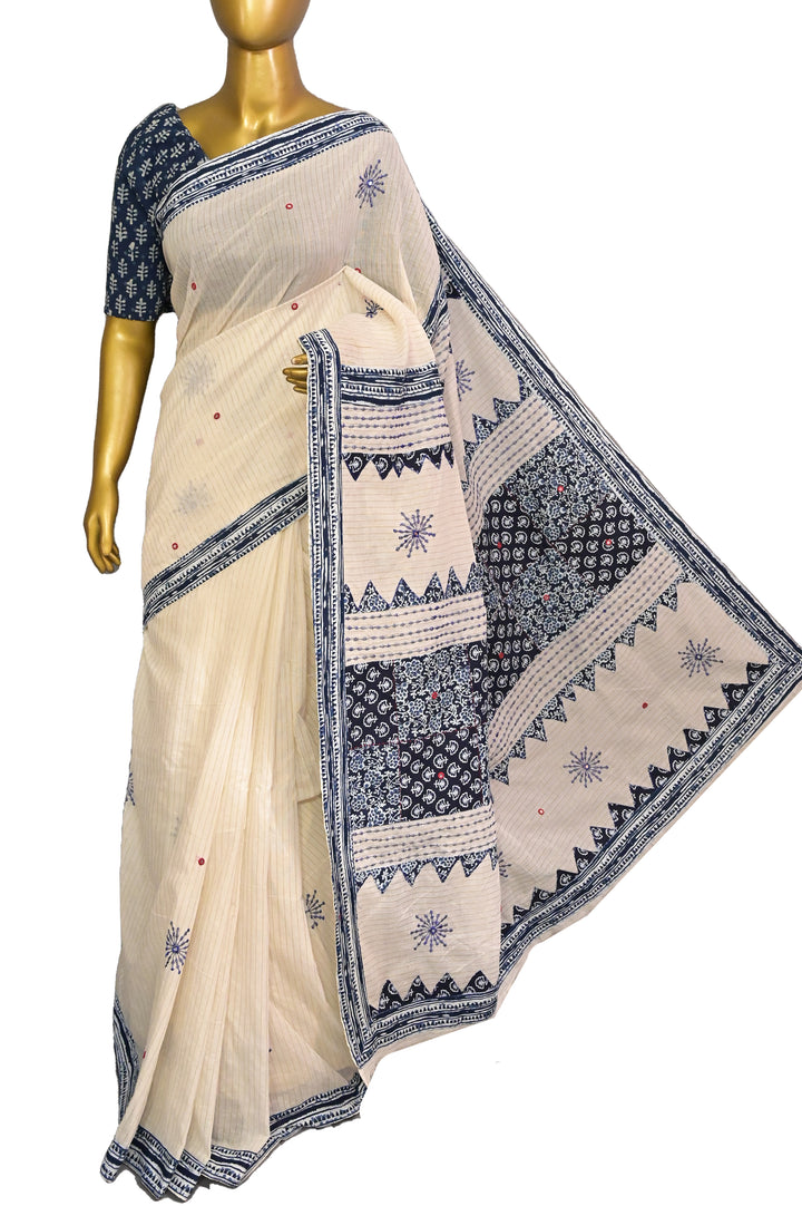 The saree is gracefully accentuated with navy blue appliqué, further enriched by intricate indigo blue machine embroidery and captivating mirror work that lend a touch of regal elegance. Light in weight and supremely breathable, the fine Bengal cotton drapes effortlessly, offering unparalleled comfort without compromising on sophistication.