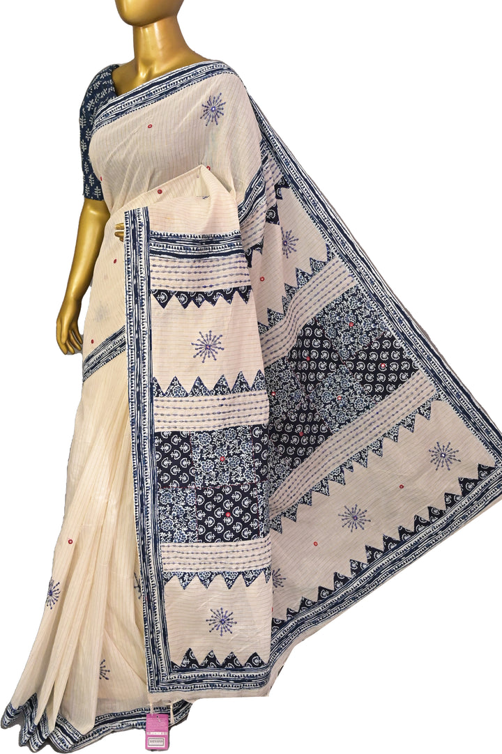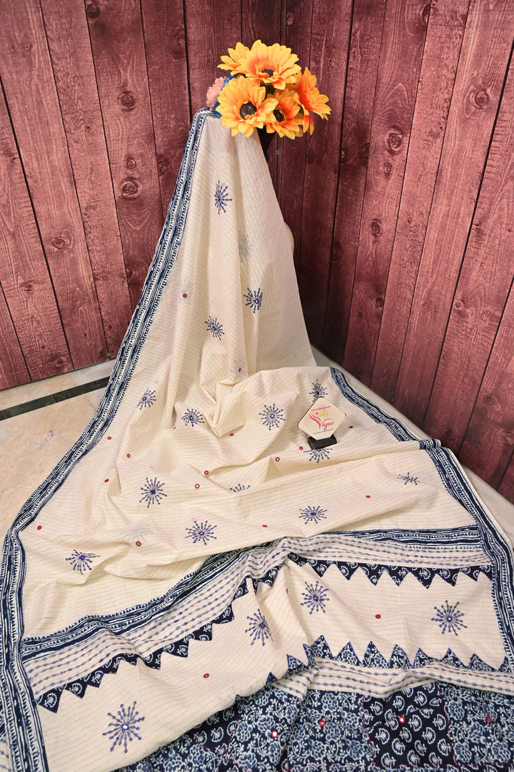 Bengal Cotton Saree in Offwhite Color with Allover Zari Stripes and Applique with Embroidery and Mirror Work