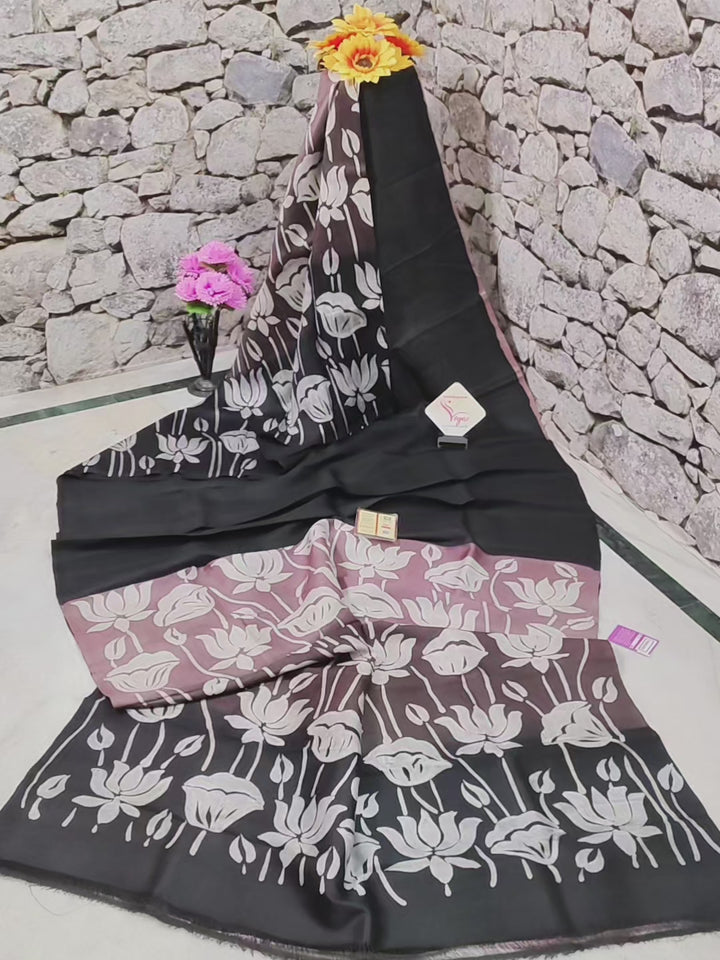 Black and Multishaded Bishnupur Silk Saree with Lotus Hand Paint and Patli Pallu