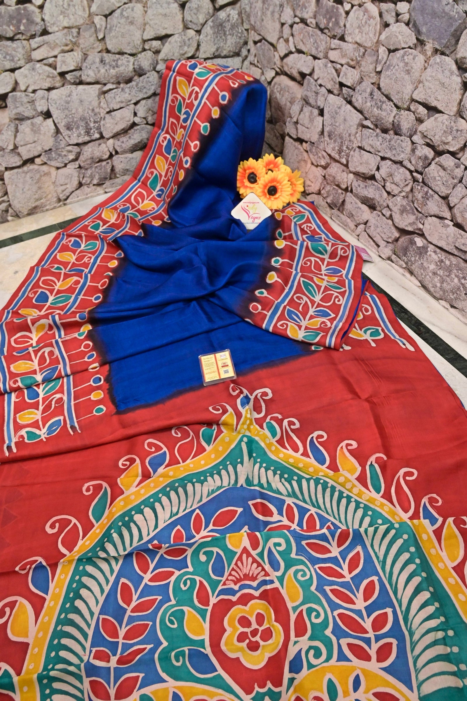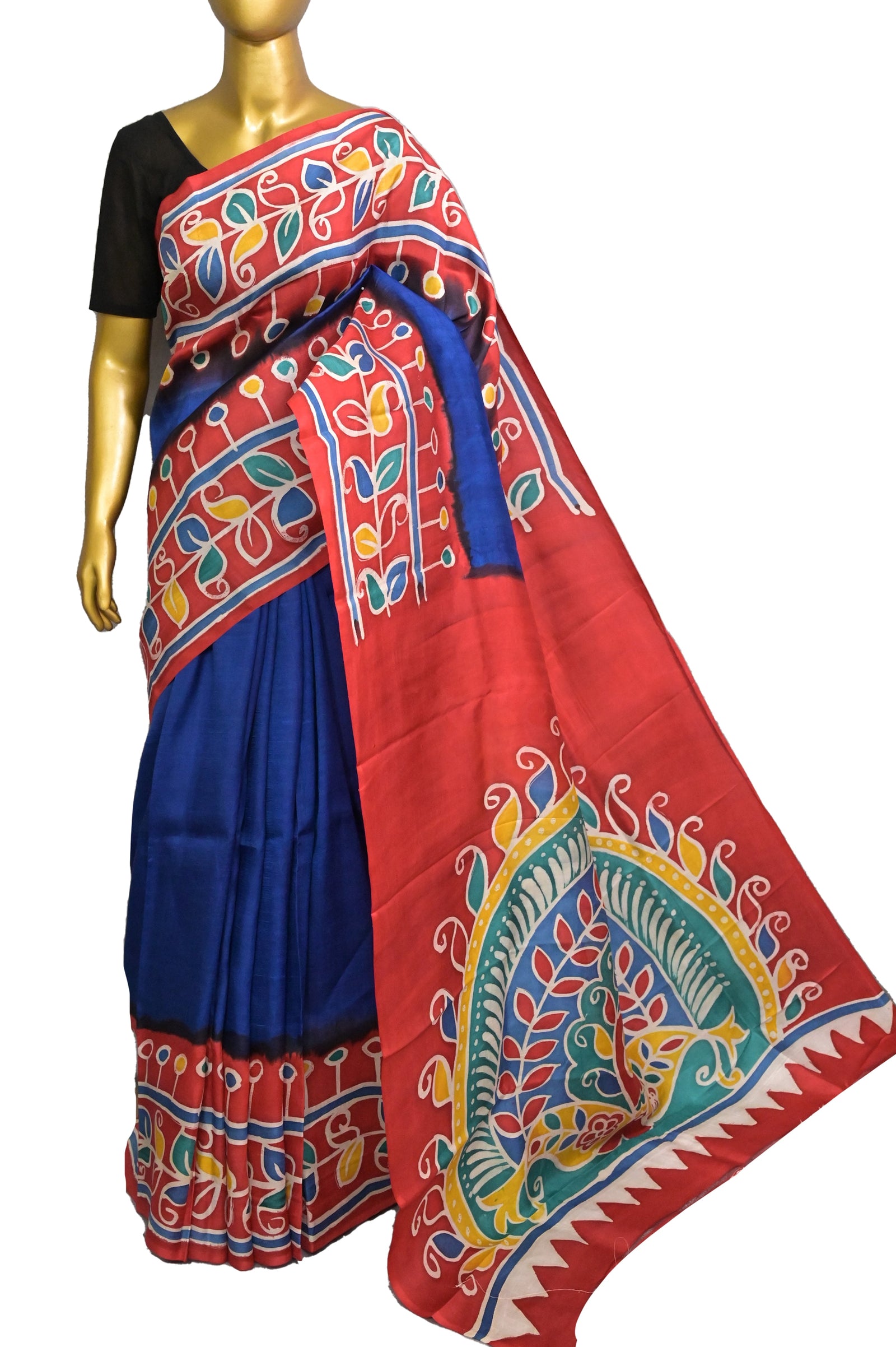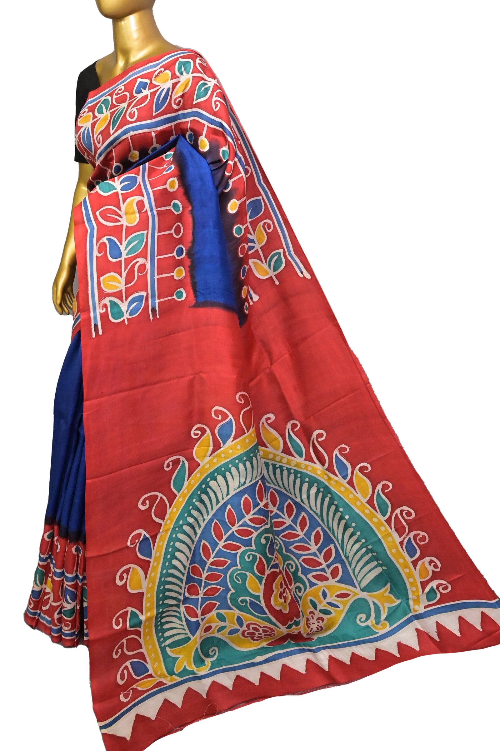 Blue and Red Color Pure Bishnupur Silk Saree with Hand Batik