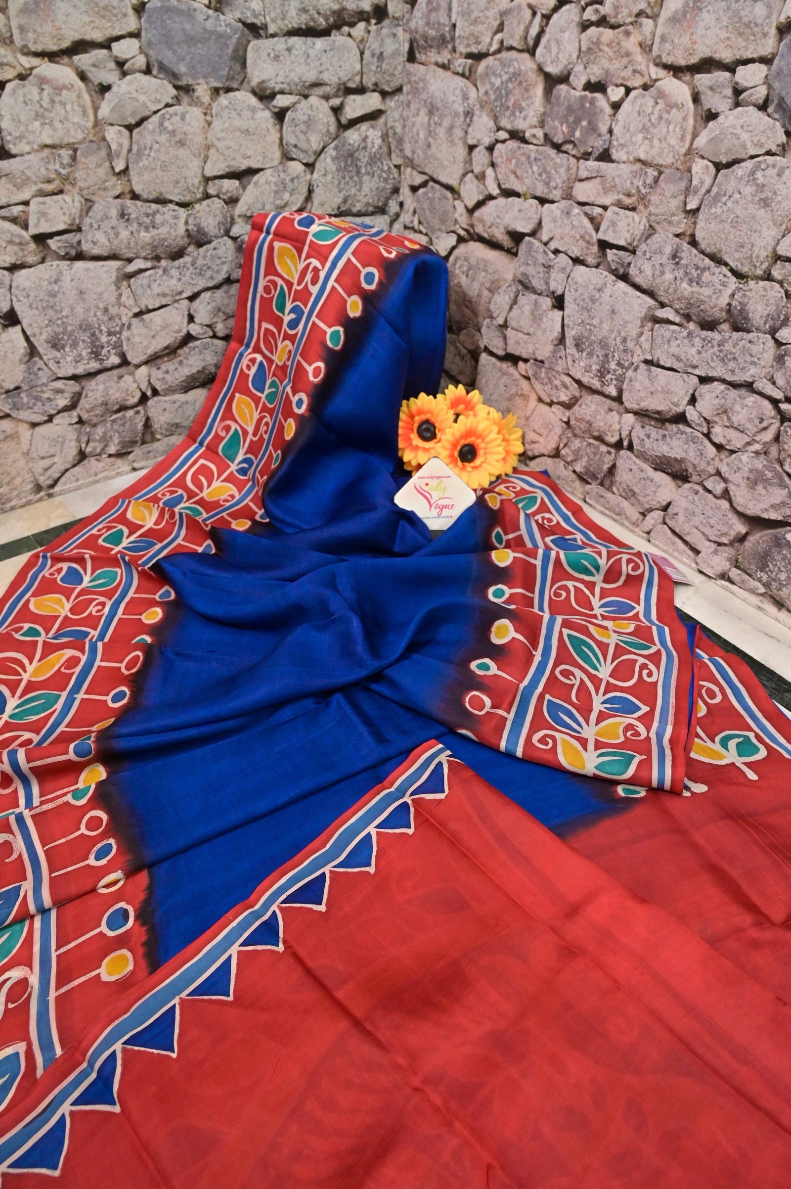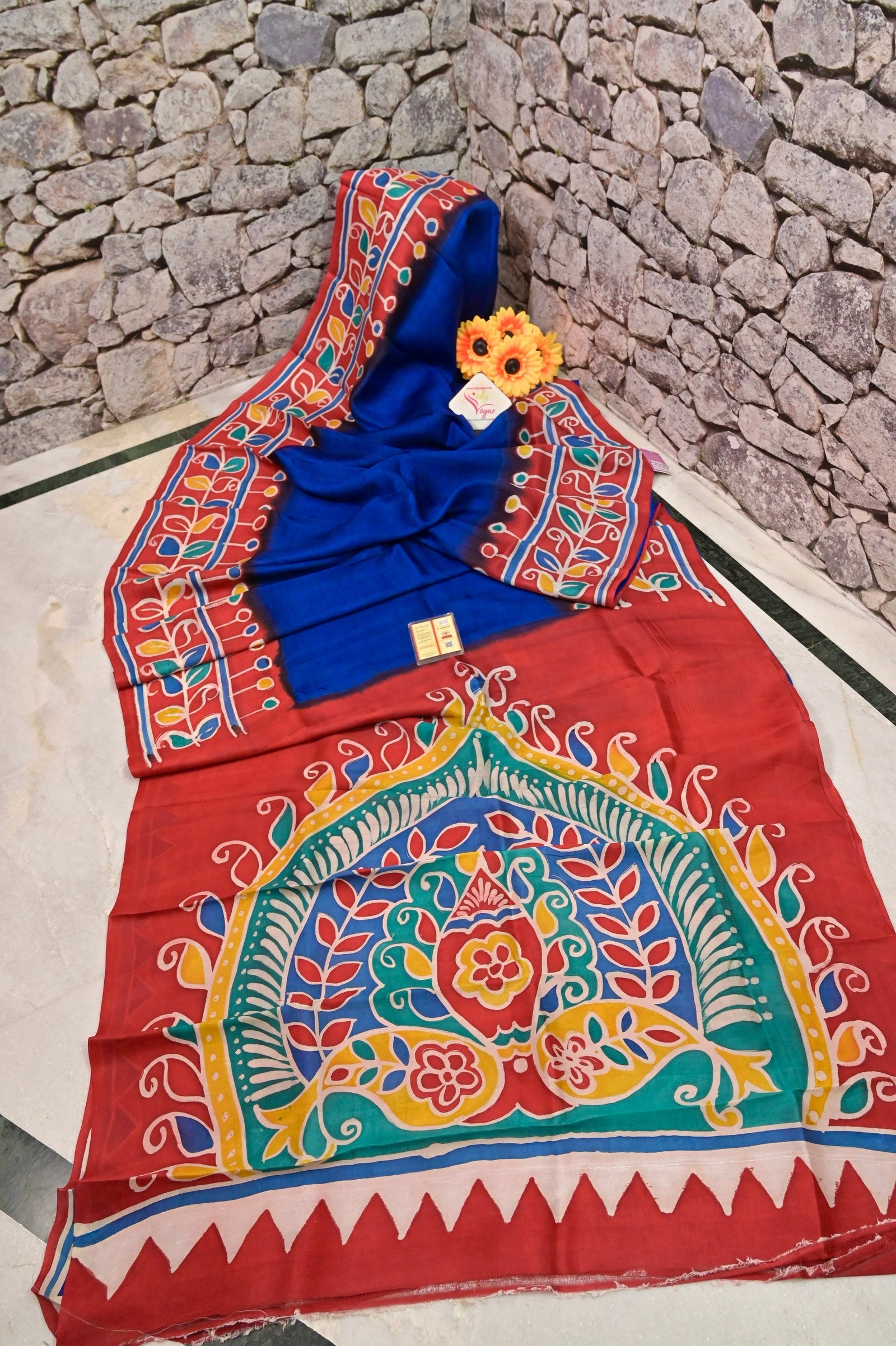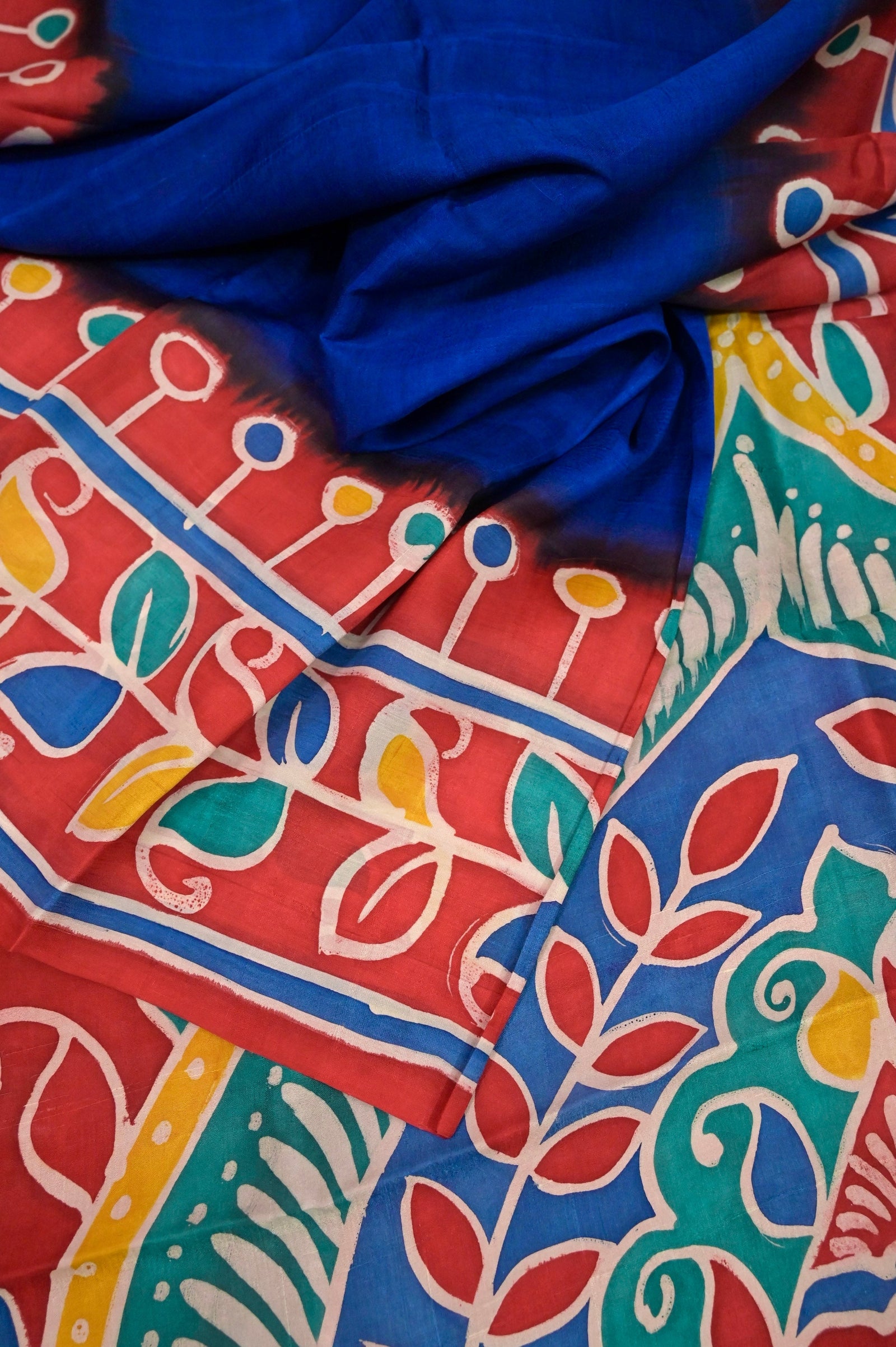 Blue and Red Color Pure Bishnupur Silk Saree with Hand Batik
