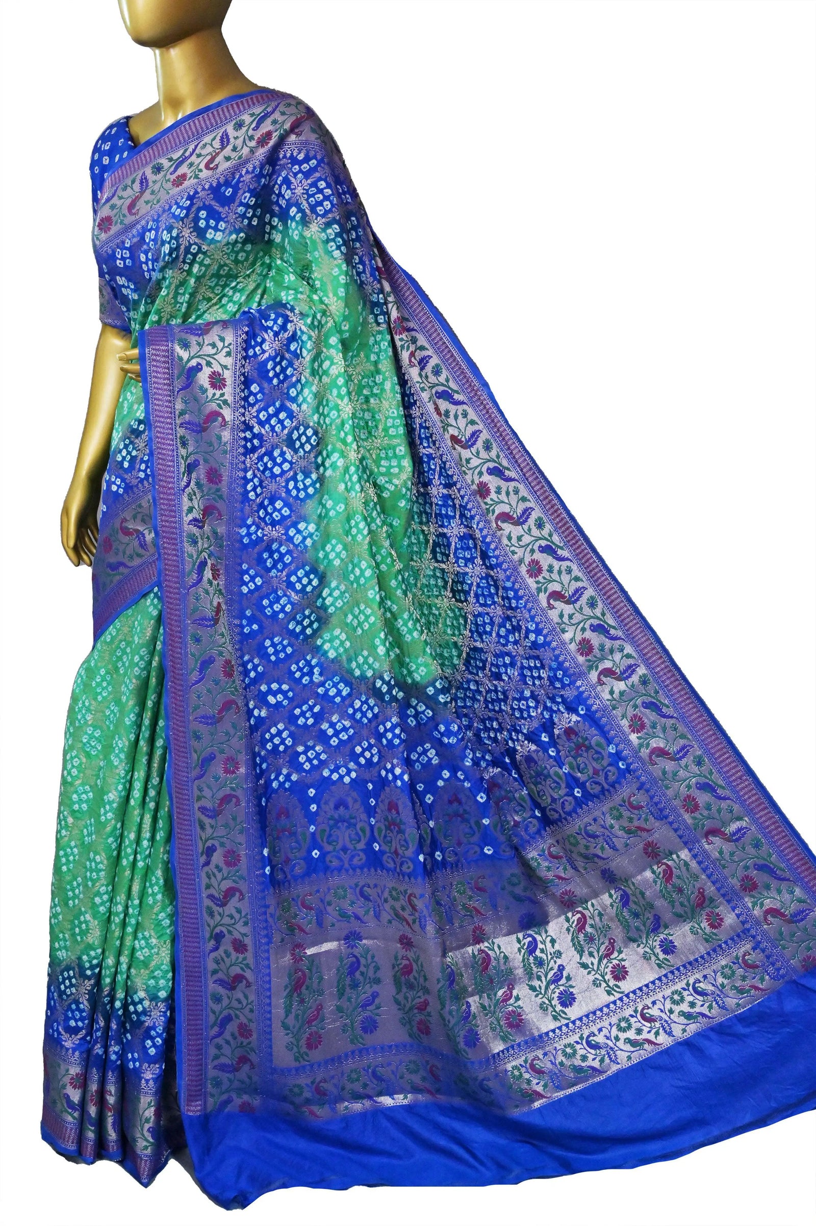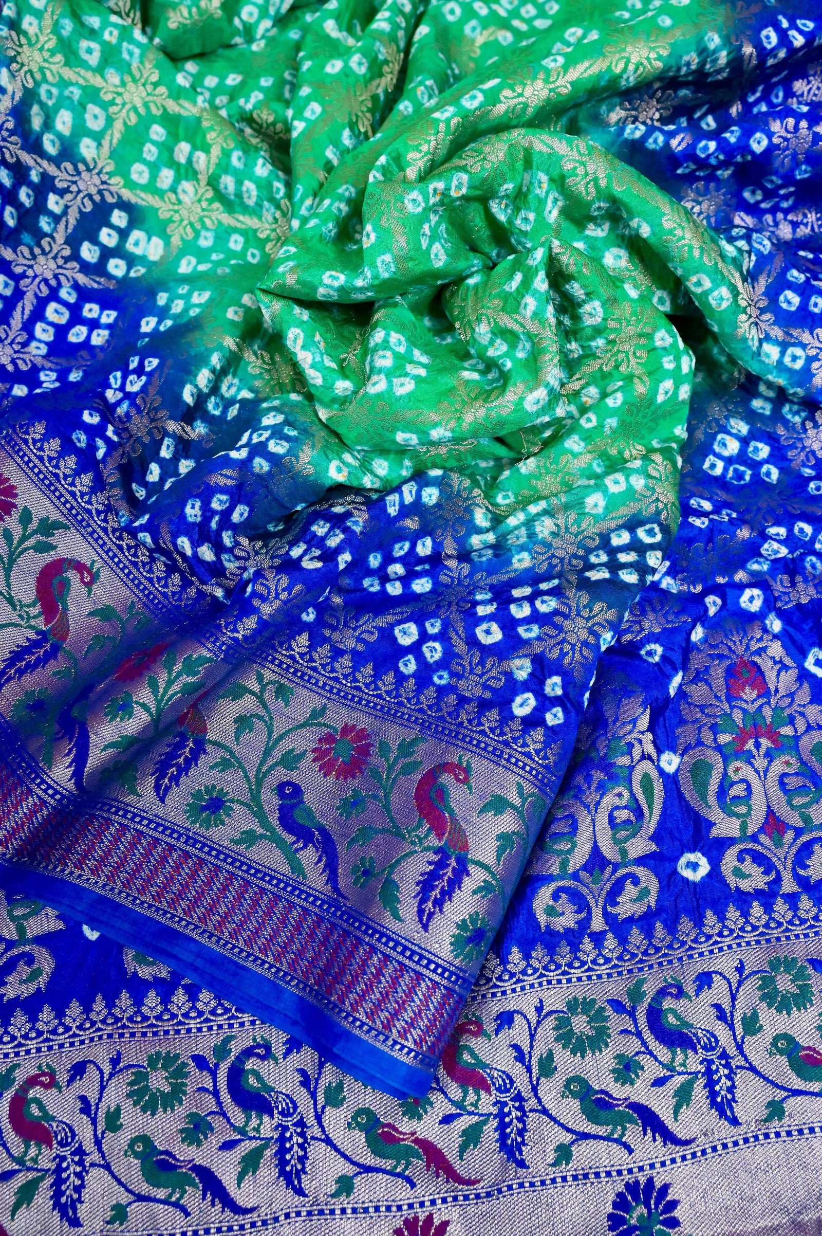Blue and Sea Green Color Dupion Silk Saree with Hand Bandhani and Paithani Work