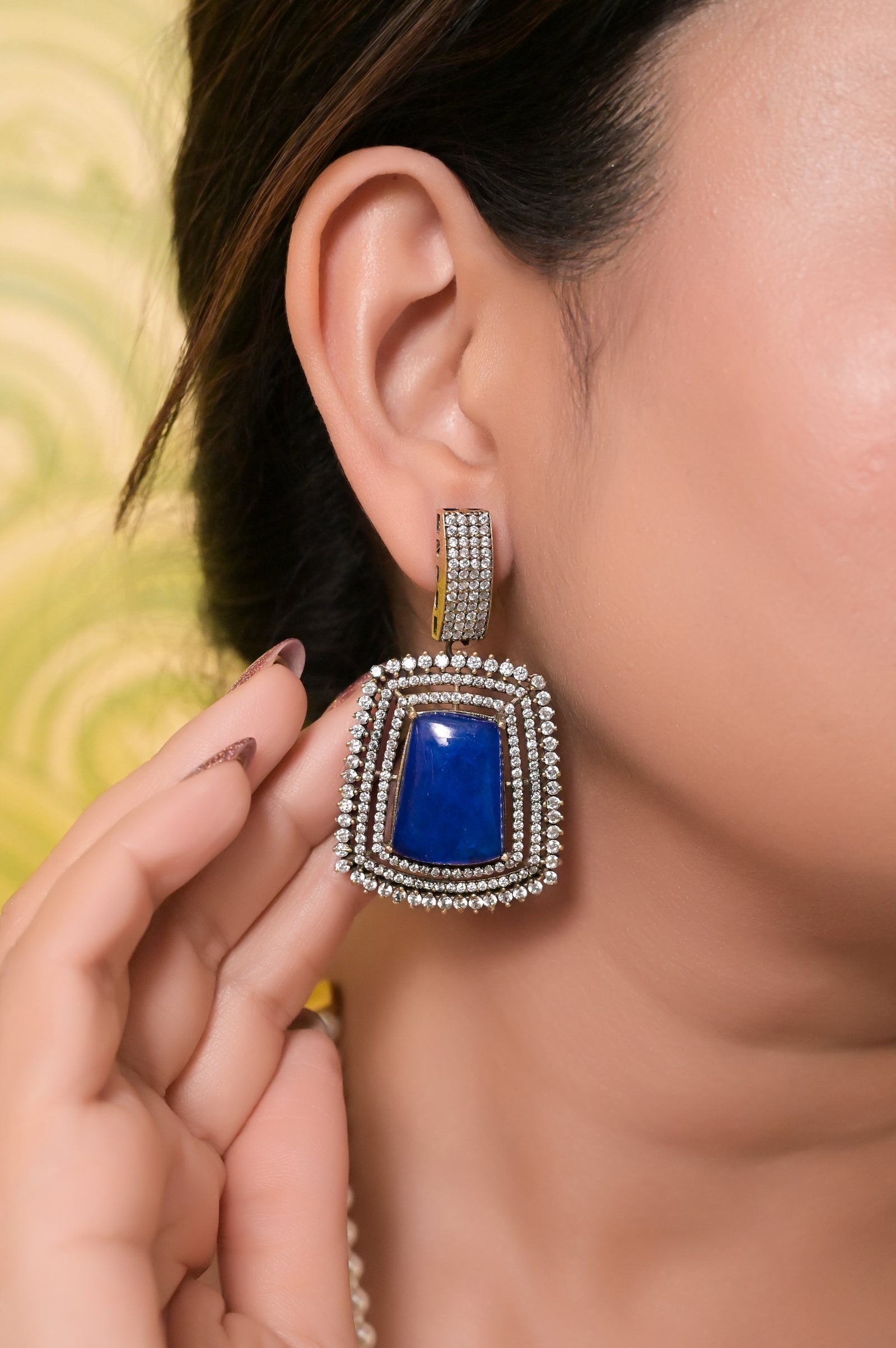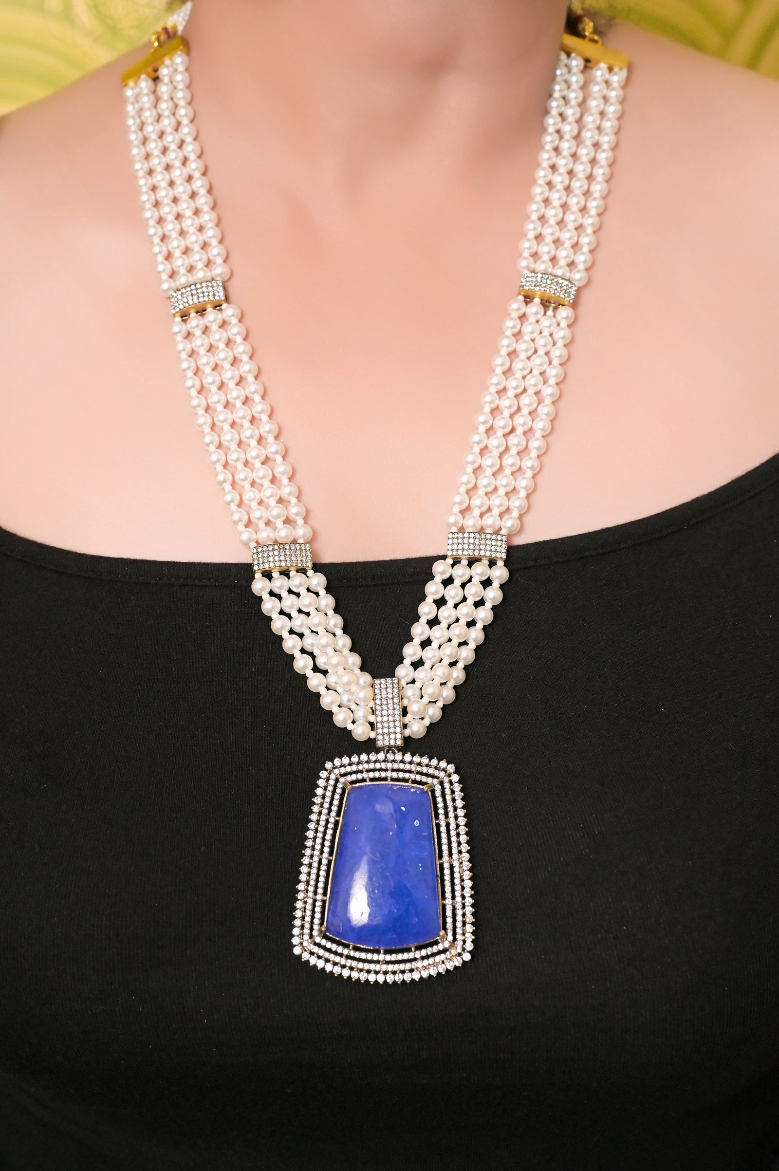 Add elegance with this Blue Monalisa Stone pendant, exquisitely framed by sparkling white AD stones. Paired with a delicate pearl string Sitahar-style necklace, this set exudes timeless charm and regal sophistication. Perfect for weddings, festivals, or special occasions, it effortlessly blends classic grace with contemporary allure. A true statement of grace and sophistication. The penny is kept aside to make you understand the actual size of the necklace.