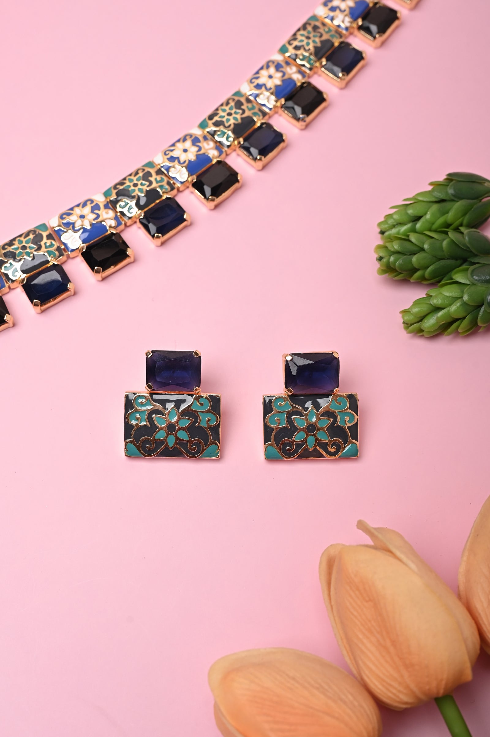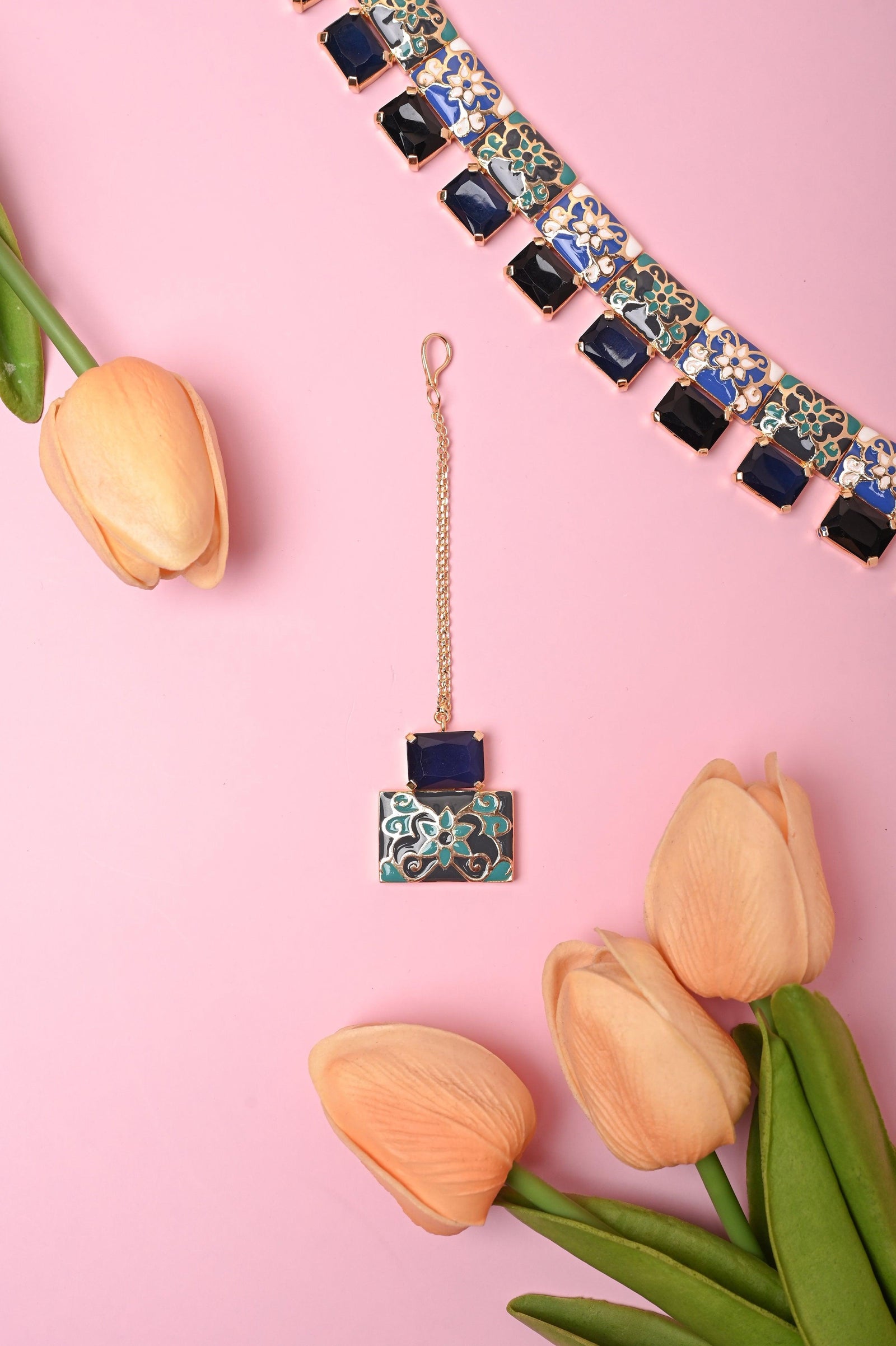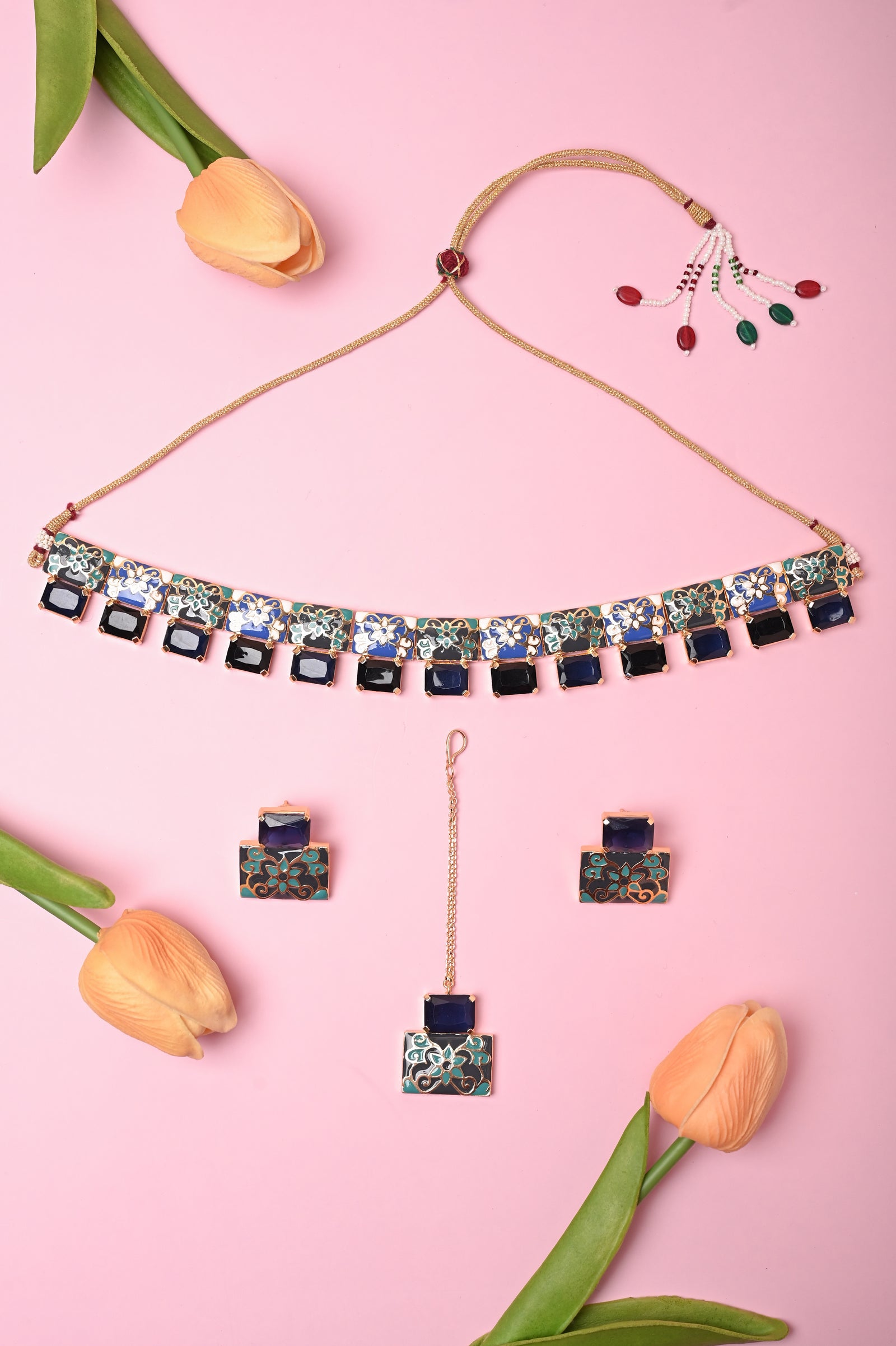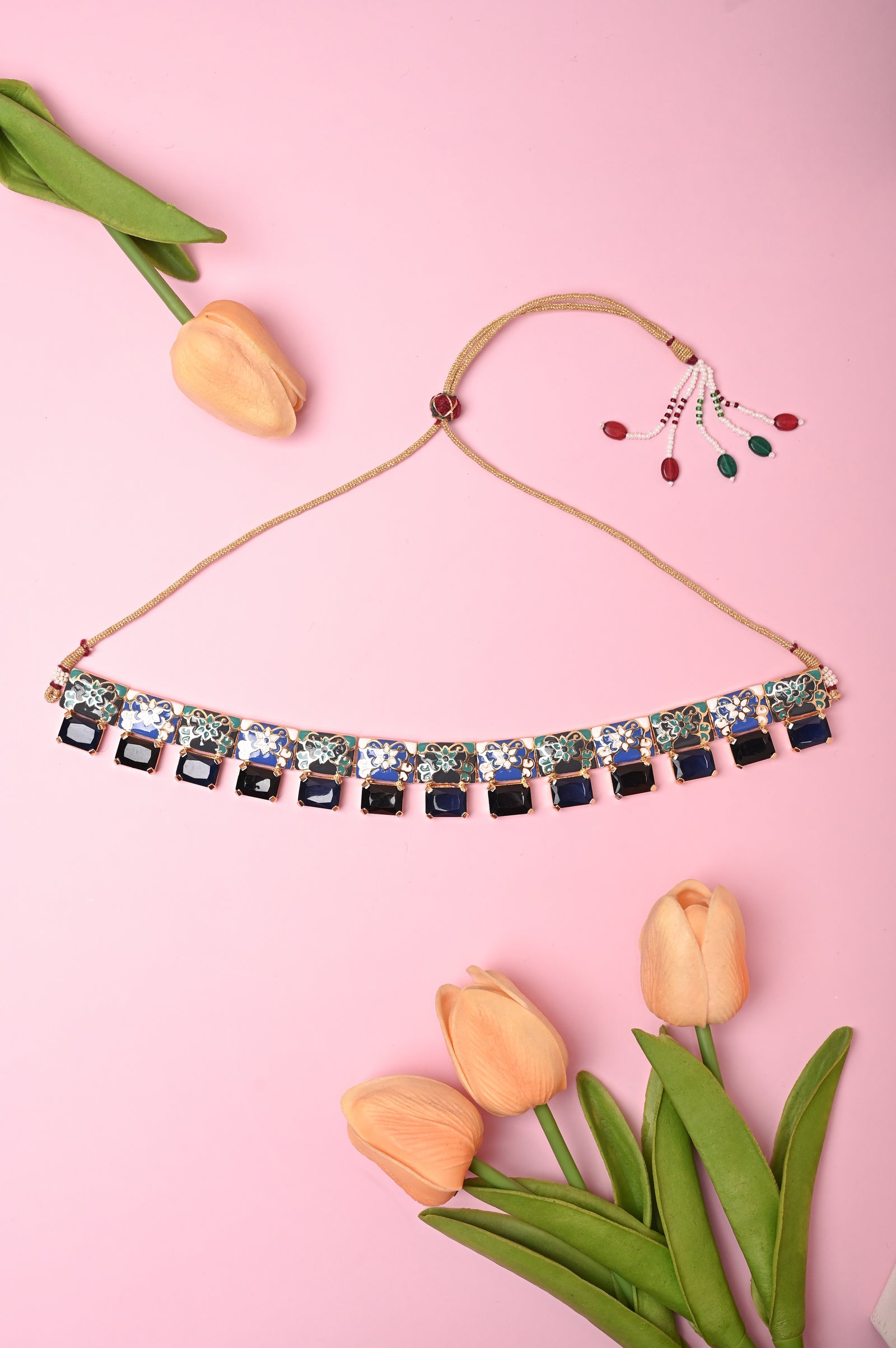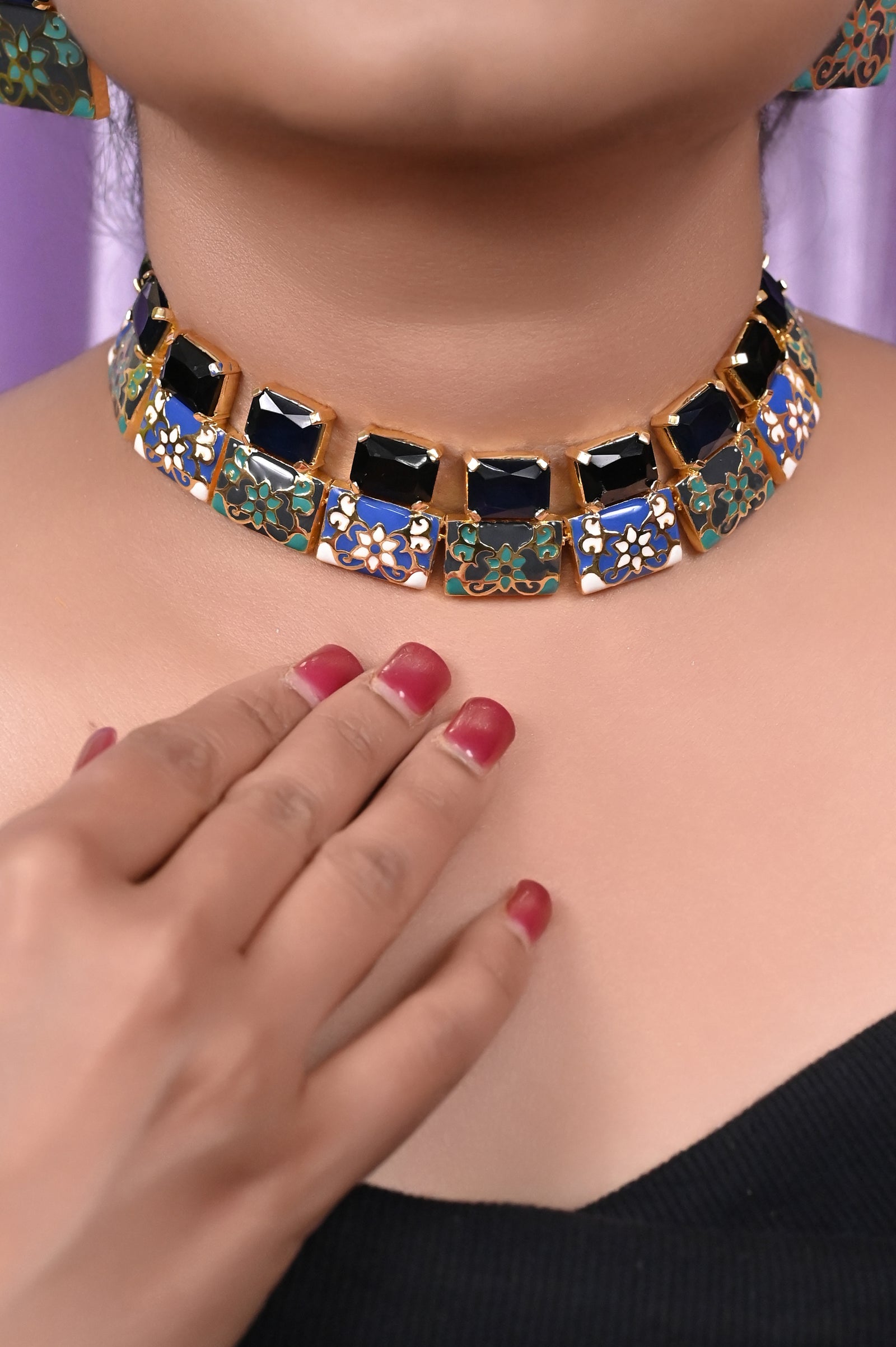 Elevate your style with our stunning blue stone-work choker necklace set! Featuring a lovely blue Monalisa stone, embellished with meenakari design on the pendant and earrings, this one-of-a-kind set is sure to make a statement. The matching stonework and meenakari studs add the perfect finishing touch, ideal for pairing with any saree. The penny is kept by the side to help you understand the size of the product.