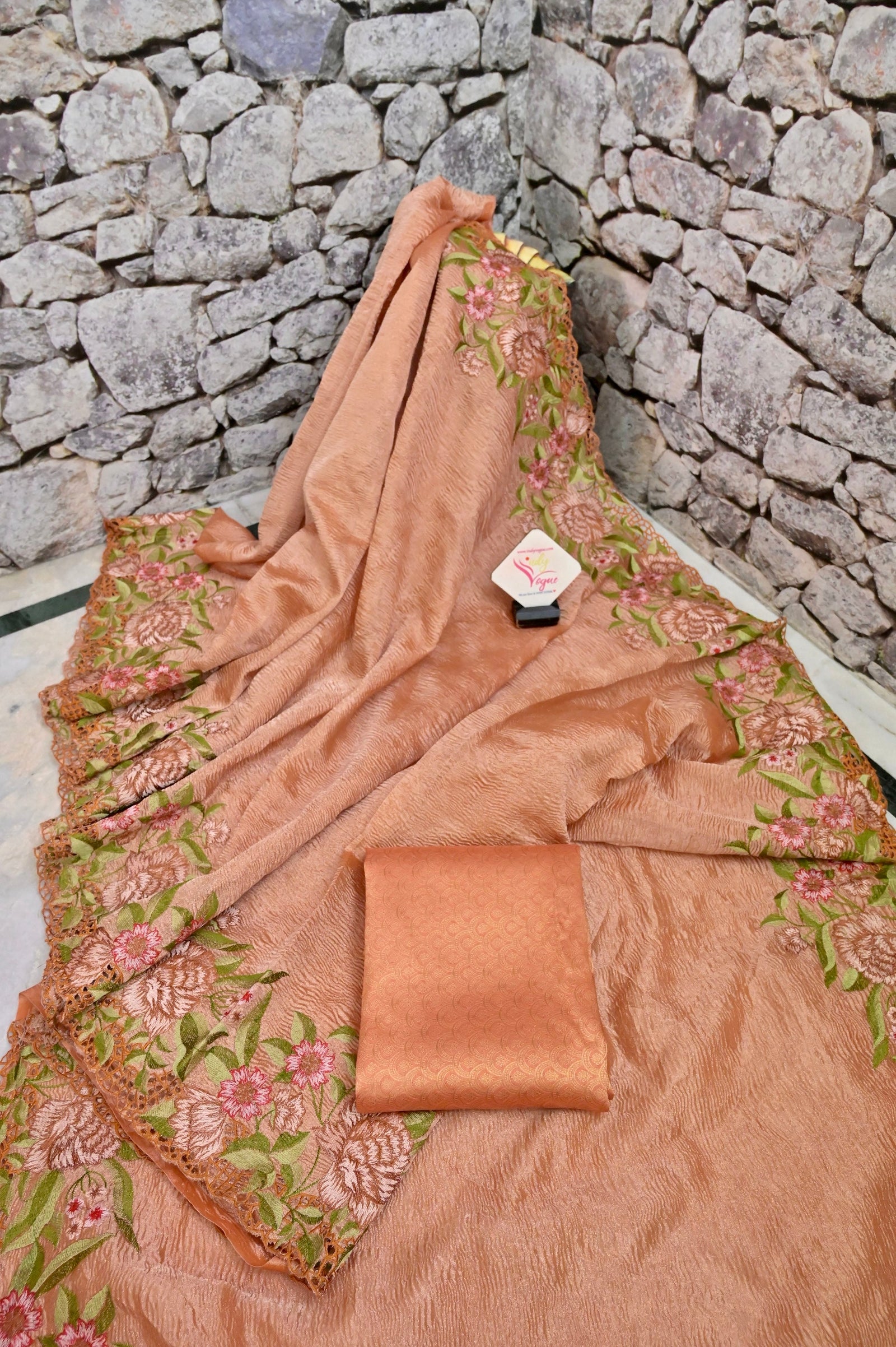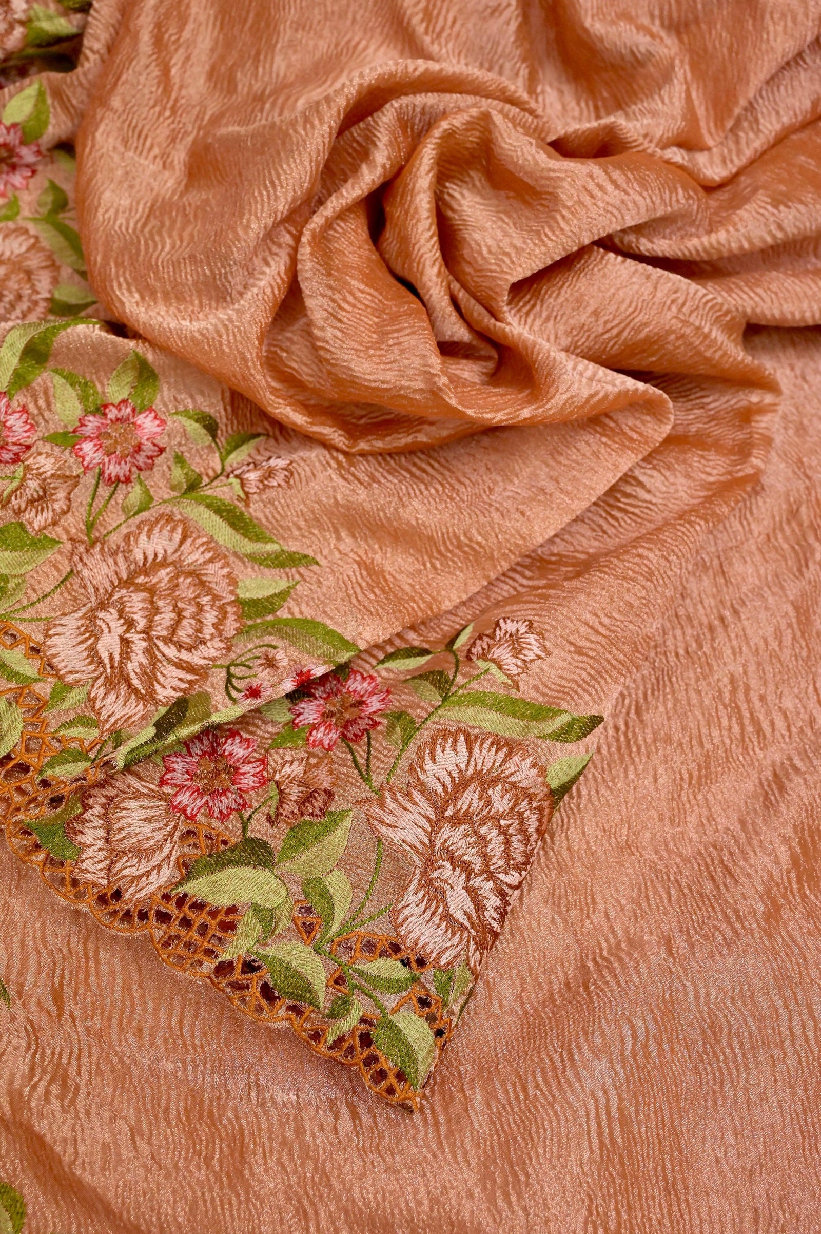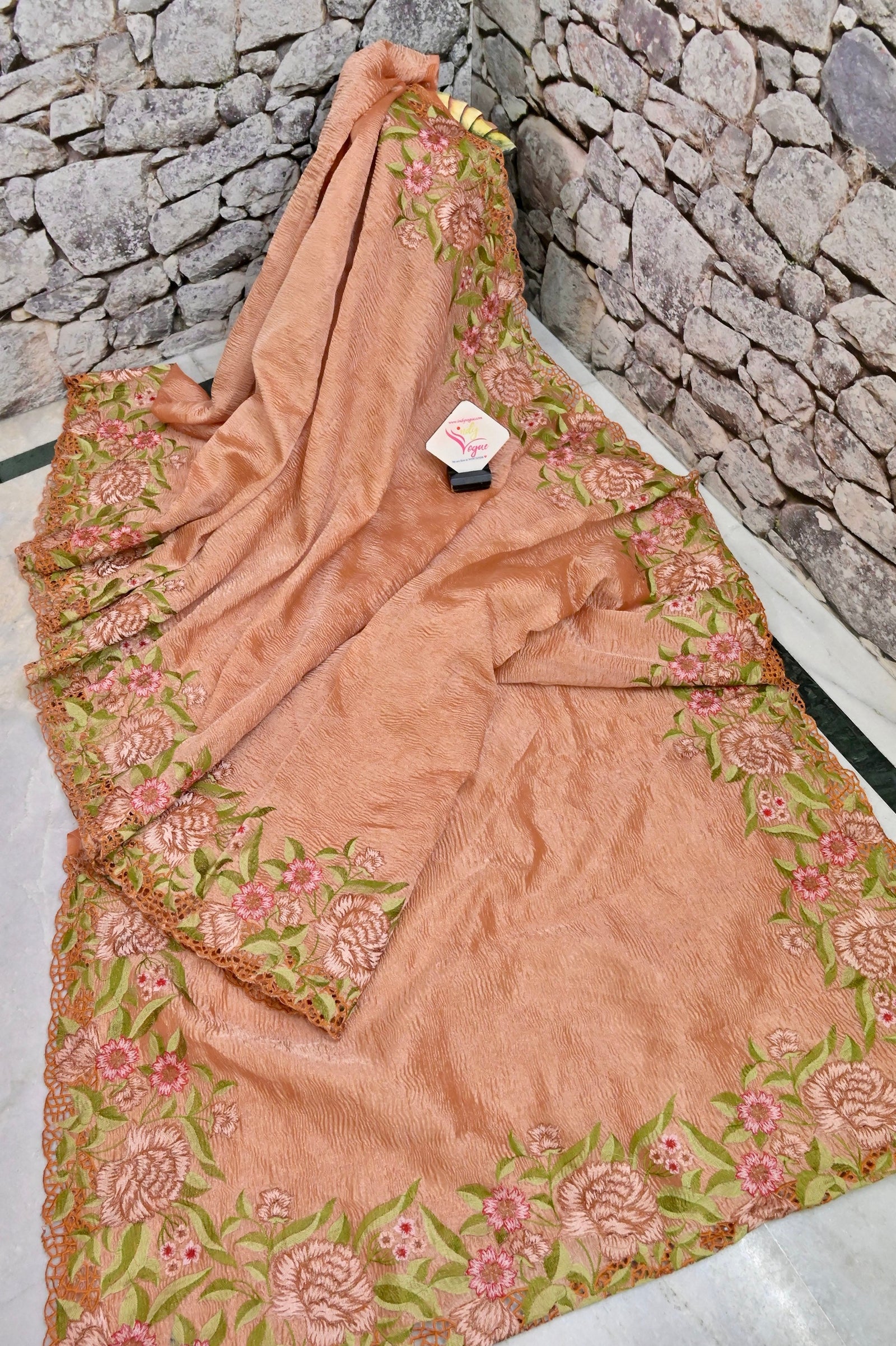 Blush Orange Color Crushed Tissue Silk Saree with Embroidery and Cutwork