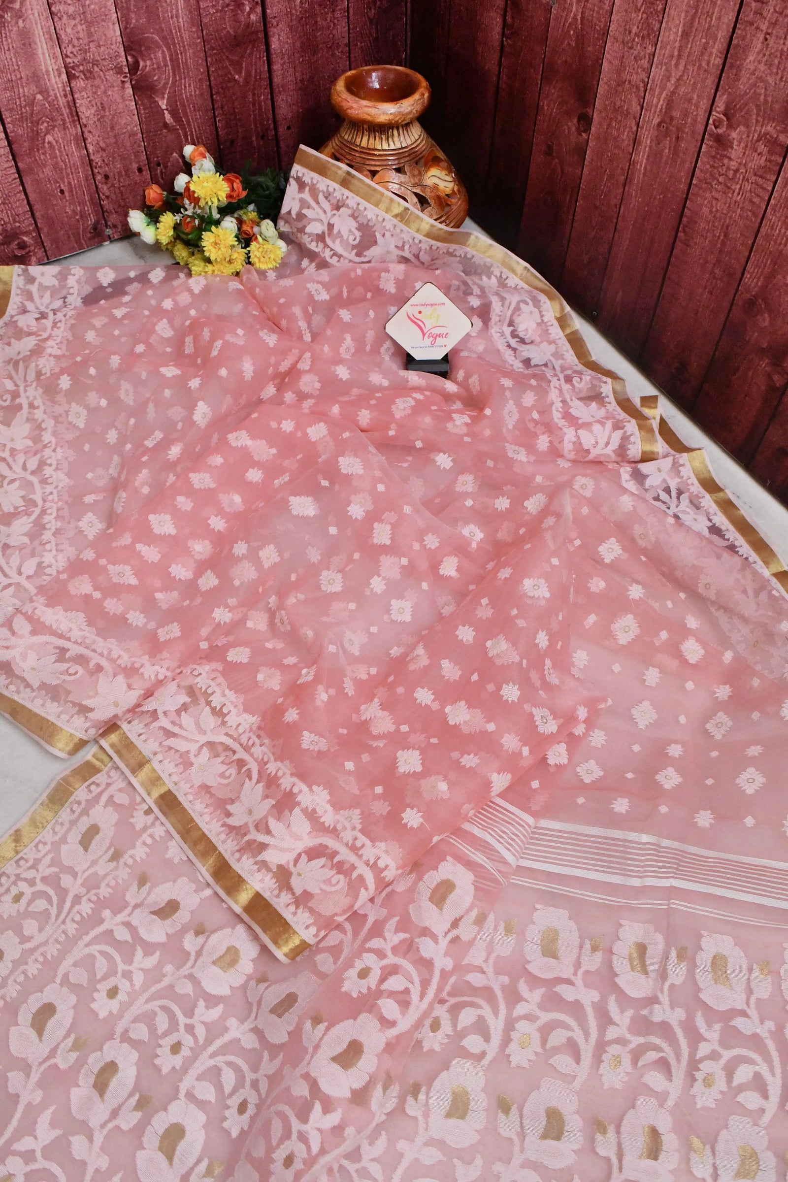 The fresh collection of jamdani with rich weaving of zari and pure jamdani weaving work with amazing finesse and enriching beauty. Buy this blush peach color heavenly collection only with us with a zari piping border.