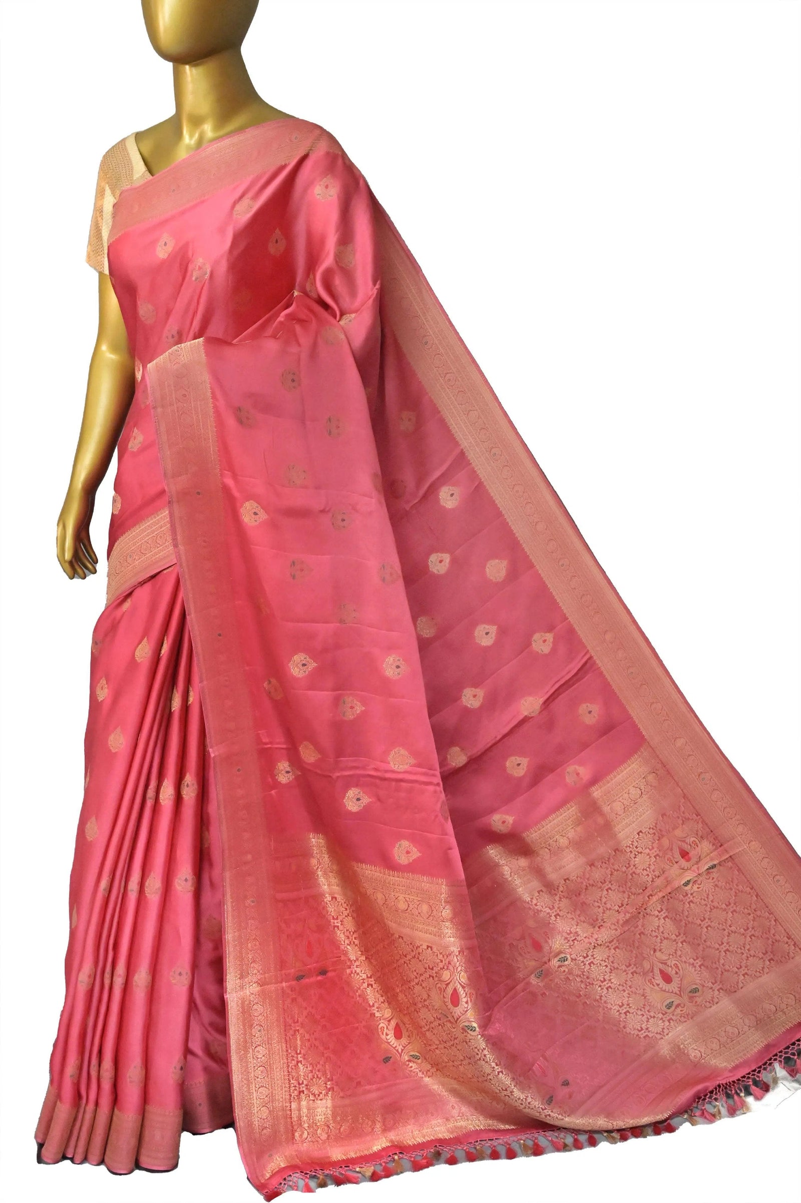 Shop a lightweight fabric called satin silk, to look sleek and elegant in any party or cocktails. This blush red-color Mashru banarasi saree is nestled with a golden zari work with a solid body in blush red and meenakari butta work on the body and the pallu.