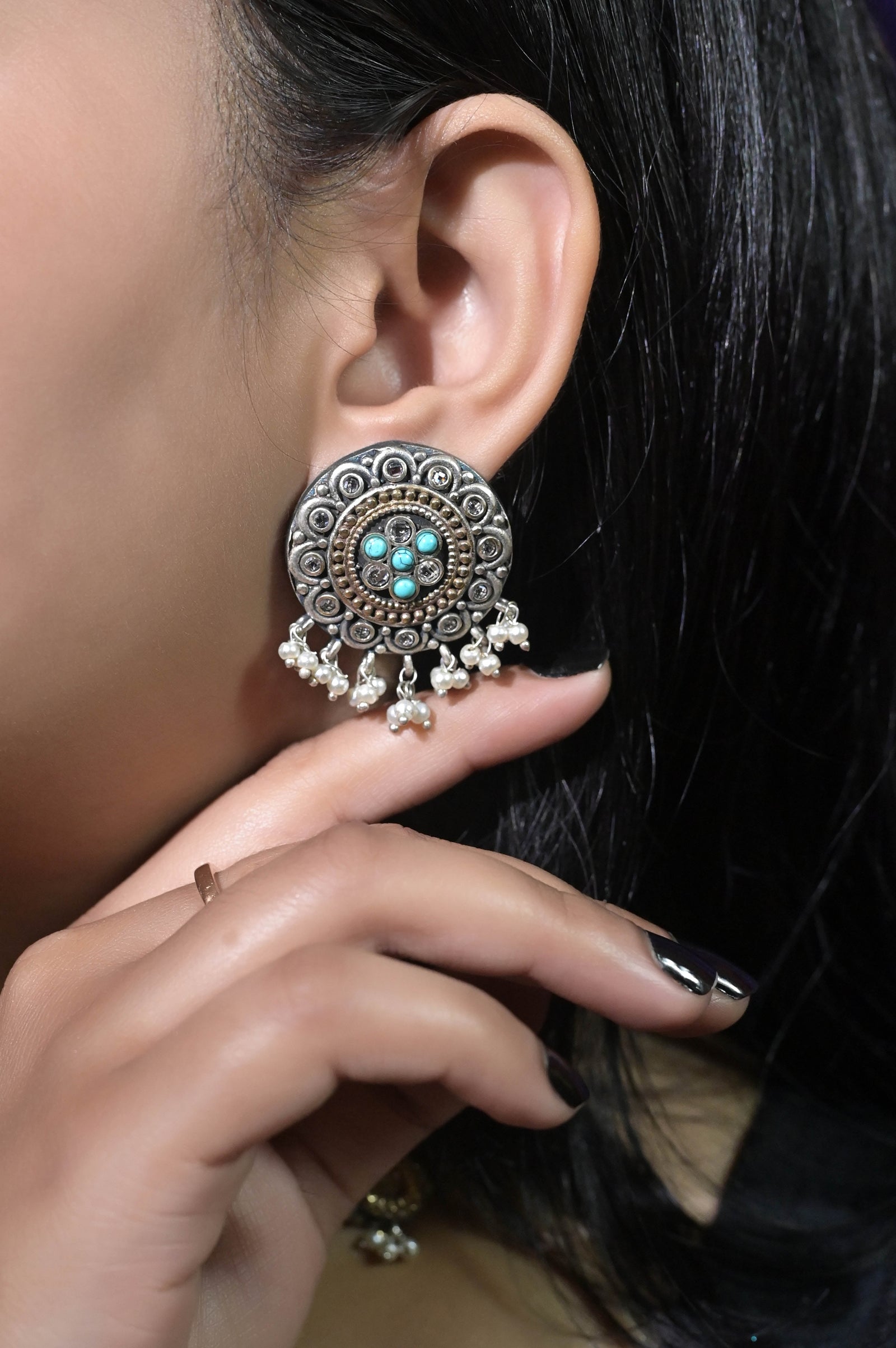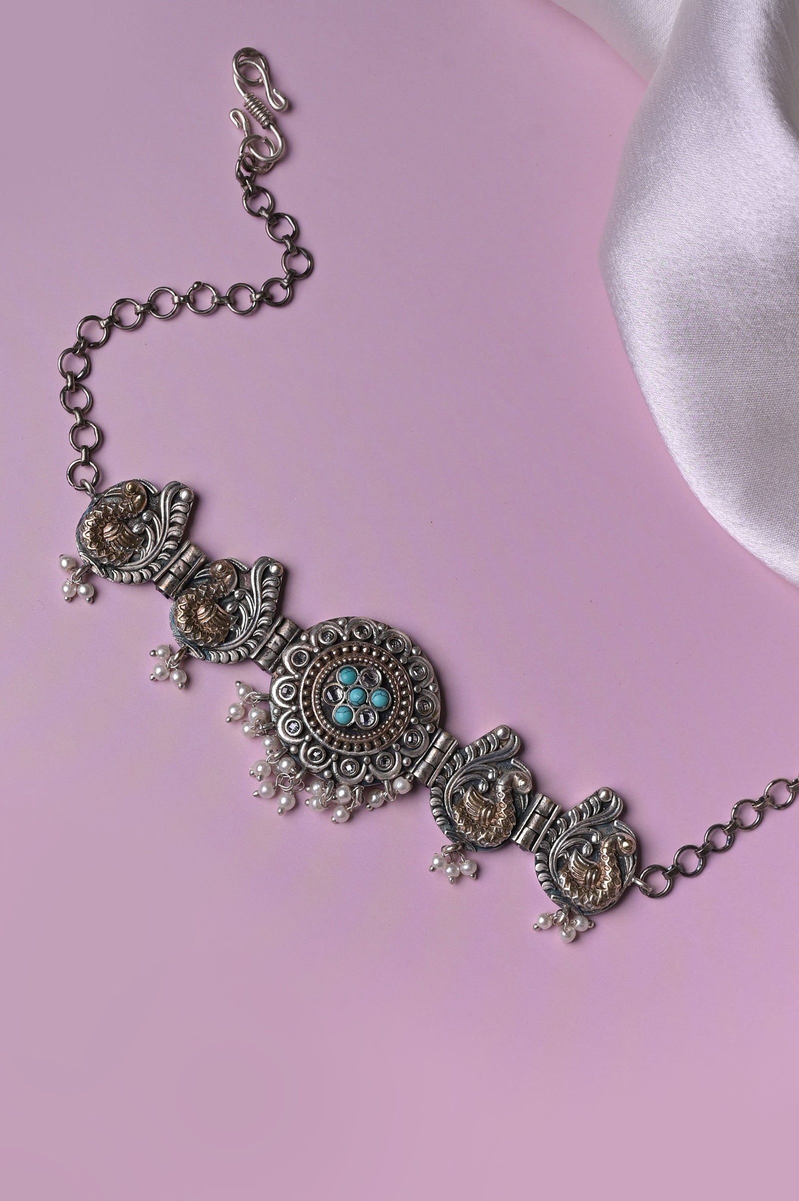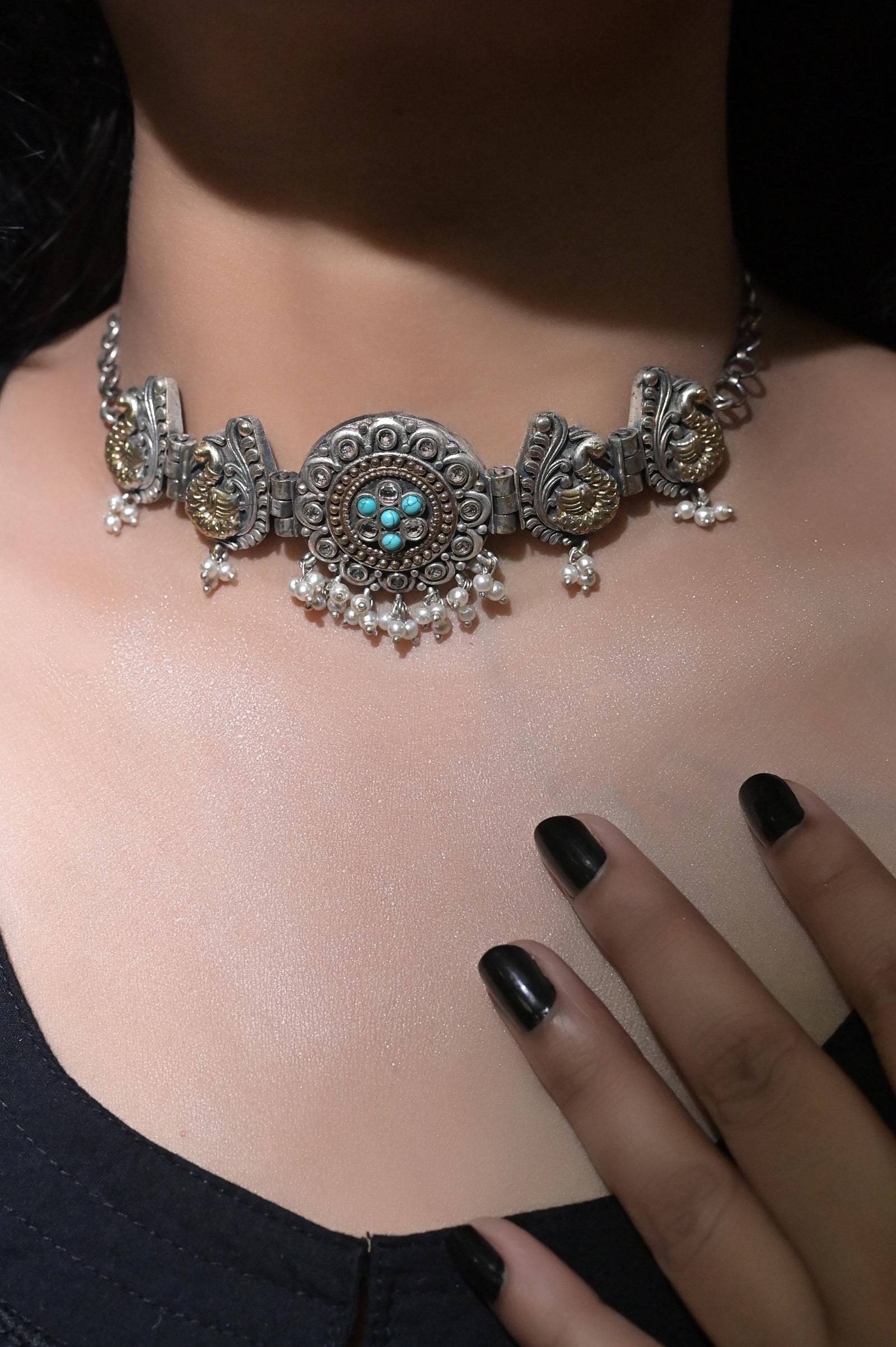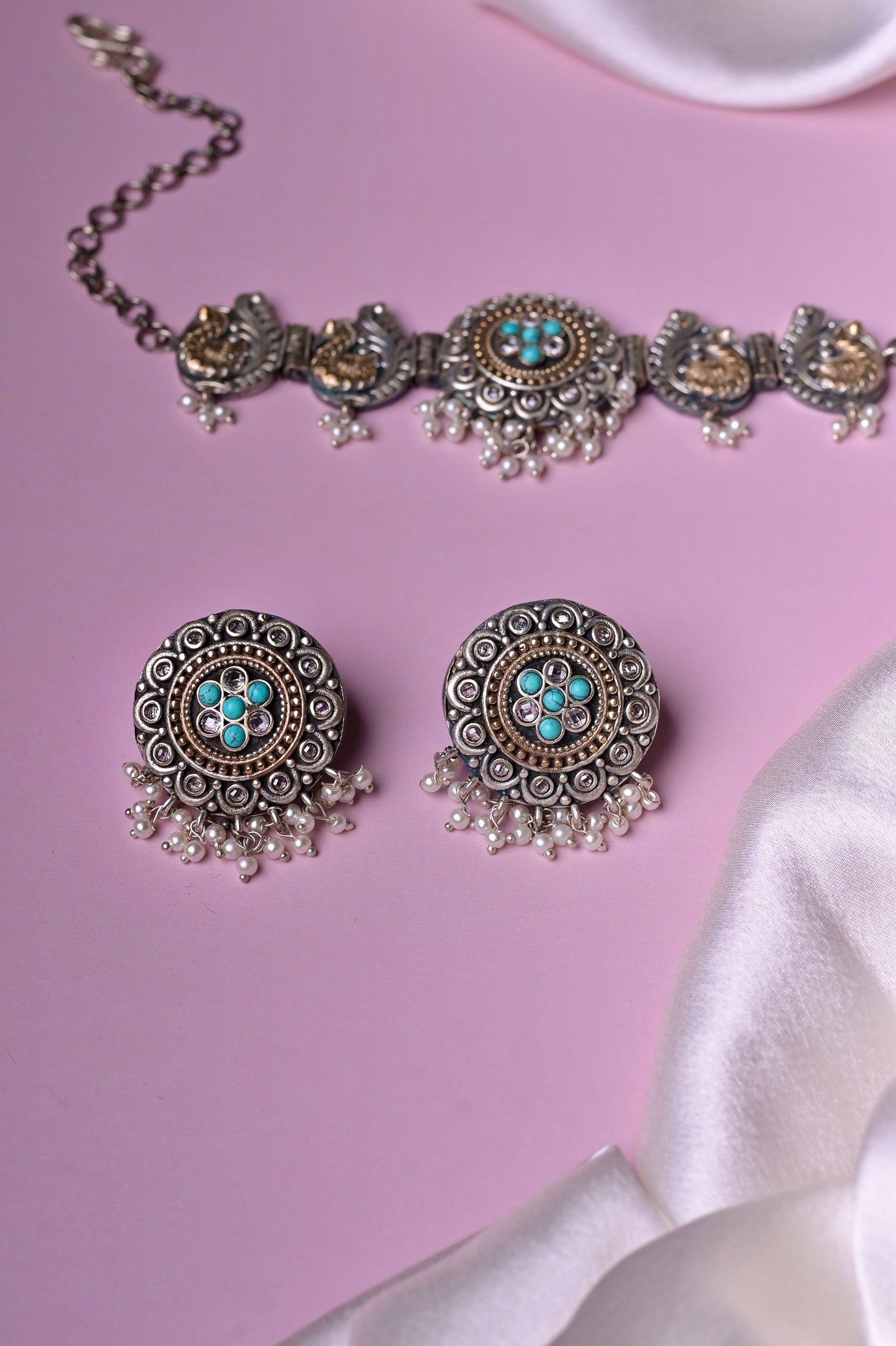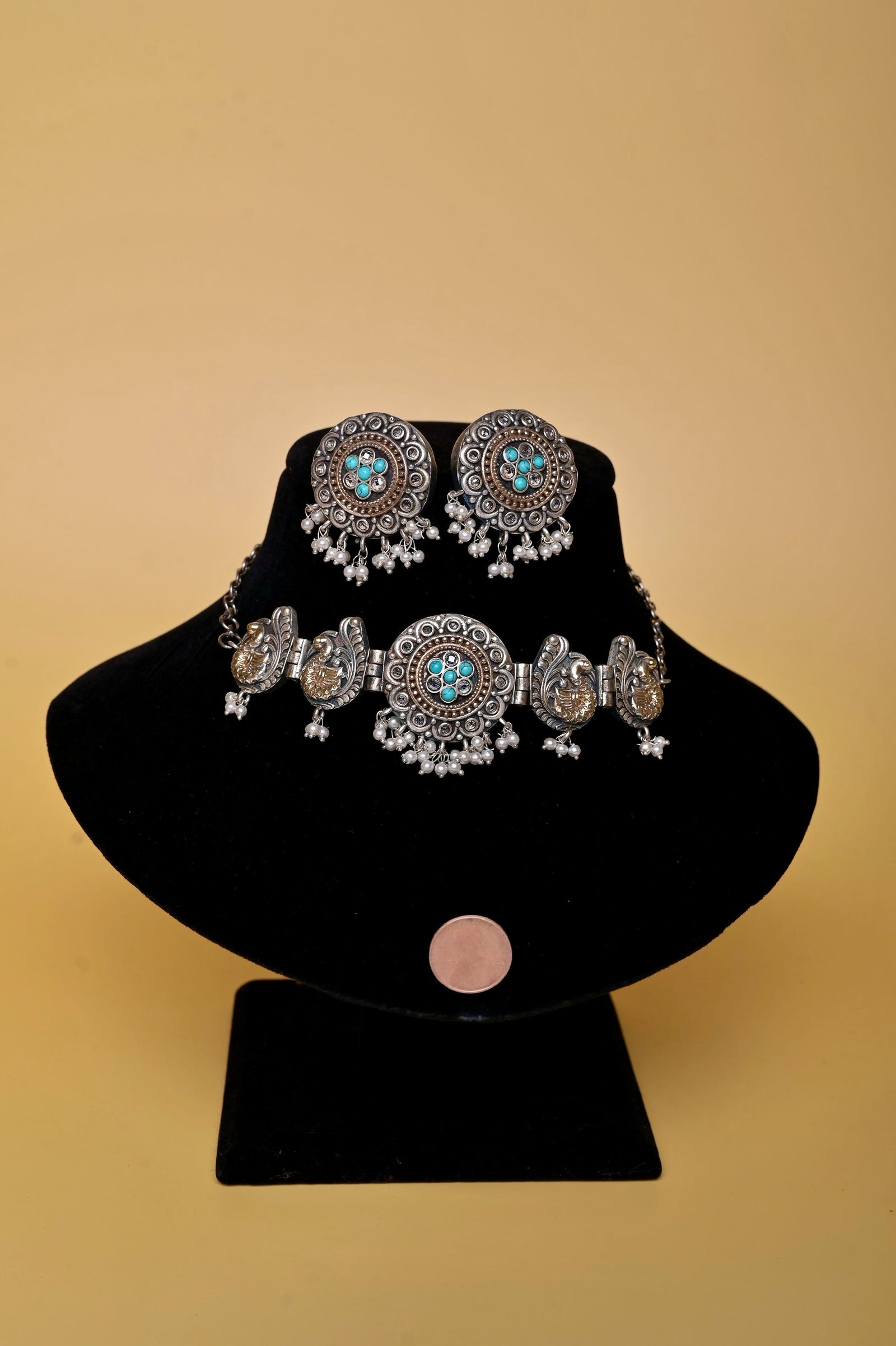 A silver and golden dual-tone shaded choker necklace set that brings all the gleam in your eyes to shine and spread the aura of your beauty in all true forms. A boho-style beauty comes with matching jharokha earrings studded with lapis lazuli. The penny is kept by the side to help you understand the size of the product.