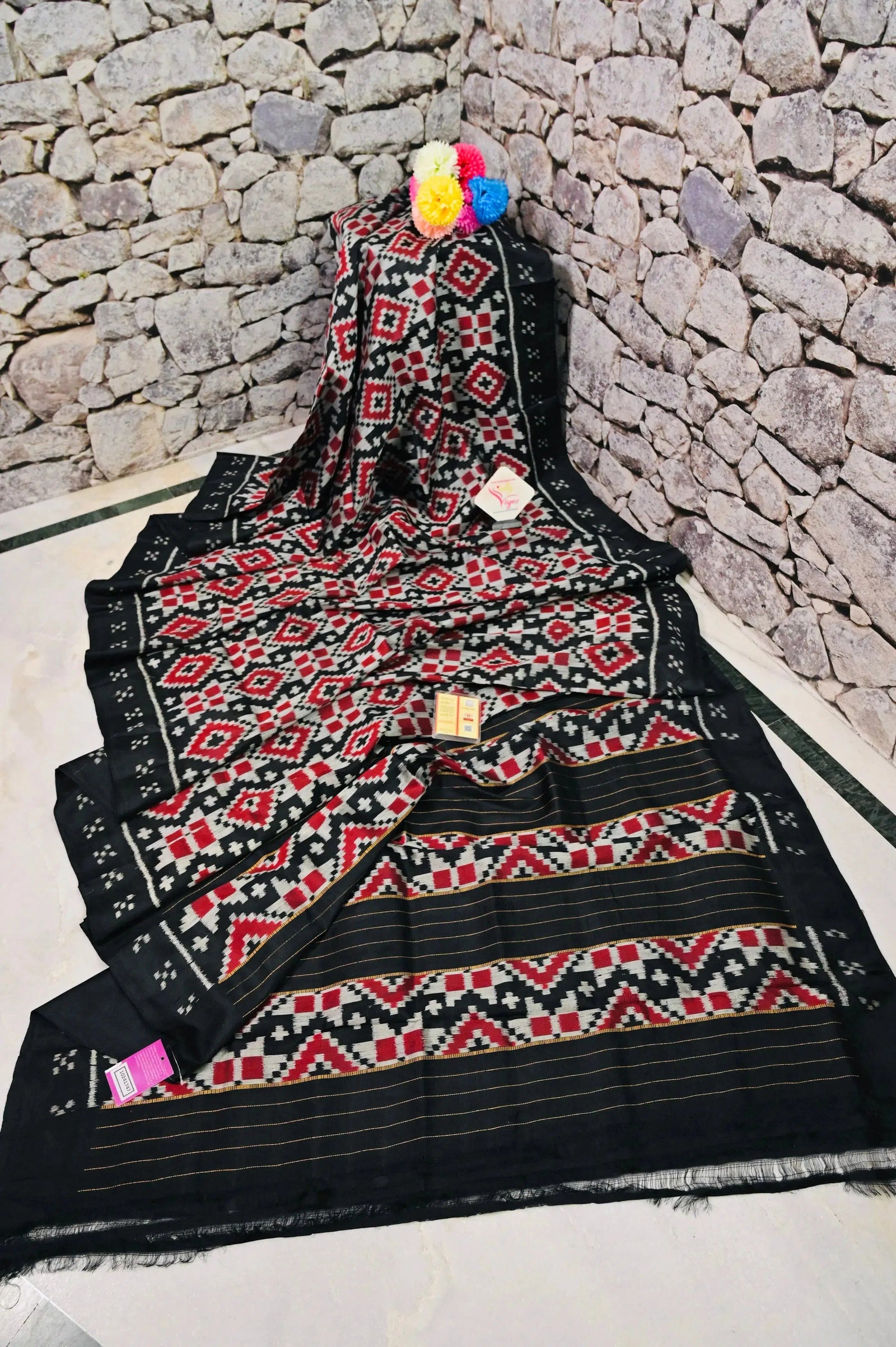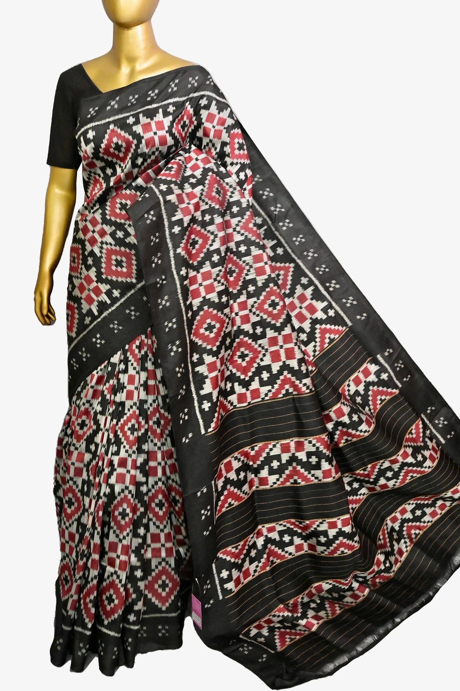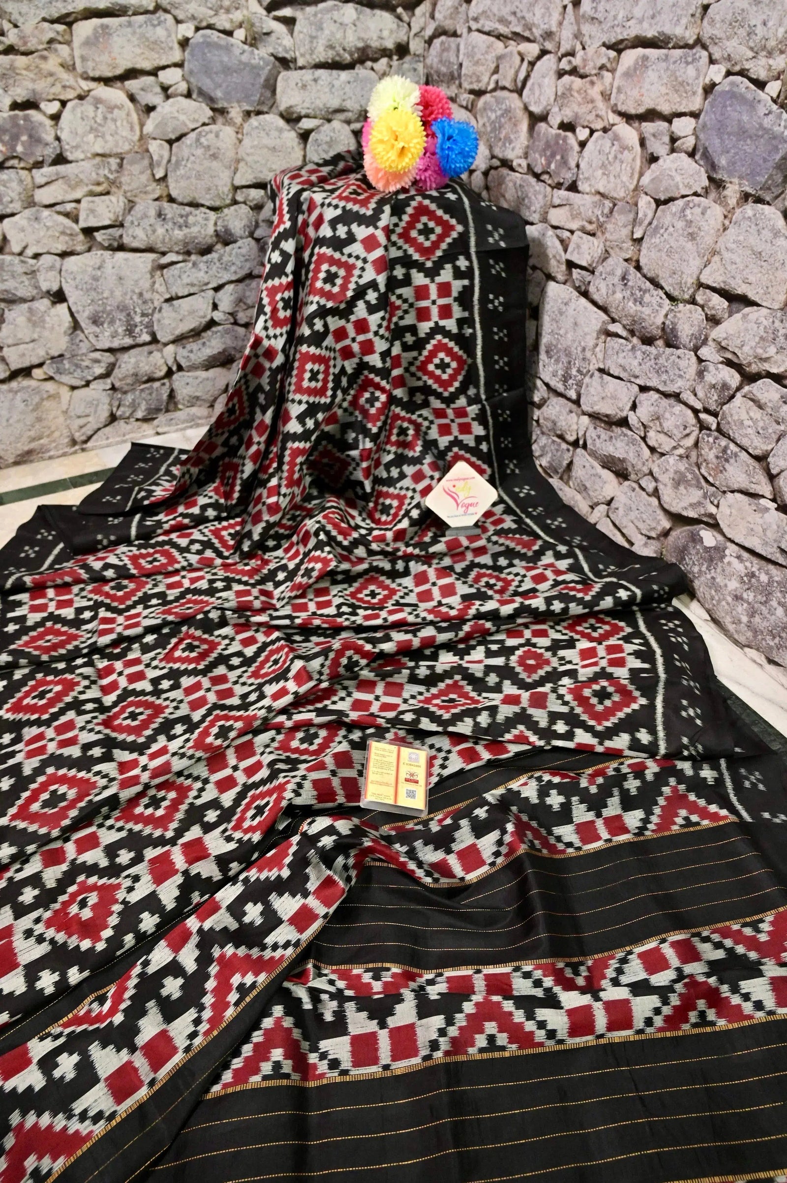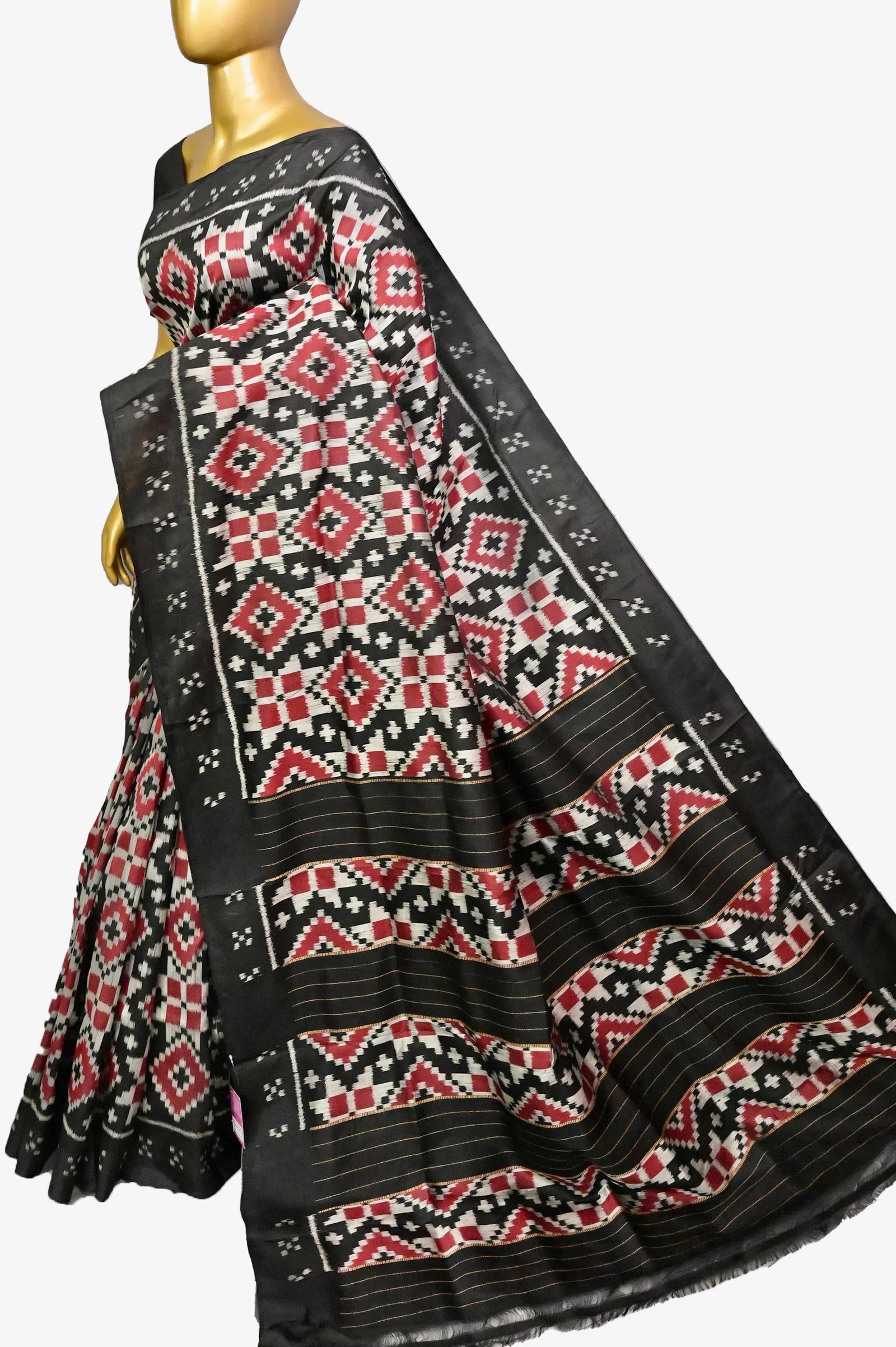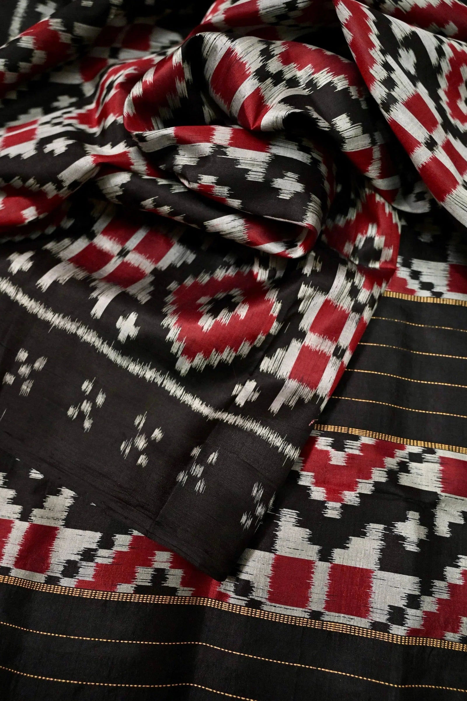 Bold Black Traditional Telia Rumal Sambalpuri Ikat Silk Saree with Grey and Red Weaving