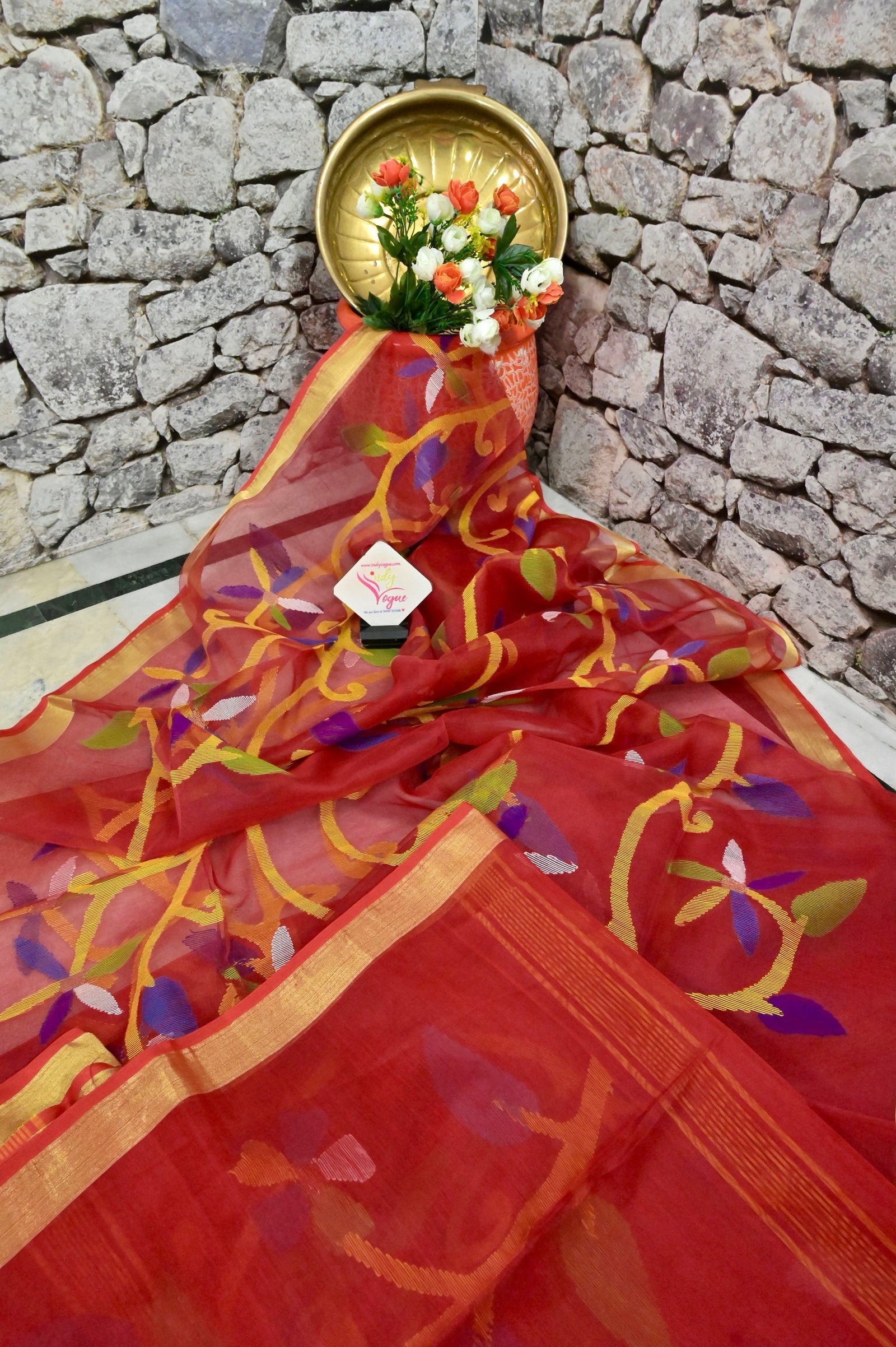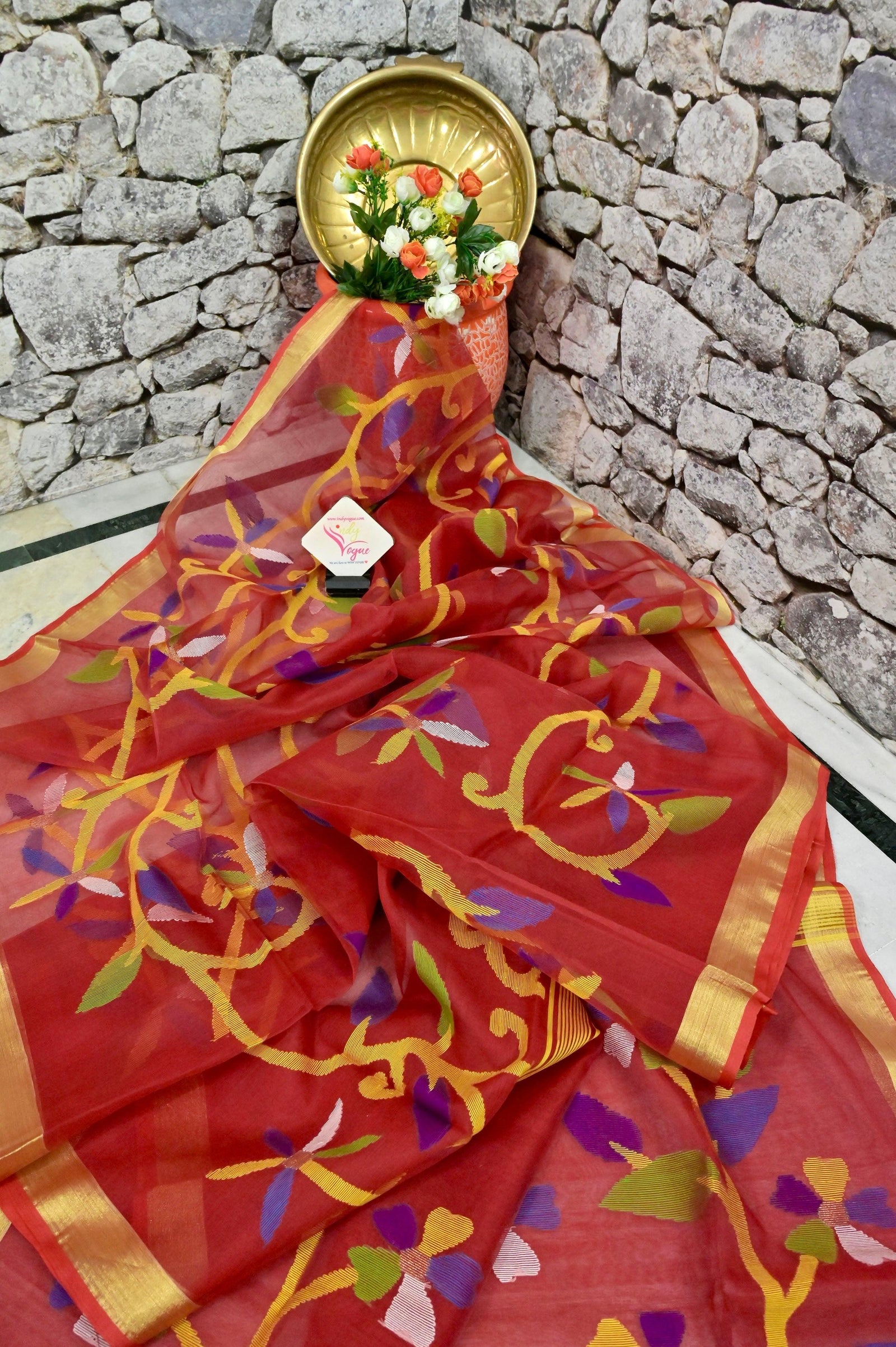 Create a subtle style statement with a variety of brick red muslin sarees that have all-over jamdani weaving done in a floral pattern with multiple colors to complement its look. Also has a zari-defined border to complete the look.