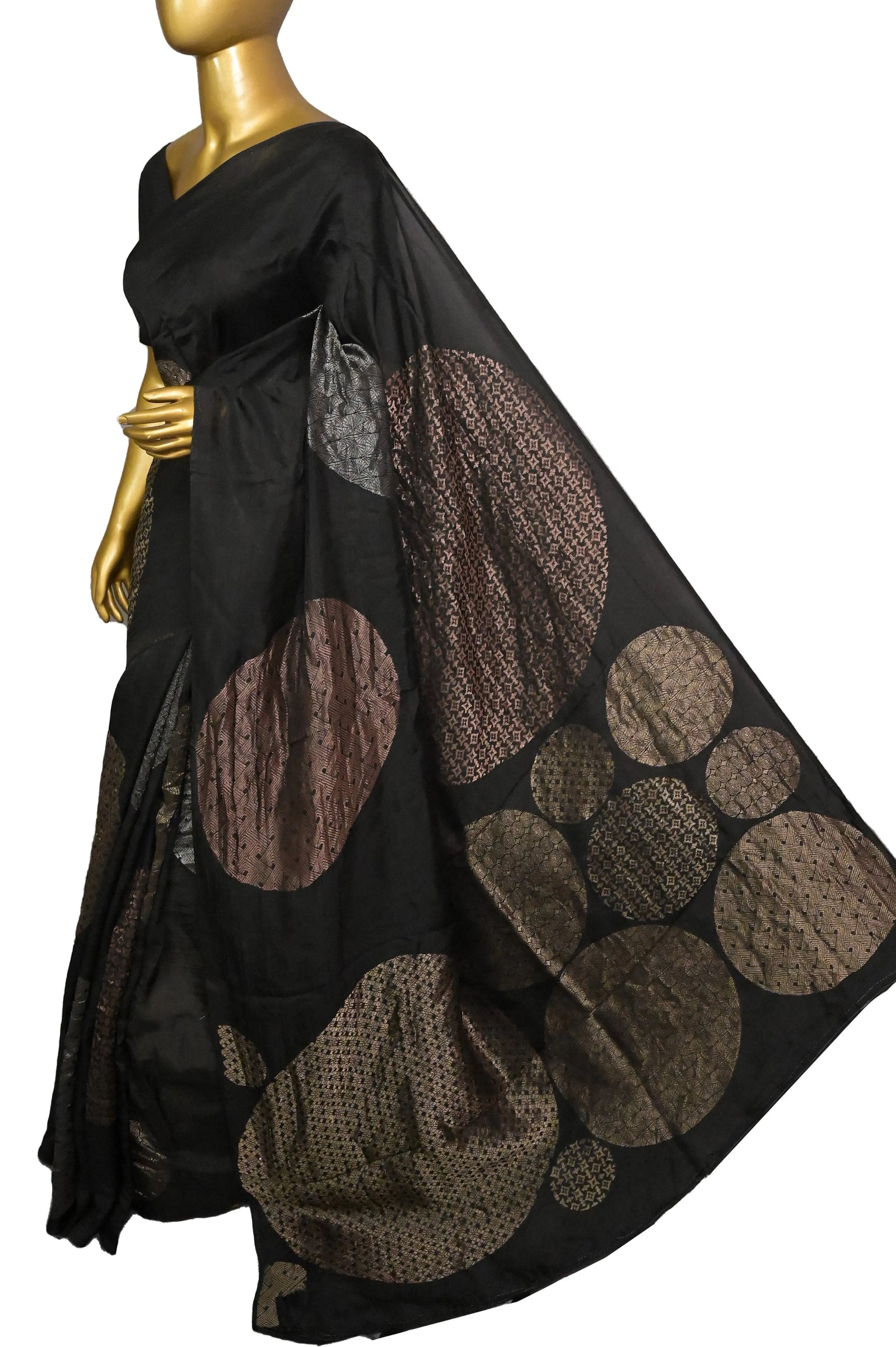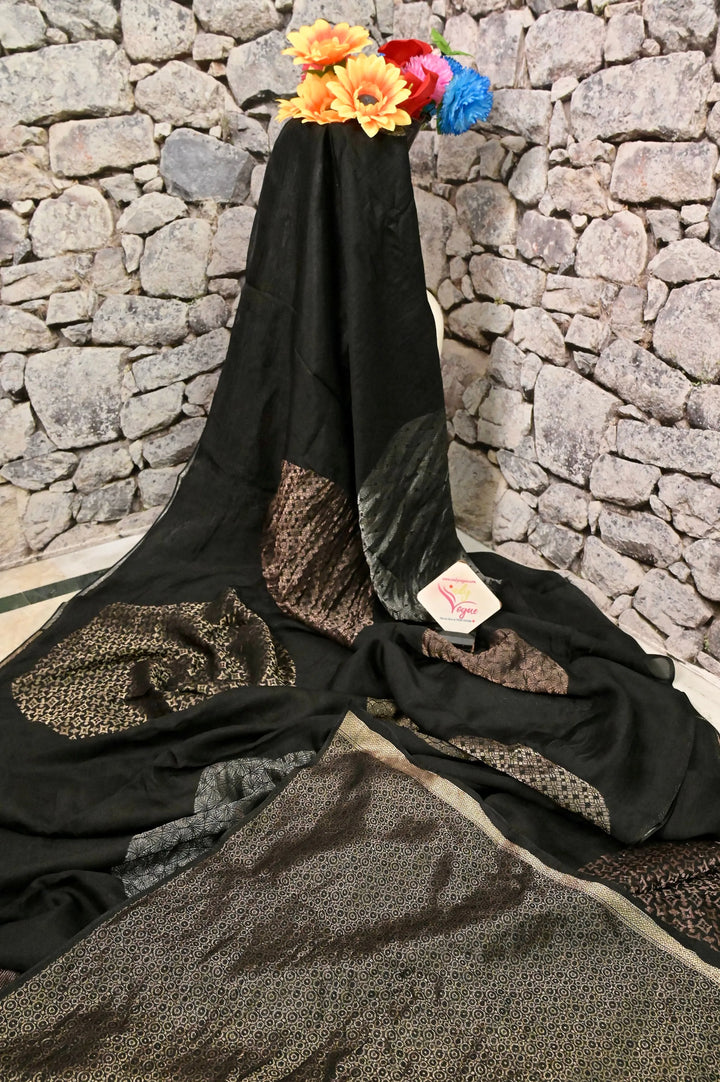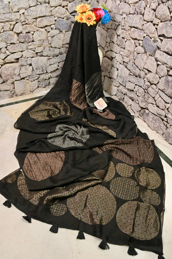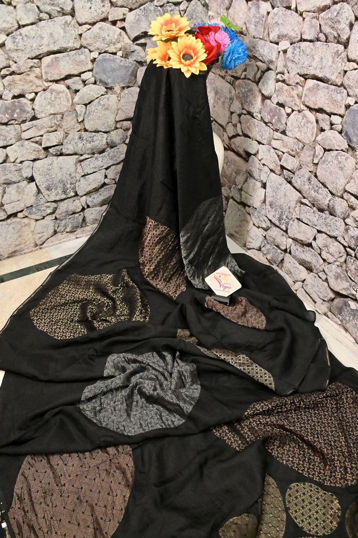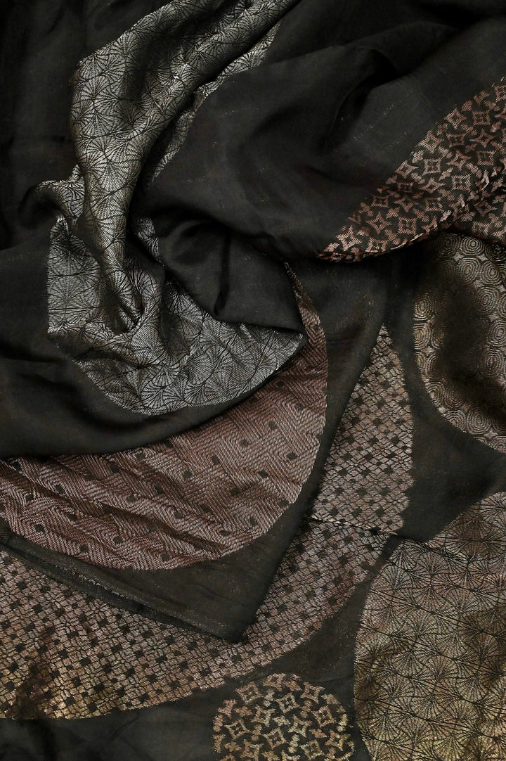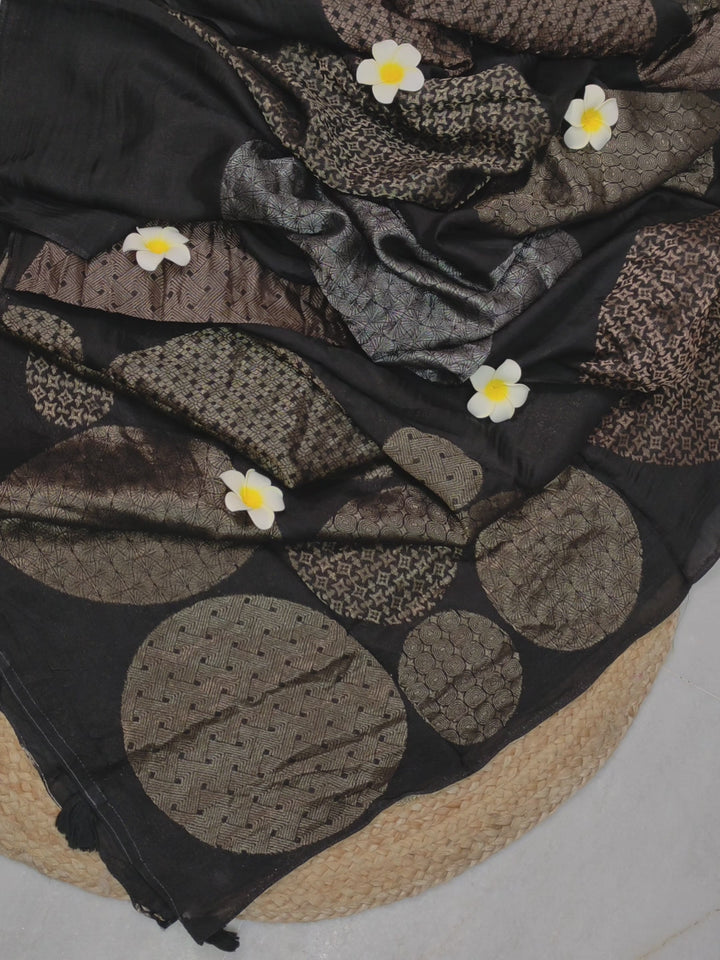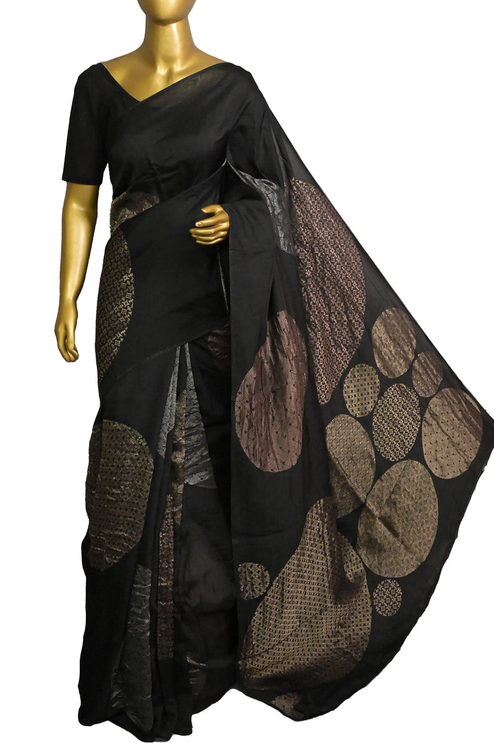 Chanderi Silk Saree in Black Color with Golden and Silver Zari Weaving with Brocade Blouse Piece
