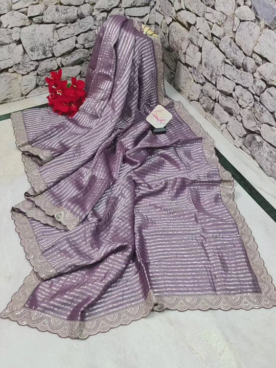 - Comes with an elegant sheen in dusty lavender color with an all-over silver zari stripe design
