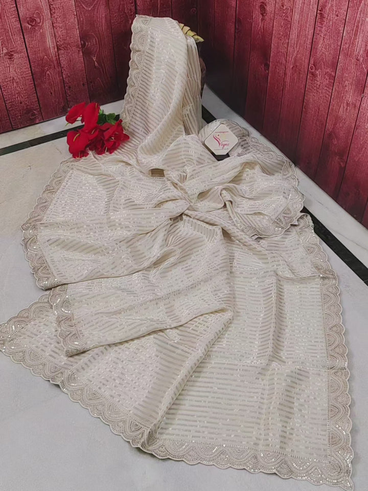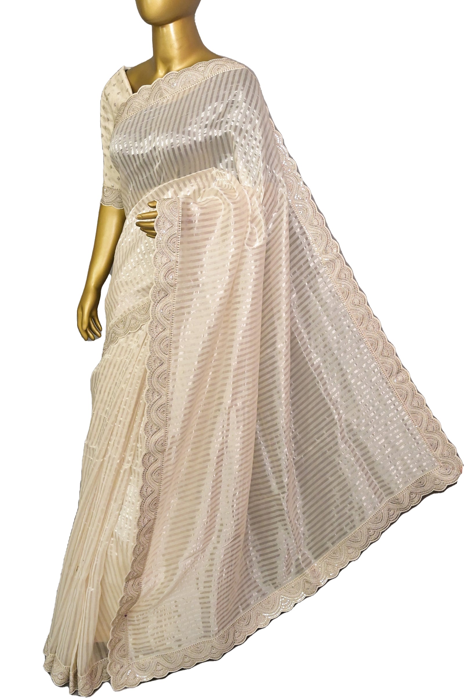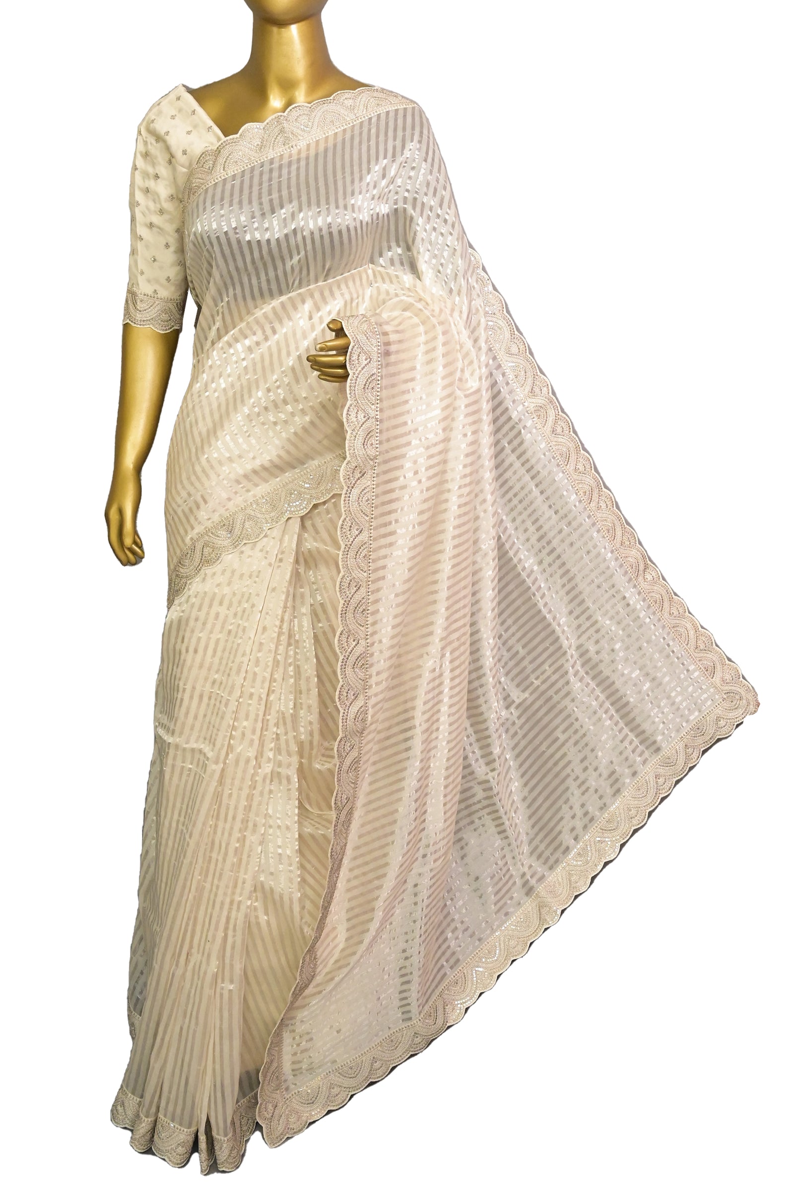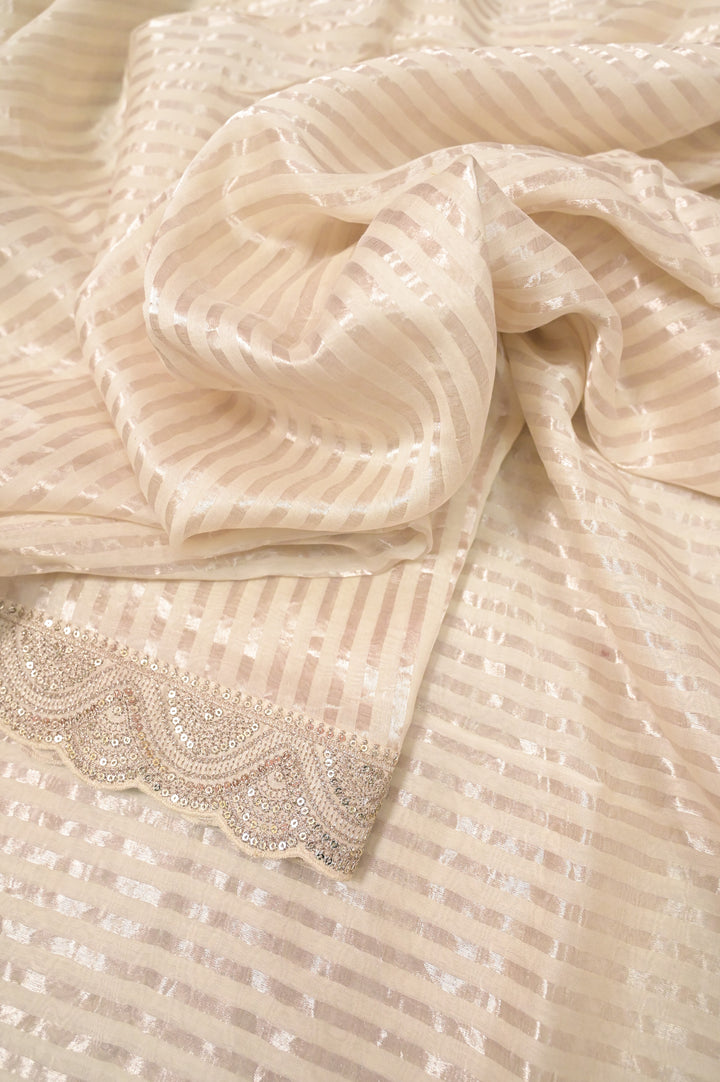 - Comes with an elegant sheen in offwhite color with an all-over silver zari stripe design