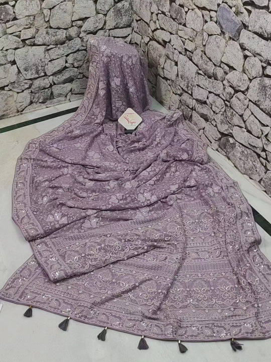 Chikankari Georgette Saree in Dusty Lavender Color and Sequin Embroidery with Piping Work
