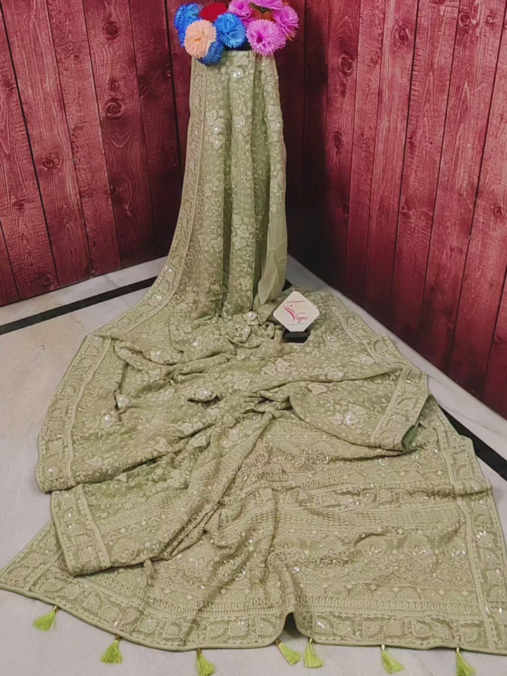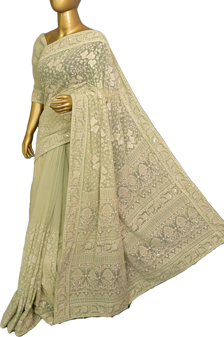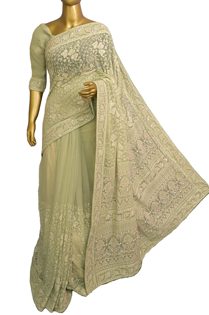 Chikankari Georgette Saree in Light Cardamom Green Color and Sequin Embroidery with Piping Work