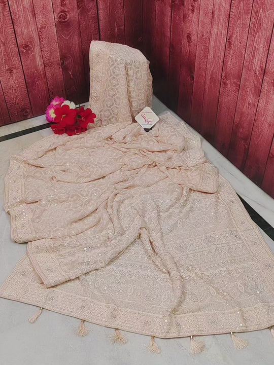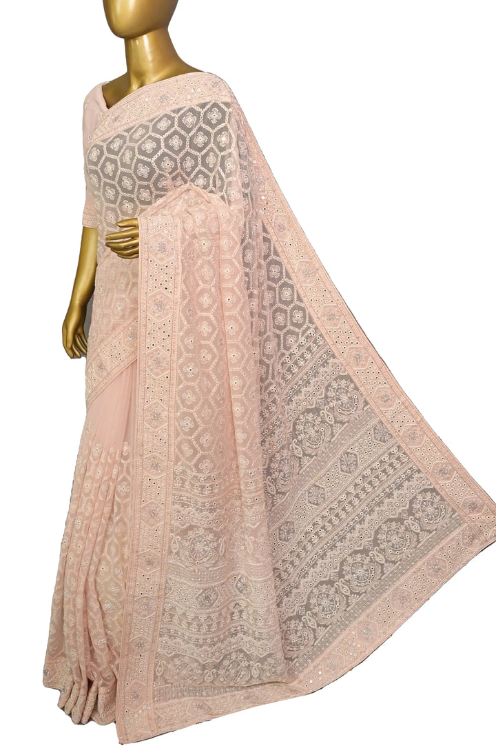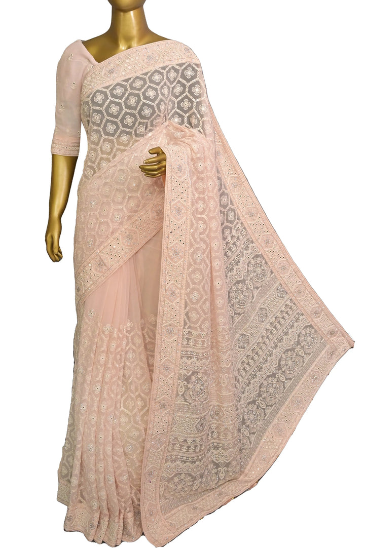 Chikankari Georgette Saree in Light Peach Color and Sequin Embroidery with Piping Work