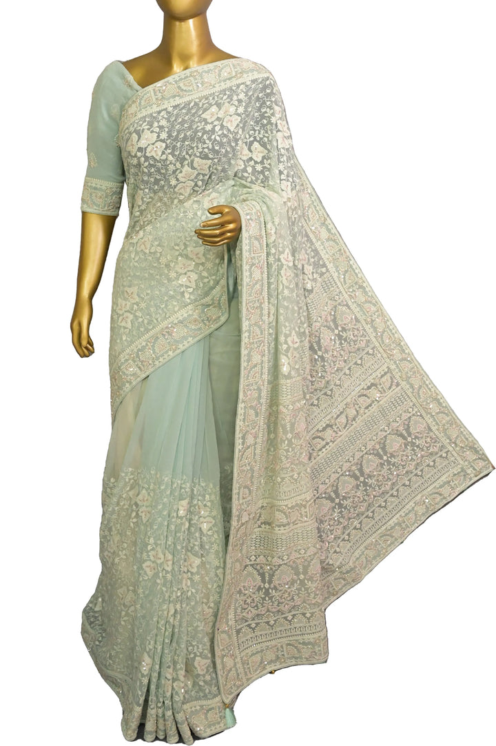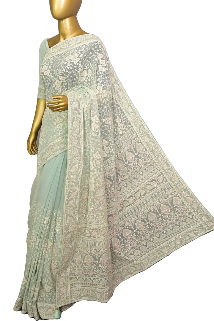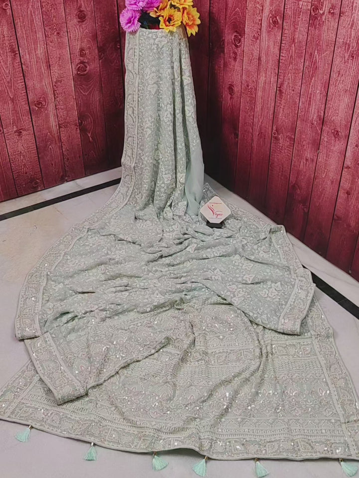 Chikankari Georgette Saree in Pista Green Color and Sequin Embroidery with Piping Work