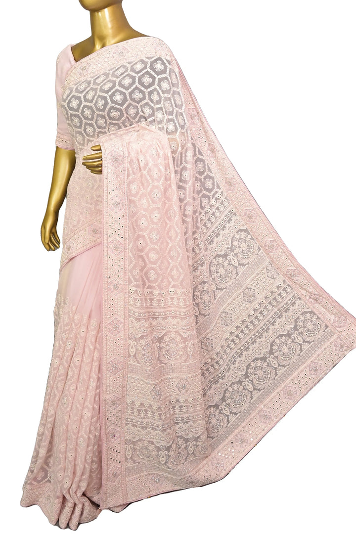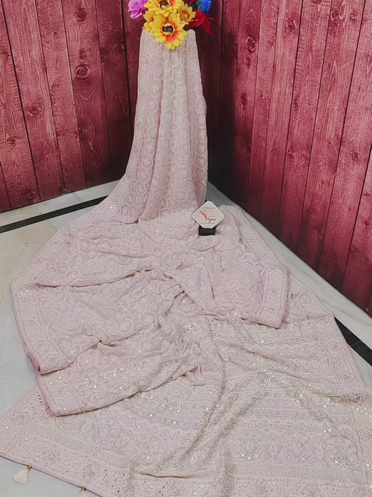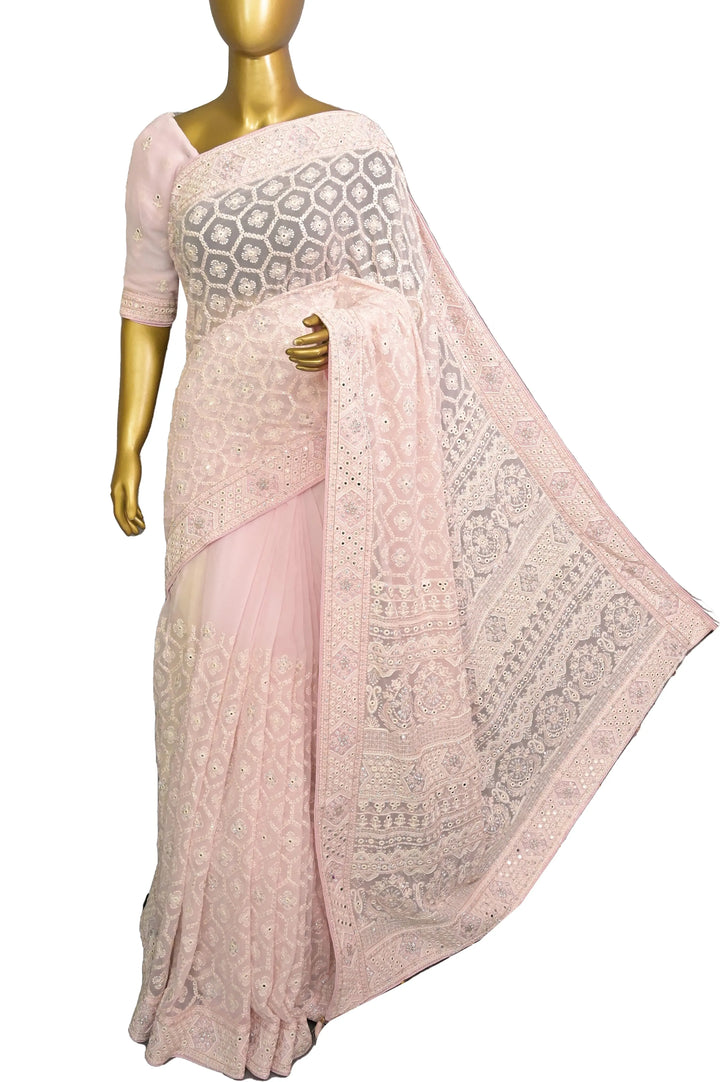 Chikankari Georgette Saree in Soft Pink Color and Sequin Embroidery with Piping and Mirror Work