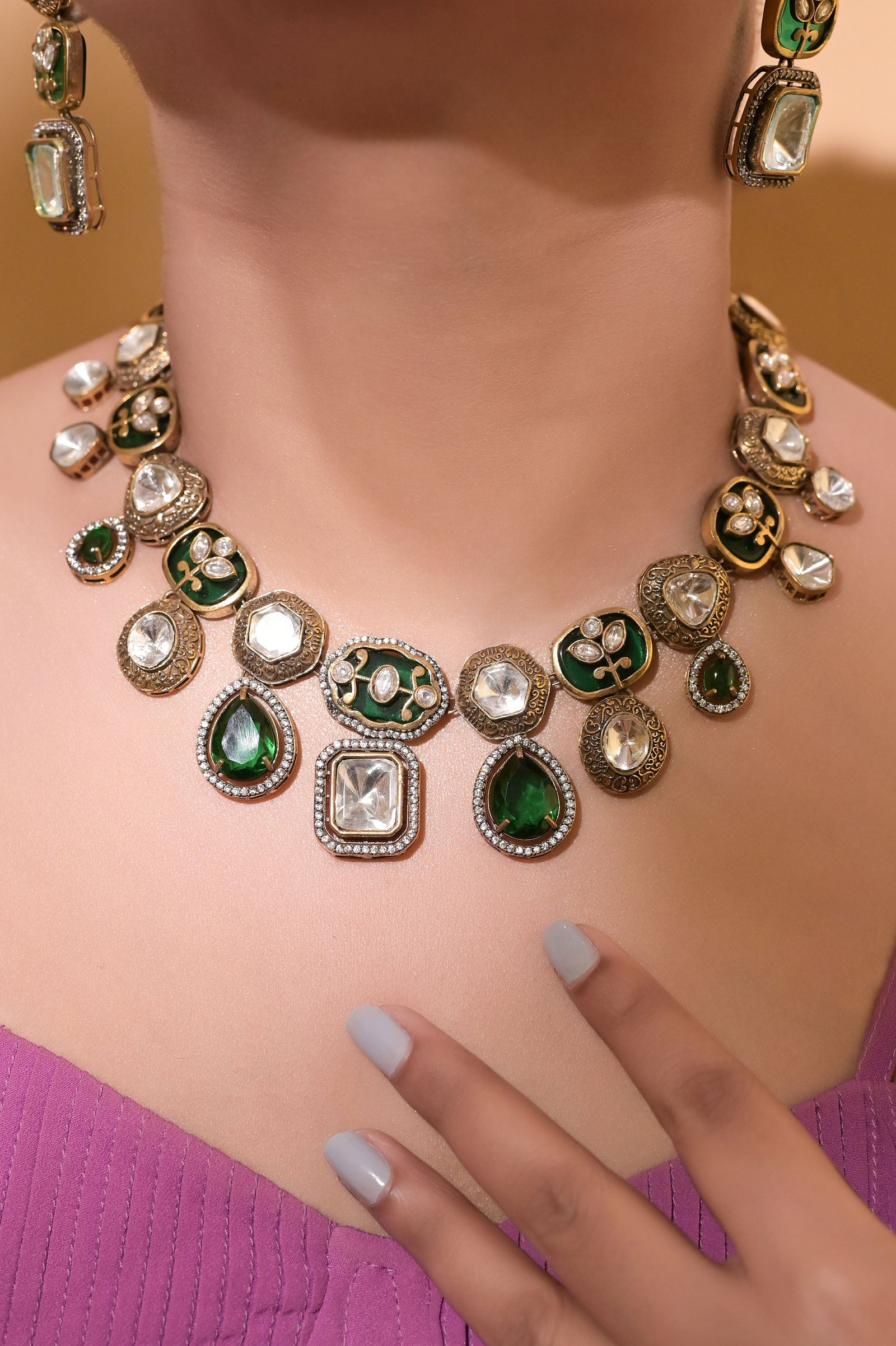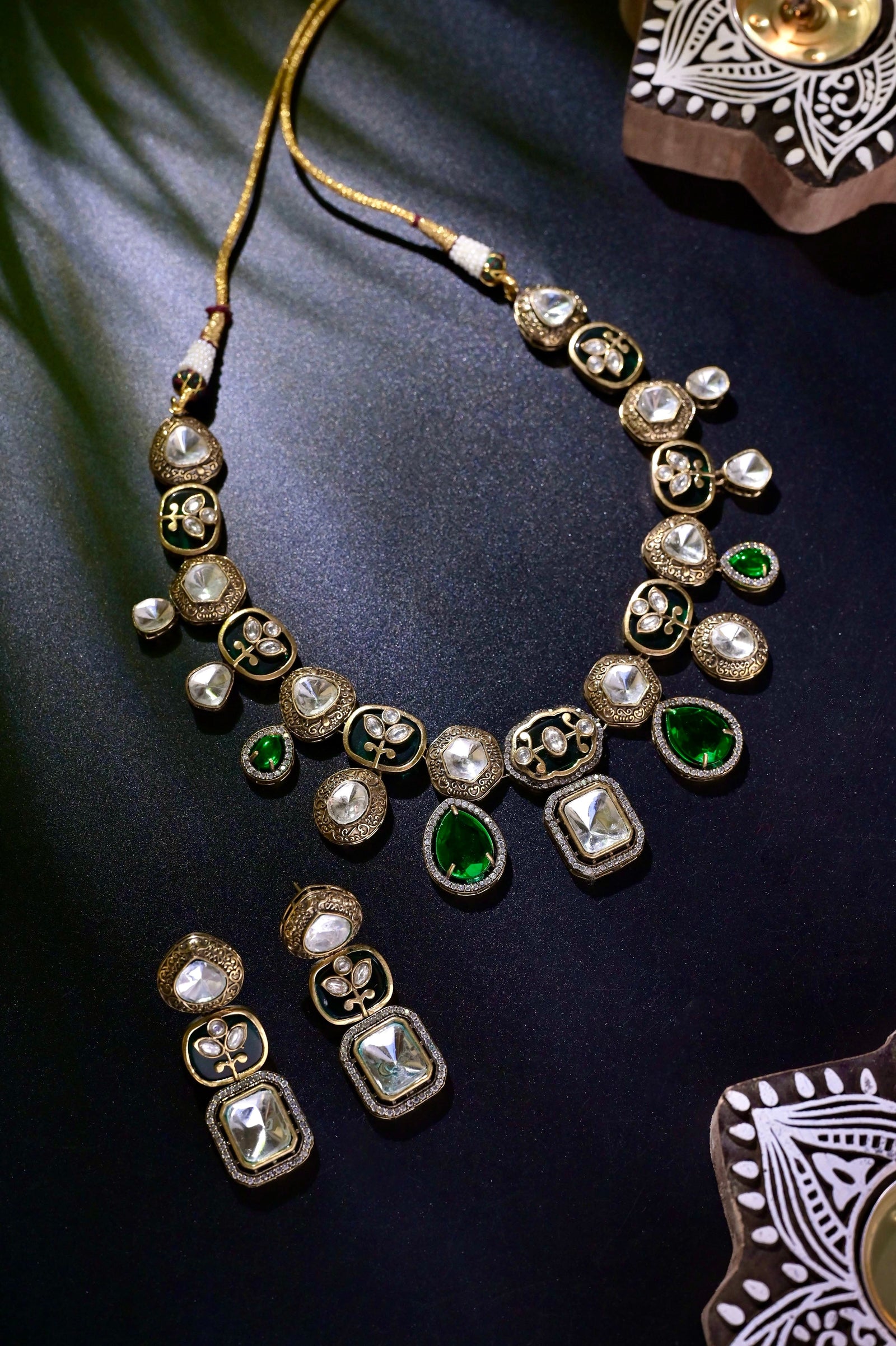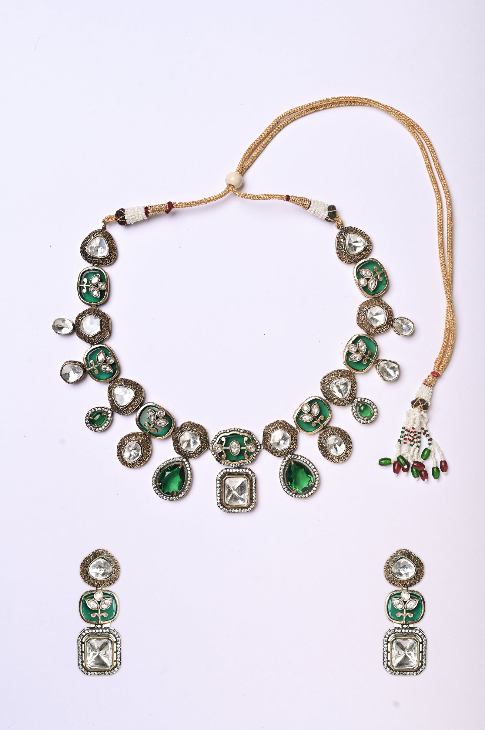 Just reel the head of your admirers with a new-age necklace set finish and emblem with pillar earrings also comes in curved AD stone and polki design to make it more regal. The penny is kept aside to show the real size of the product.