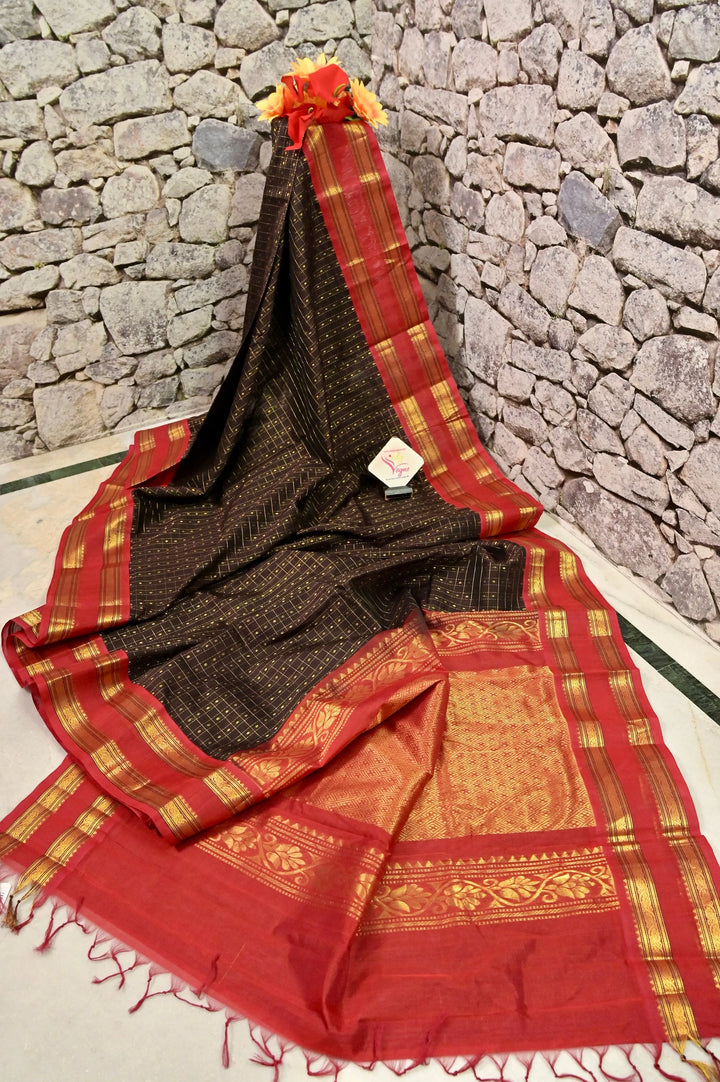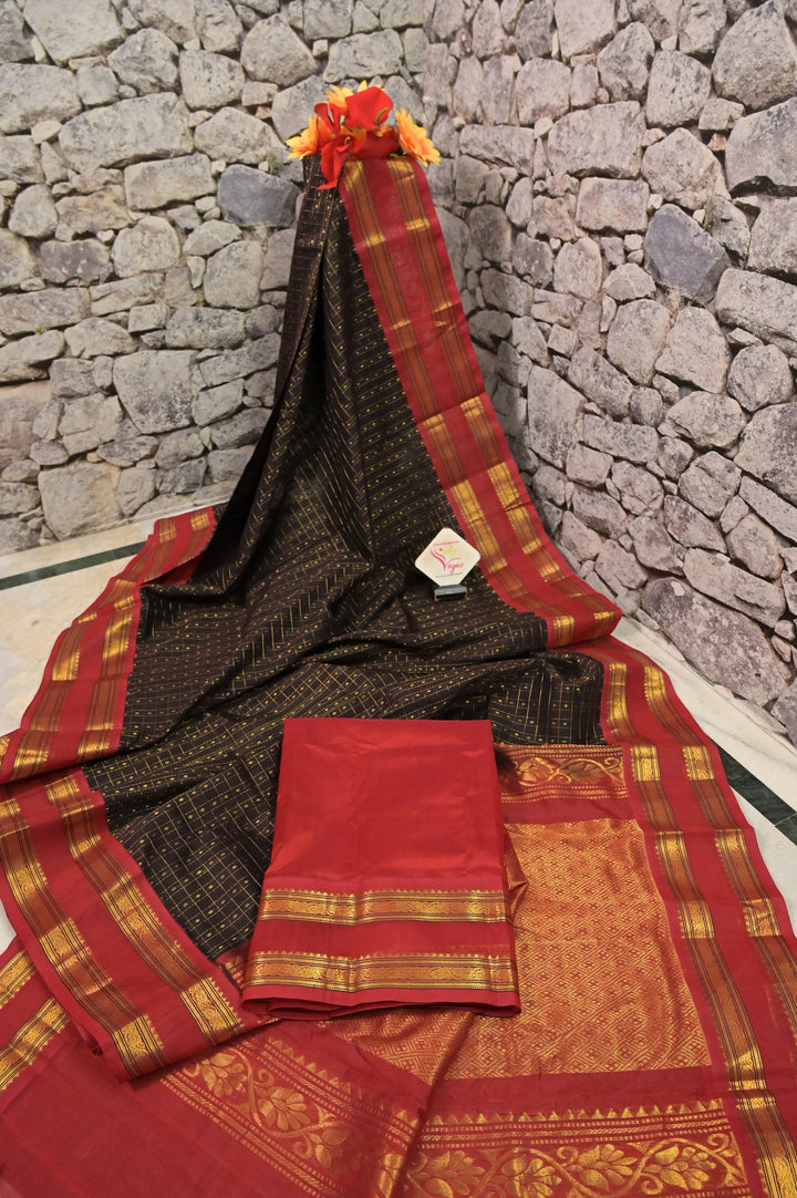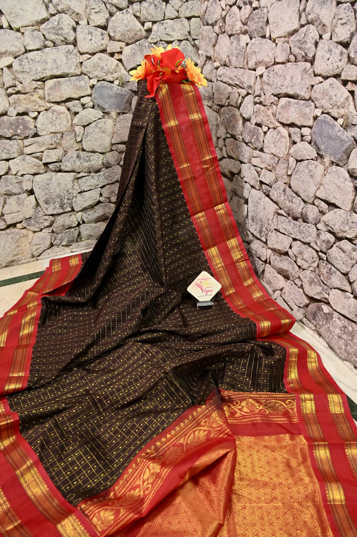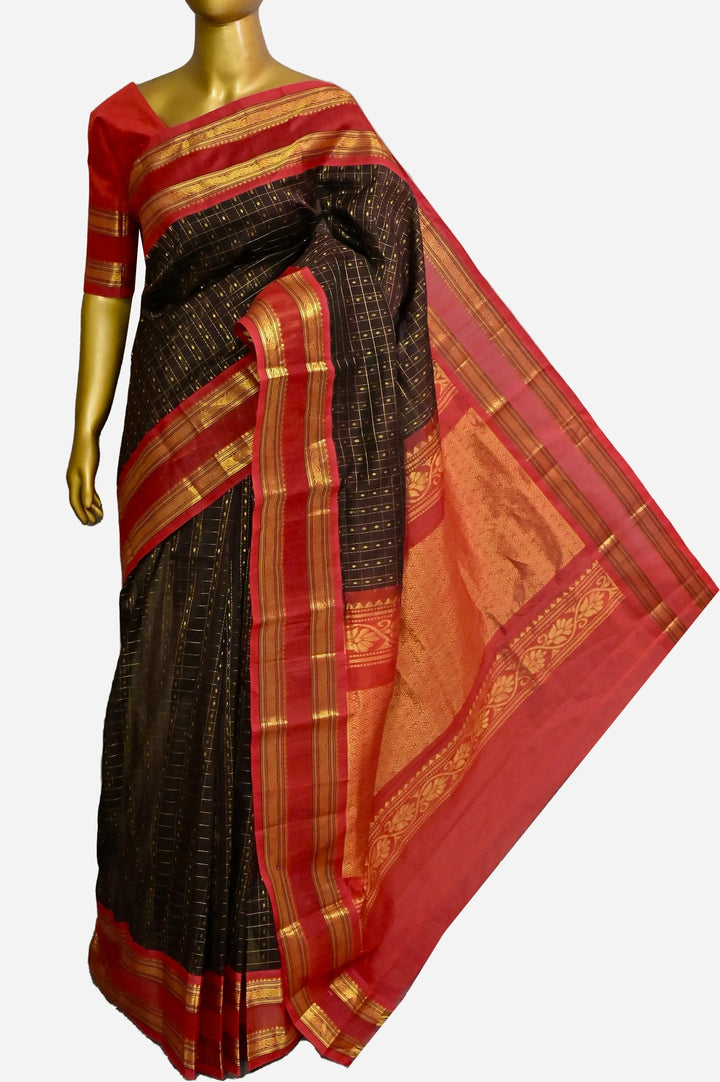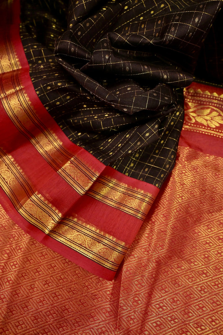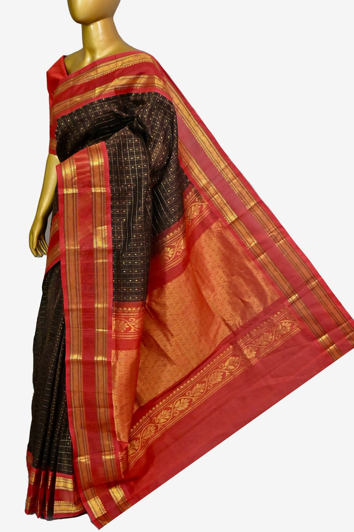 Sico Kanjeevaram Silk Saree in Black and Red Color with Allover Zari Checks with Zari Butta and Gap Border