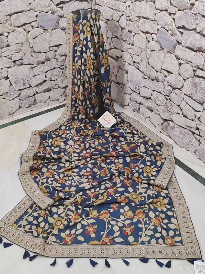 - Crepe silk exudes a soft sheen and fluid drape, like this one in navy blue color with multiple other colors, kalamkari work