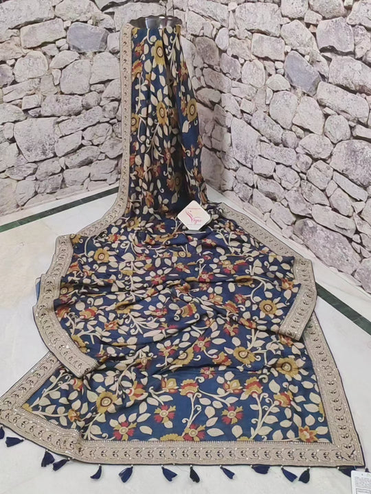 It's a detailed Kalamkari work, bursting with traditional charm and intricate patterns that tell a story. A classy designer border frames the look, adding a touch of finesse. Ideal for festive fun, weddings, or cultural fiestas, this saree mixes old-world tradition with a fresh, playful twist.