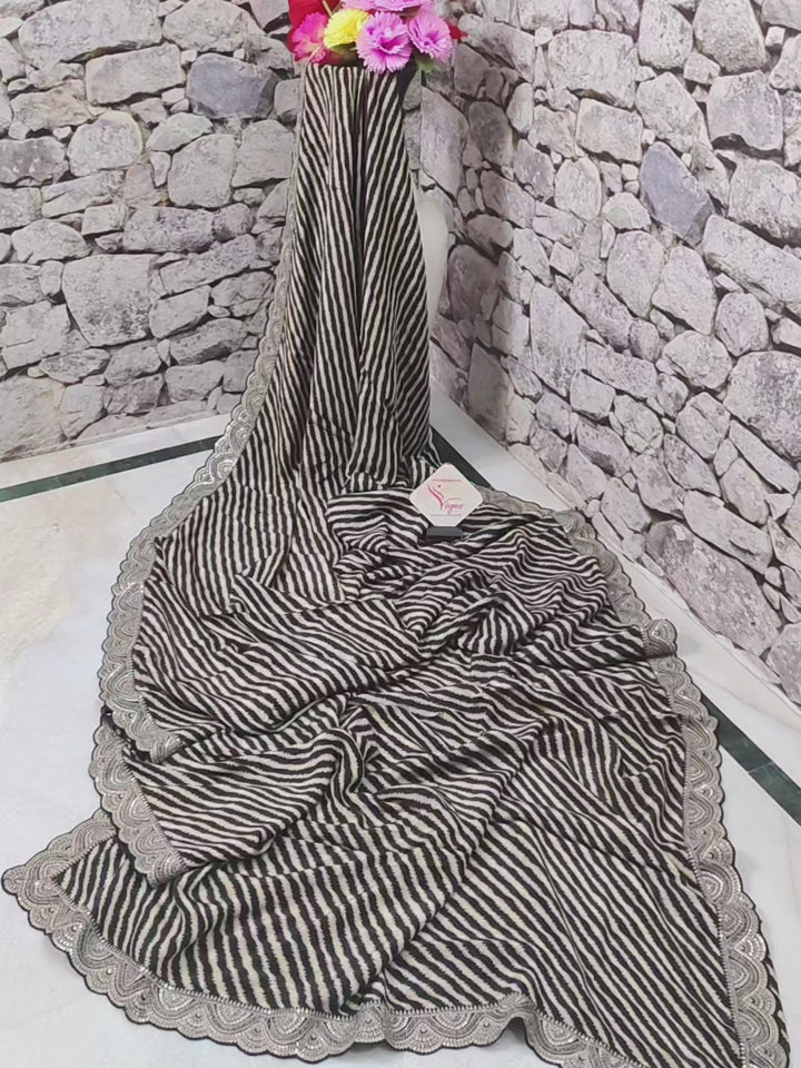 Crepe Saree in Sandal and Black Color in Retro Style ZigZag Pattern and Designer Border