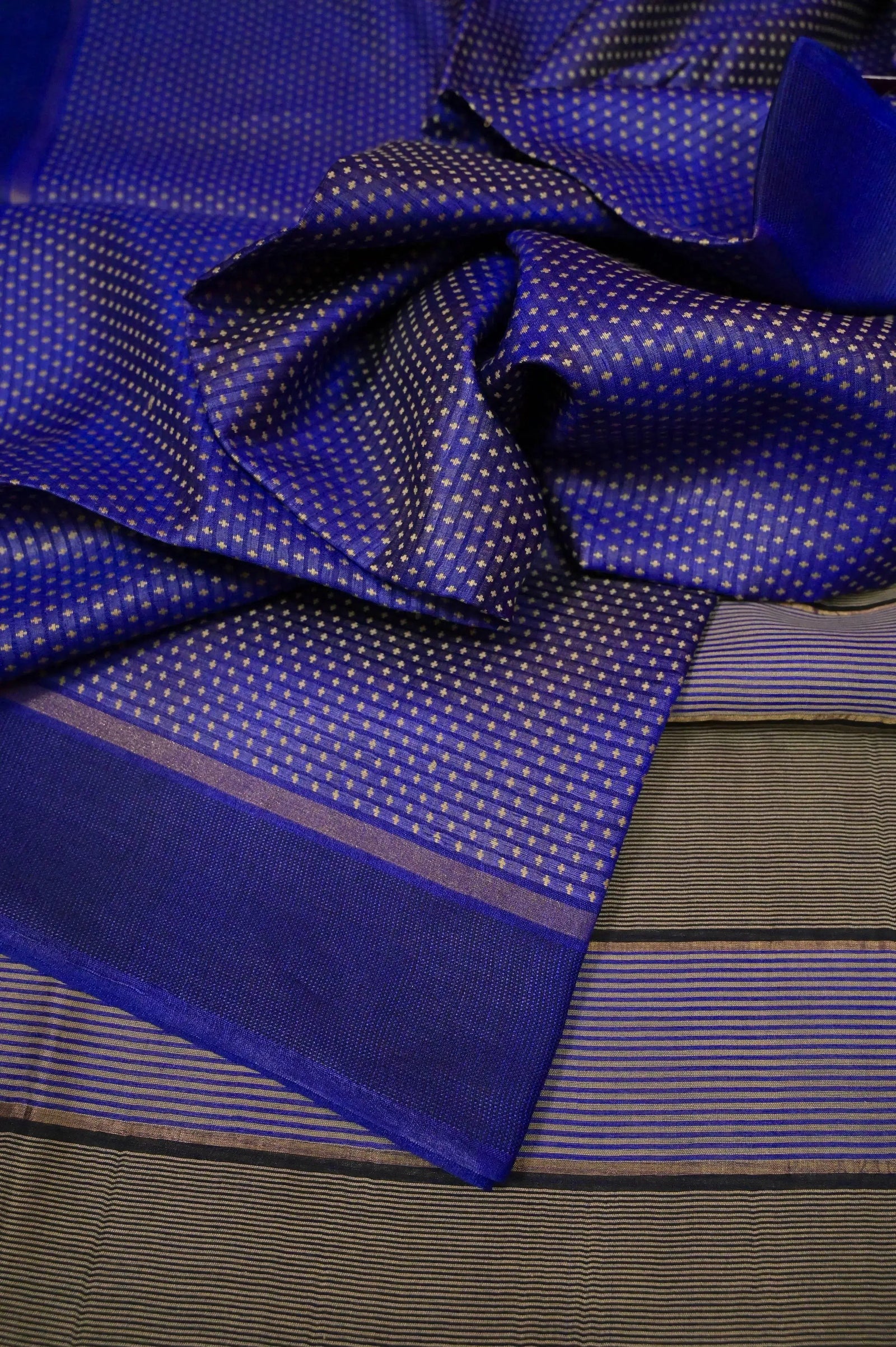 This dark blue pure tussar silk saree features all-over lotus weaving and zari weavingresham work, providing an elegant and sophisticated look. Made from high-quality pure silk, this saree is perfect for any special occasion, elevating your style and making you stand out.