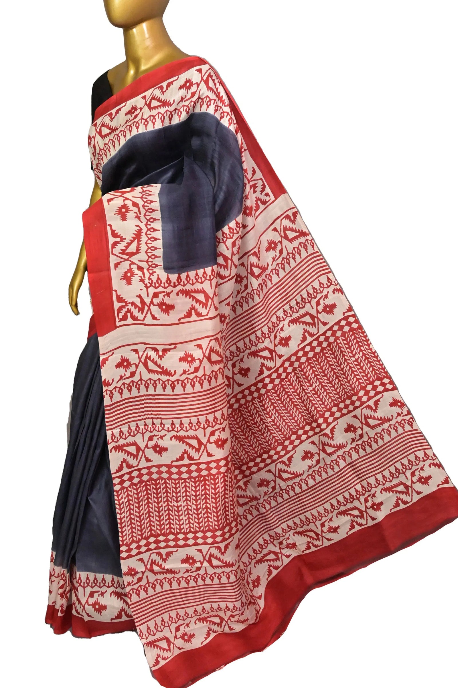 This stunning saree showcases a classy dark steel grey and red blend, made from 100% authentic Bishnupur silk. With delicate jamdani block print work designs done by hand and coming with a Silk Mark certification, this saree truly celebrates the art of handcrafting. And don't worry, it comes with a contrasting blouse too!