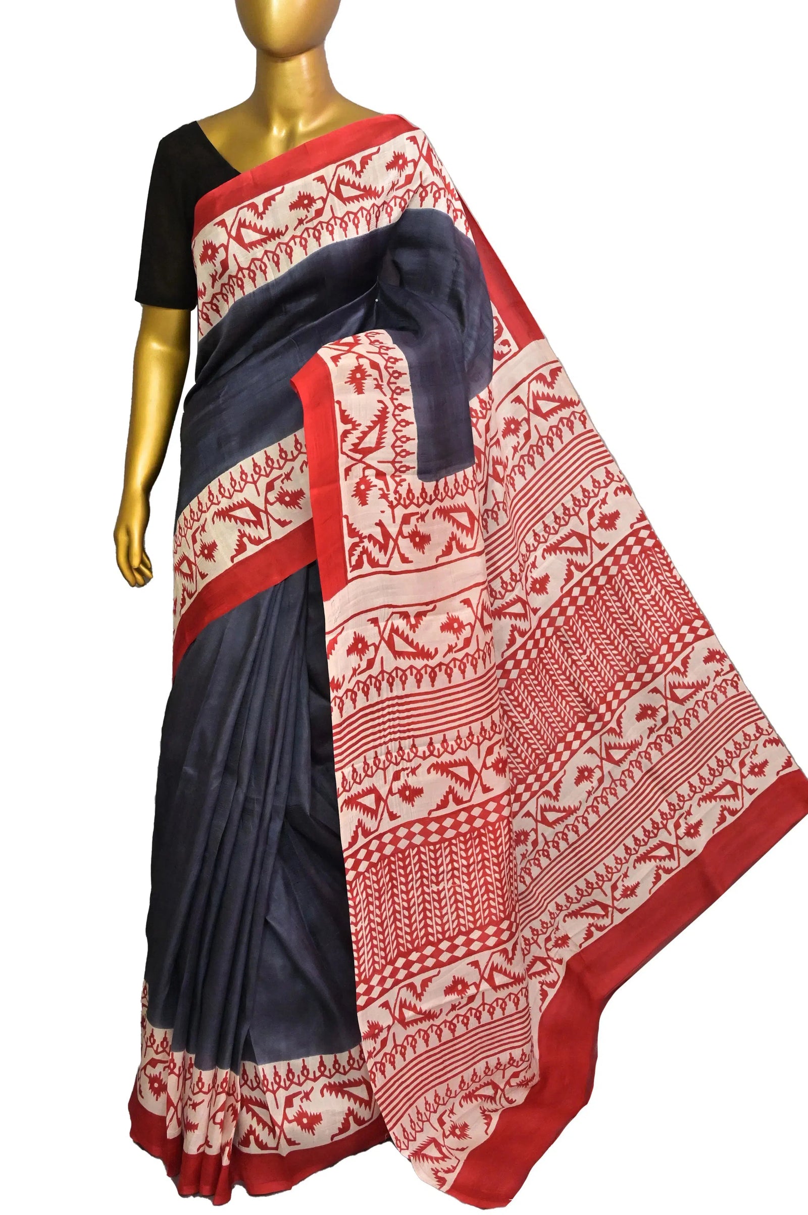 - Rich Bishnupur Silk fabric in timeless dark steel grey and red combination