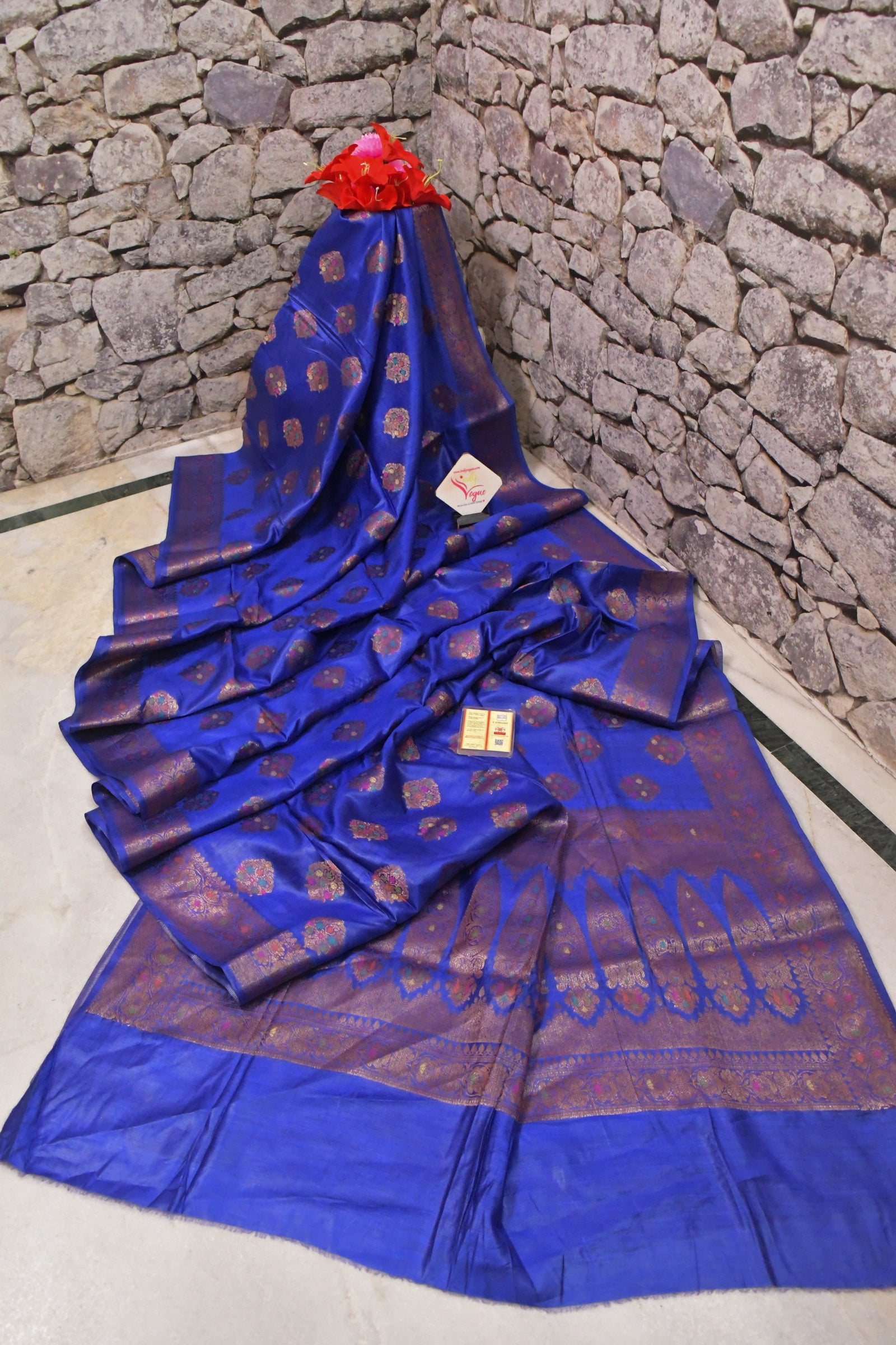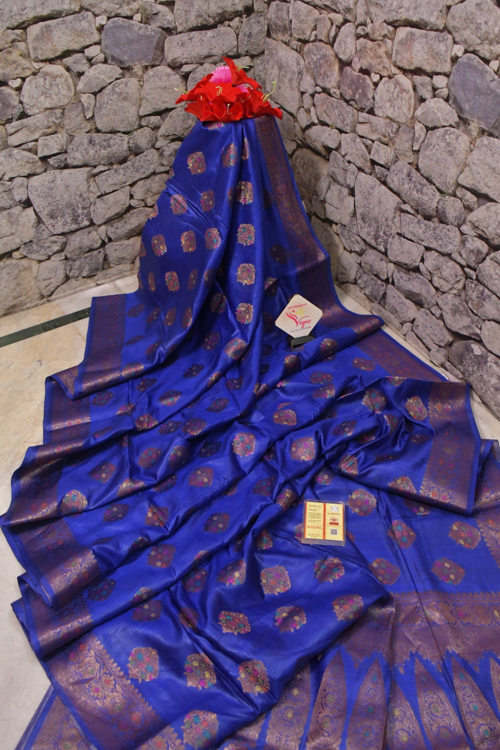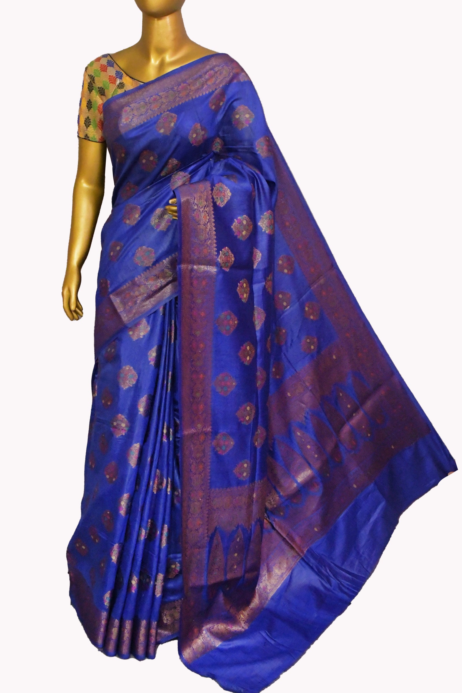 Deep Blue Color Pure Muga Silk Saree with Antique Zari Work and Meenakari Buti Pallu and Border