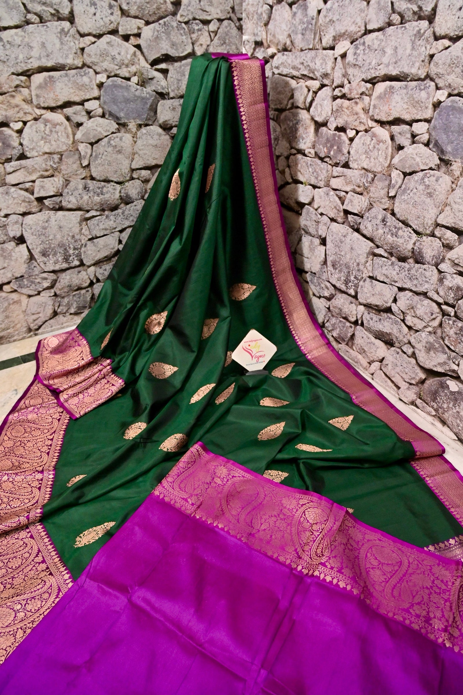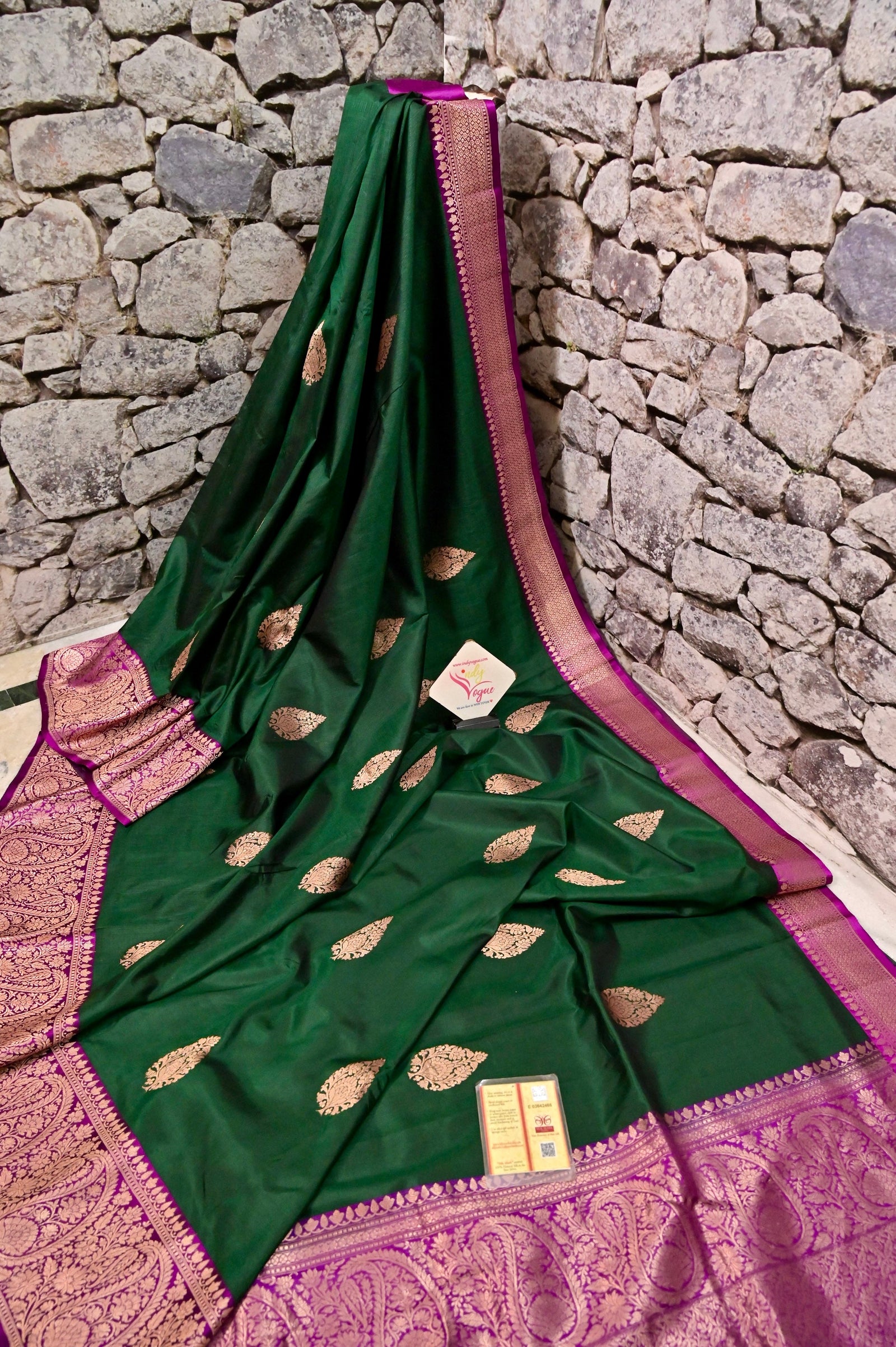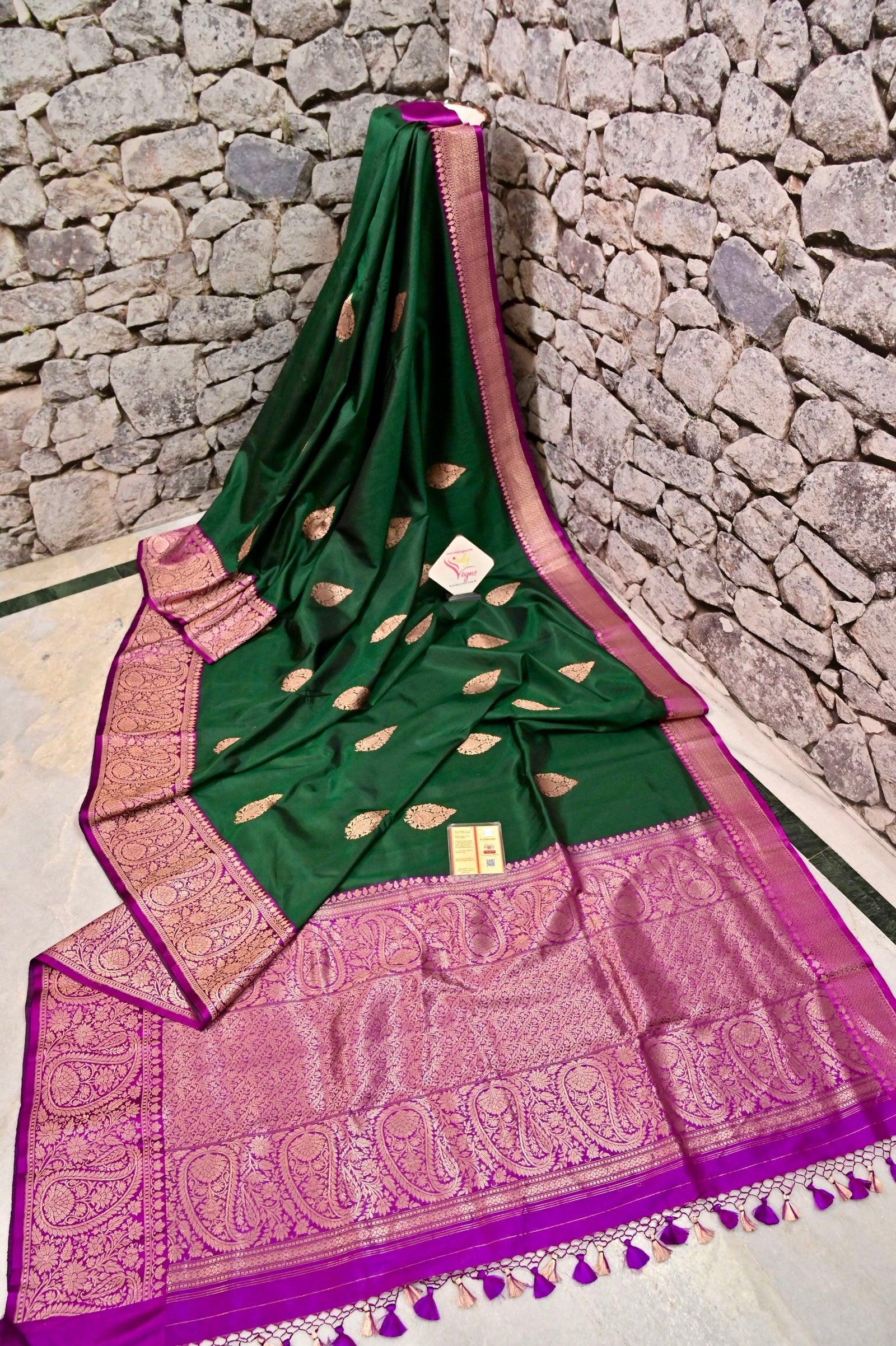 Deep Green and Magenta Color Katan Banarasi Silk Saree with Allover Buti Work