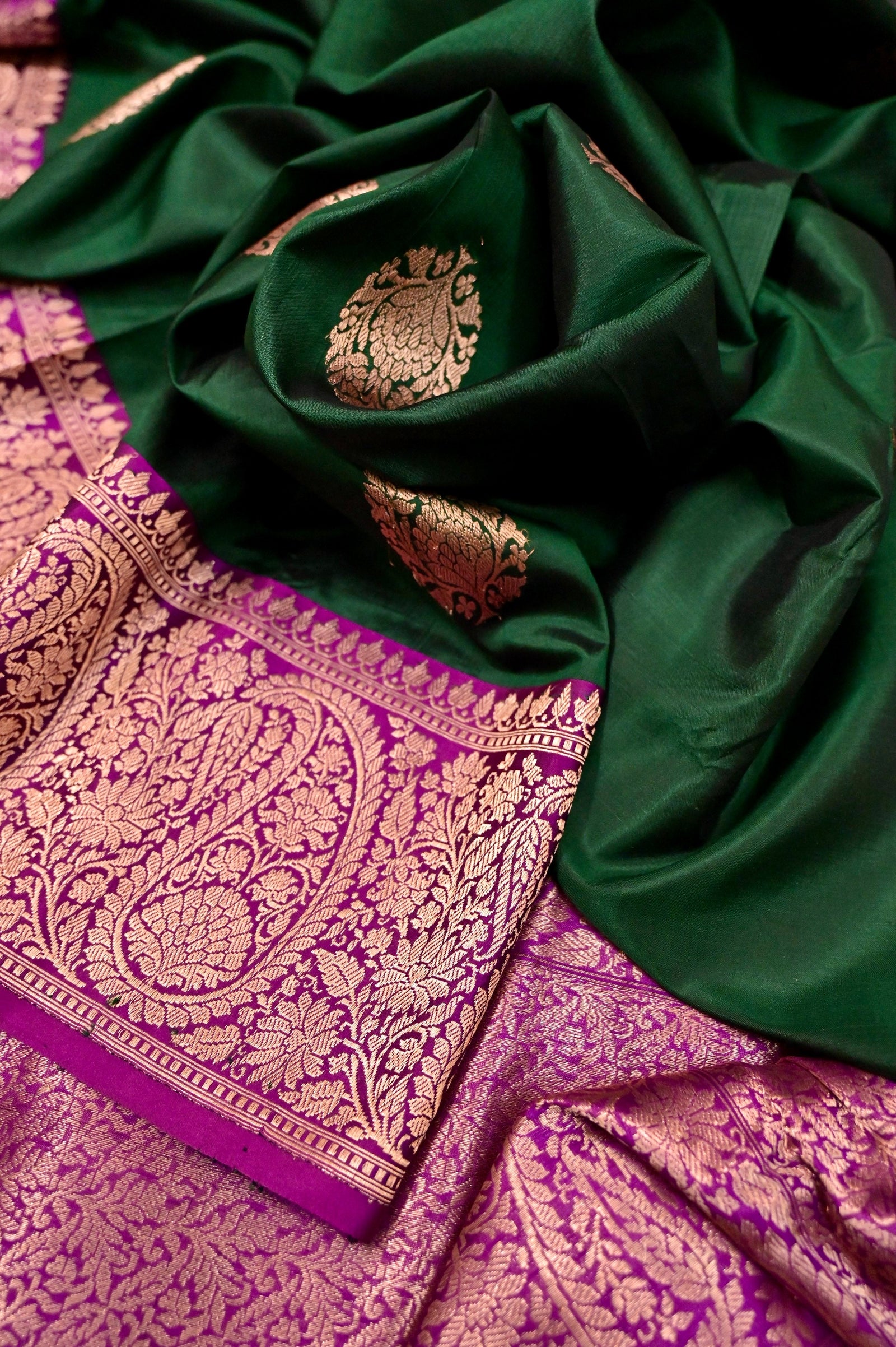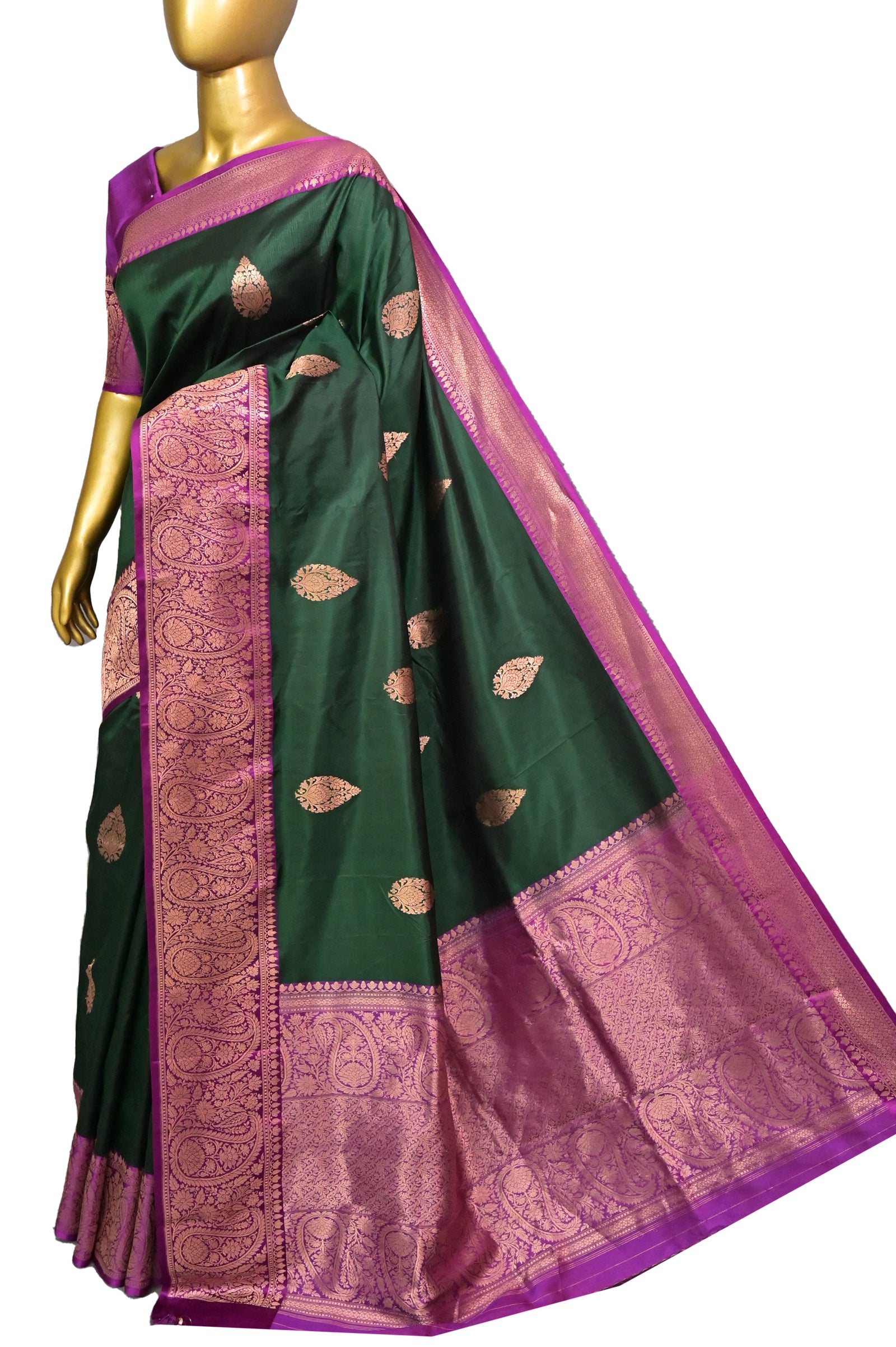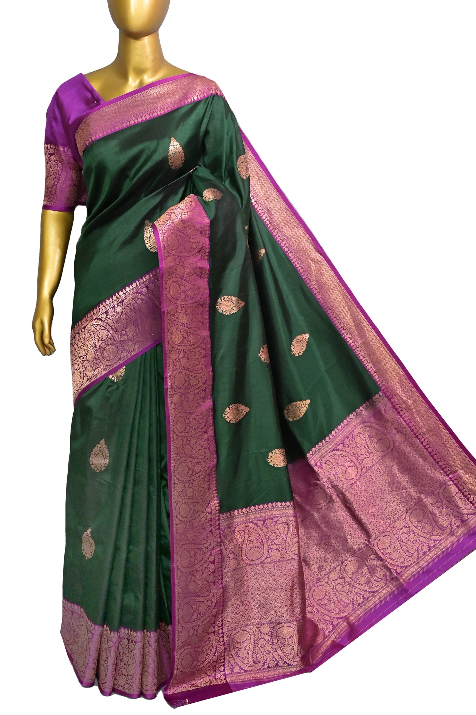 Deep Green and Magenta Color Katan Banarasi Silk Saree with Allover Buti Work