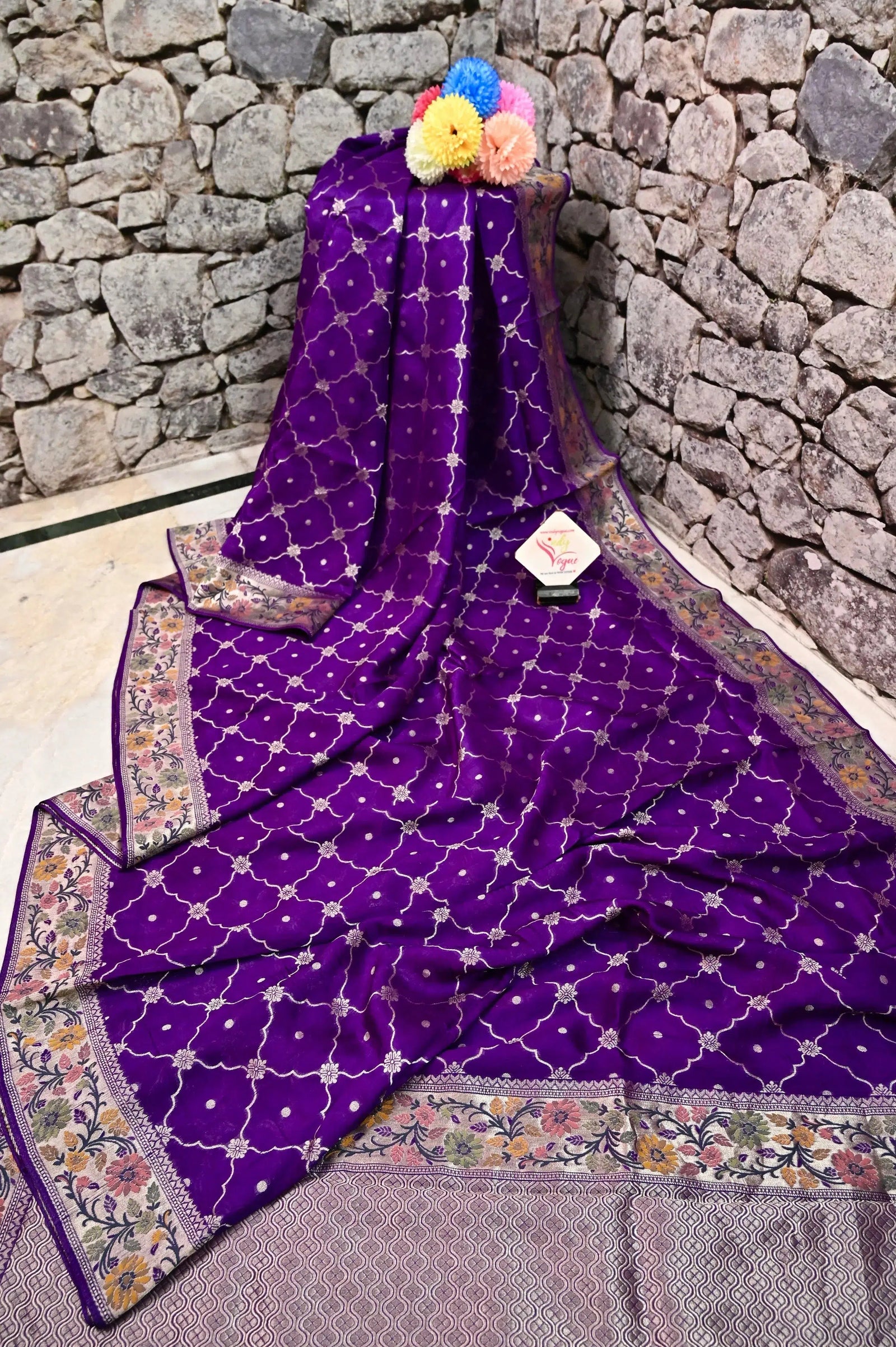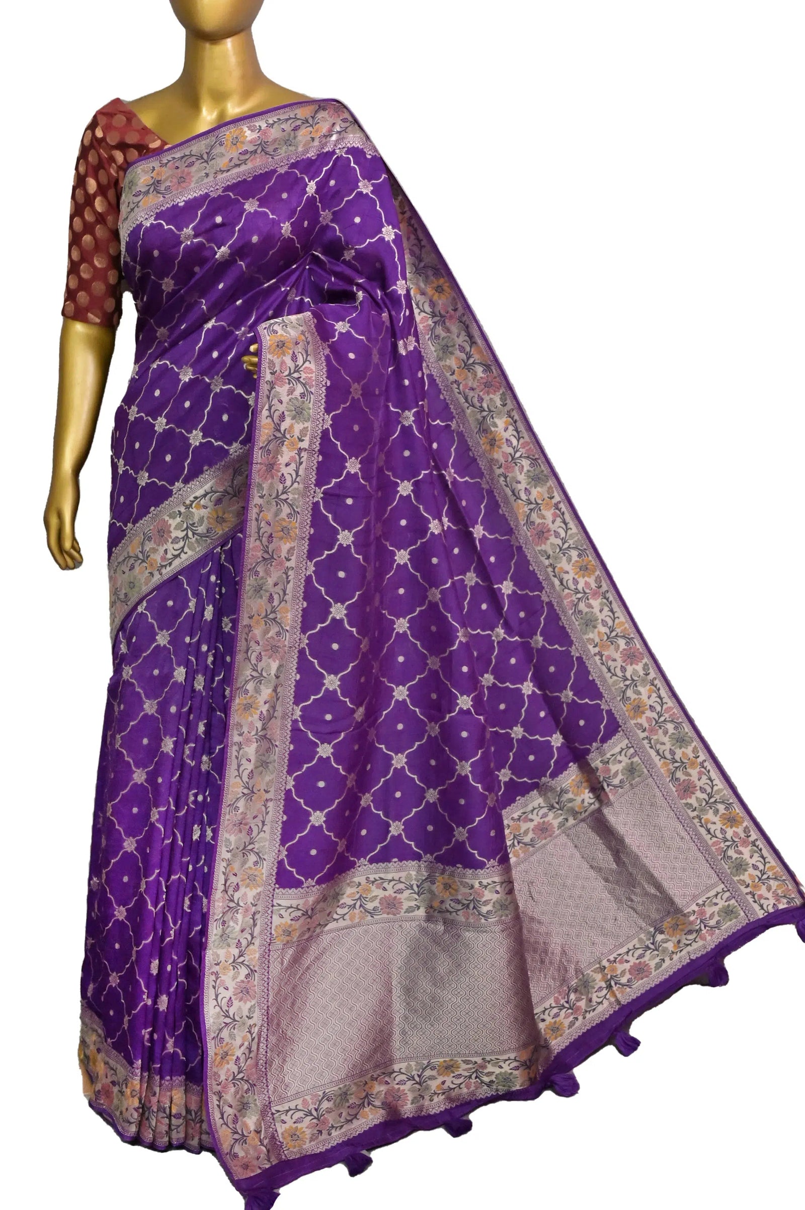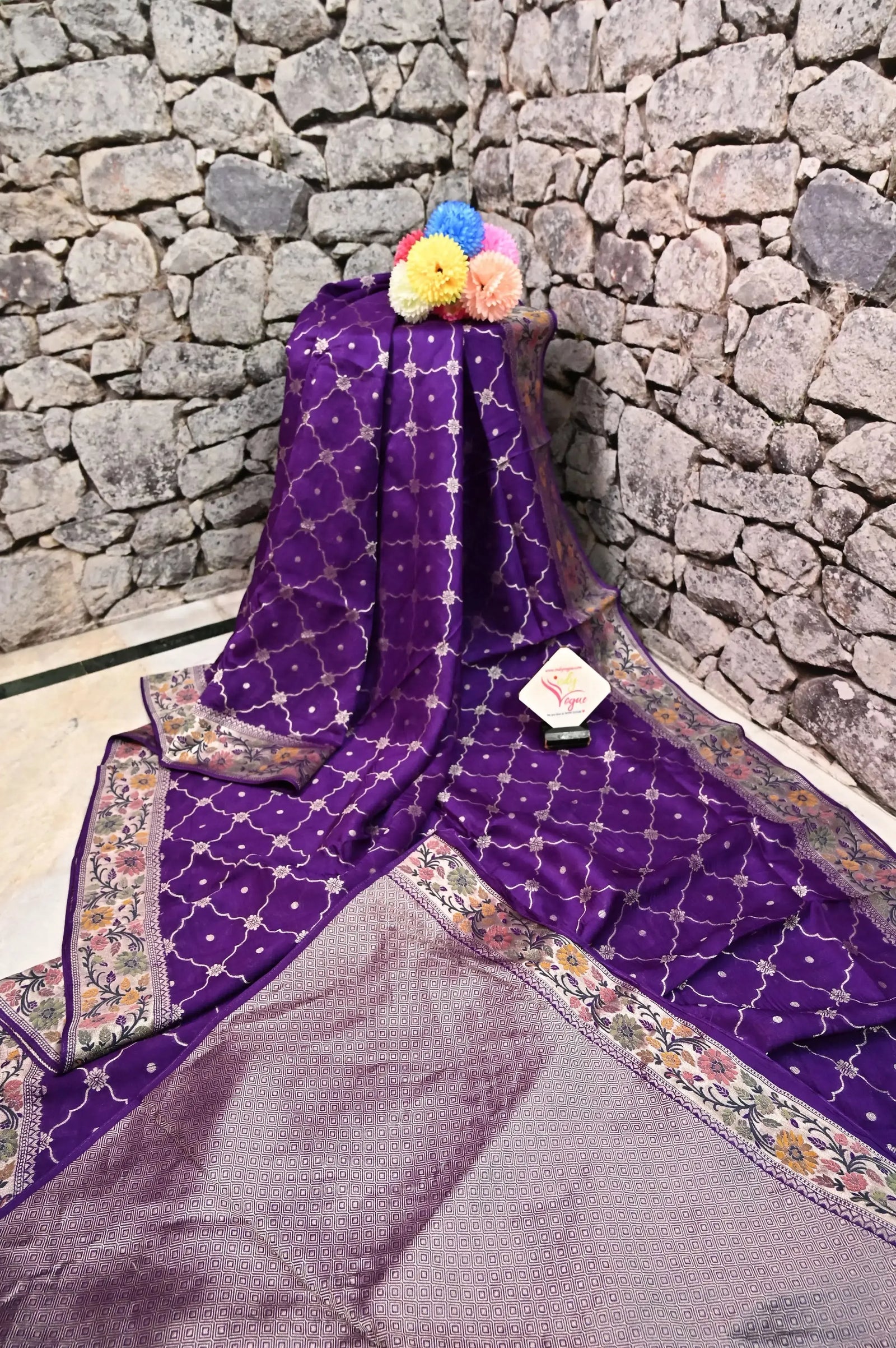 An elegant collection with fine traditional silver meenakari zari weaving on the body that comes with paisley style traditional zari buti work and interweaving pattern meenakari silver work that makes this saree one of the magnetic works in a deep purple color body with a paithani work border and pallu.