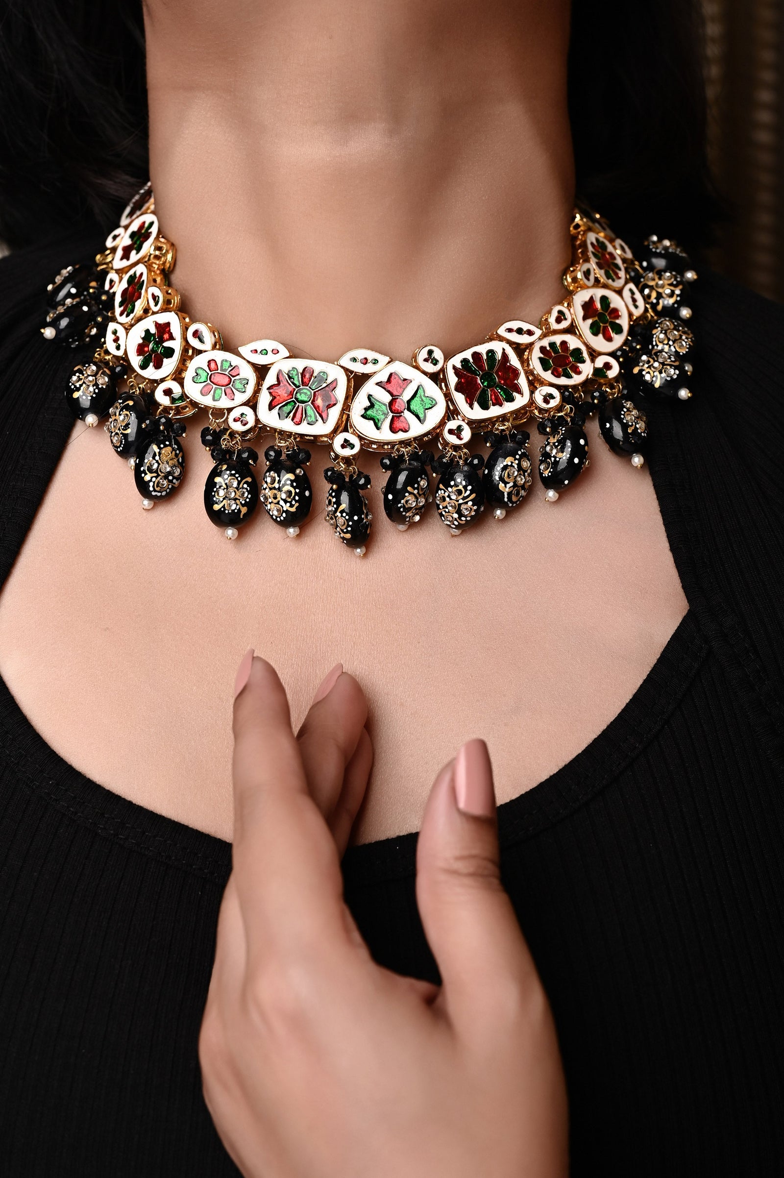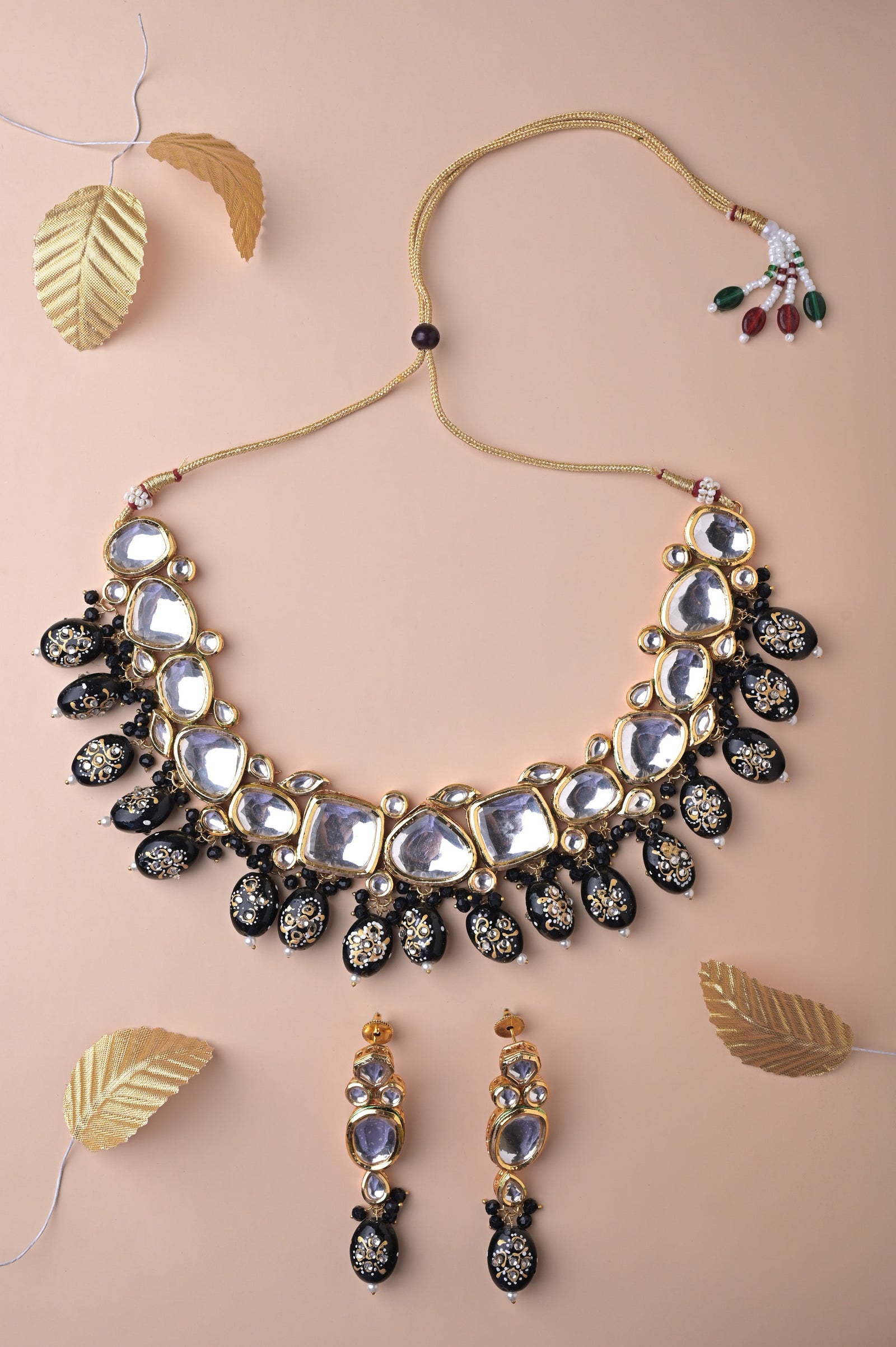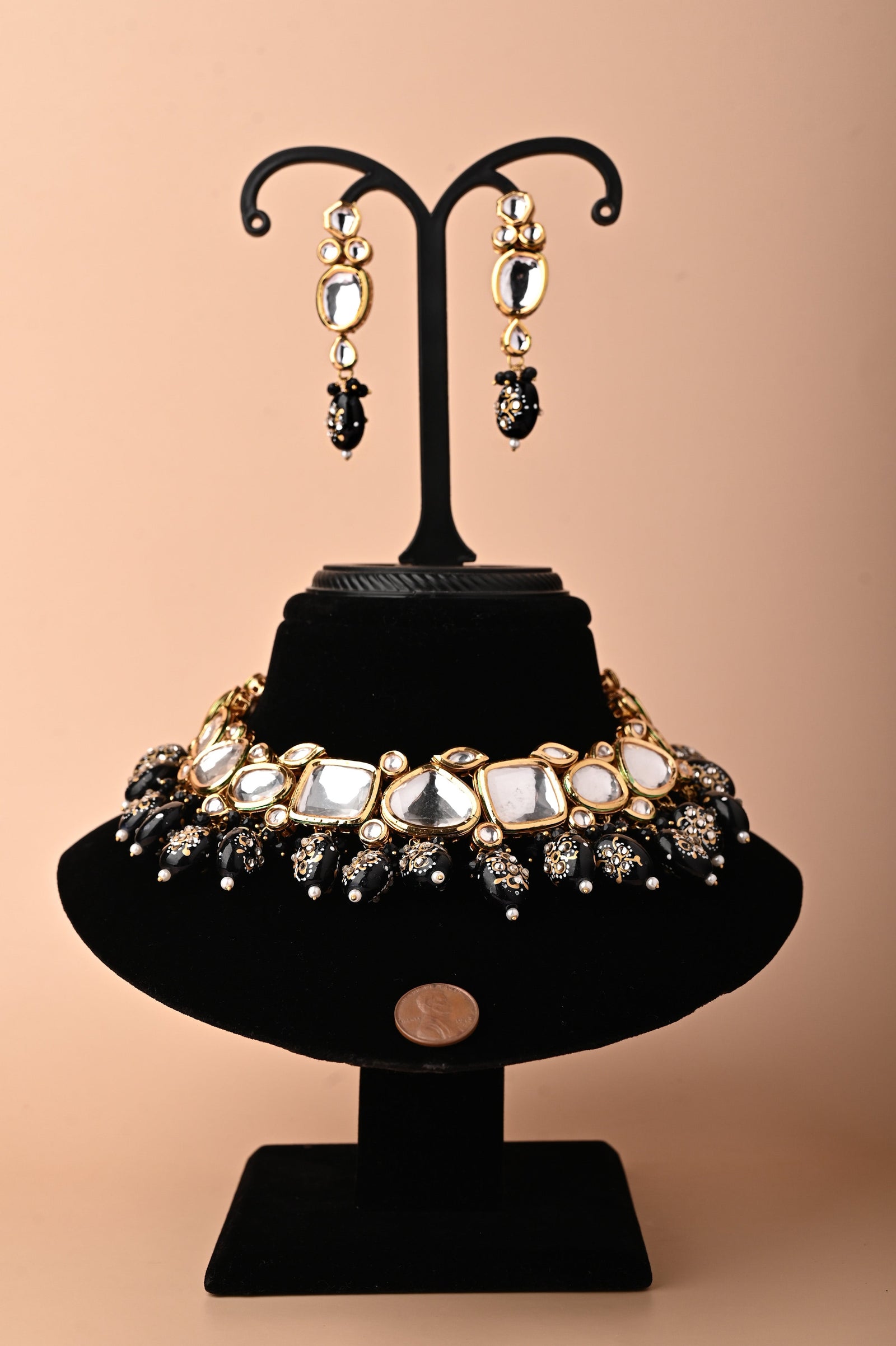 Bring your wardrobe closer to the jewelry that is carefully thought through. This is a Kundan necklace set in a collar pattern with stone work and meenakari work at the backside and matching earrings in a jharoka pattern with colorful tassels surrounding it. The penny kept beside helps to understand the real size of the ornament.