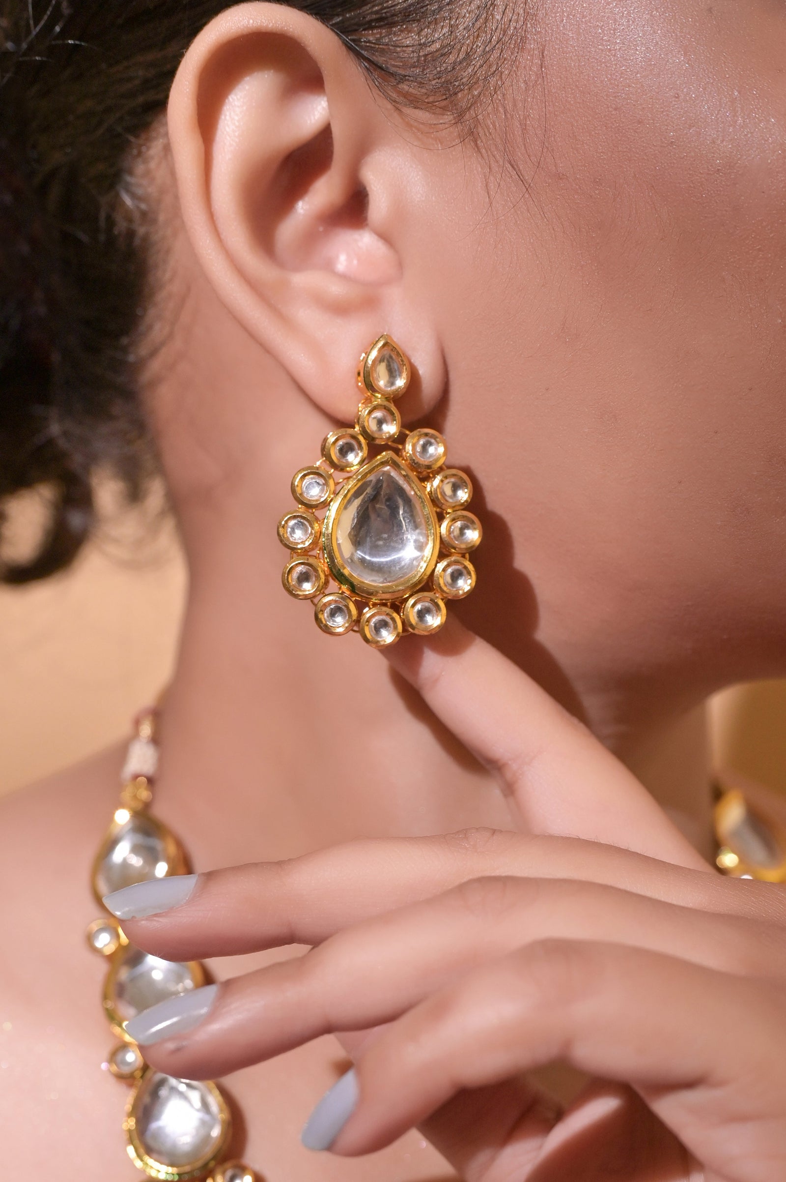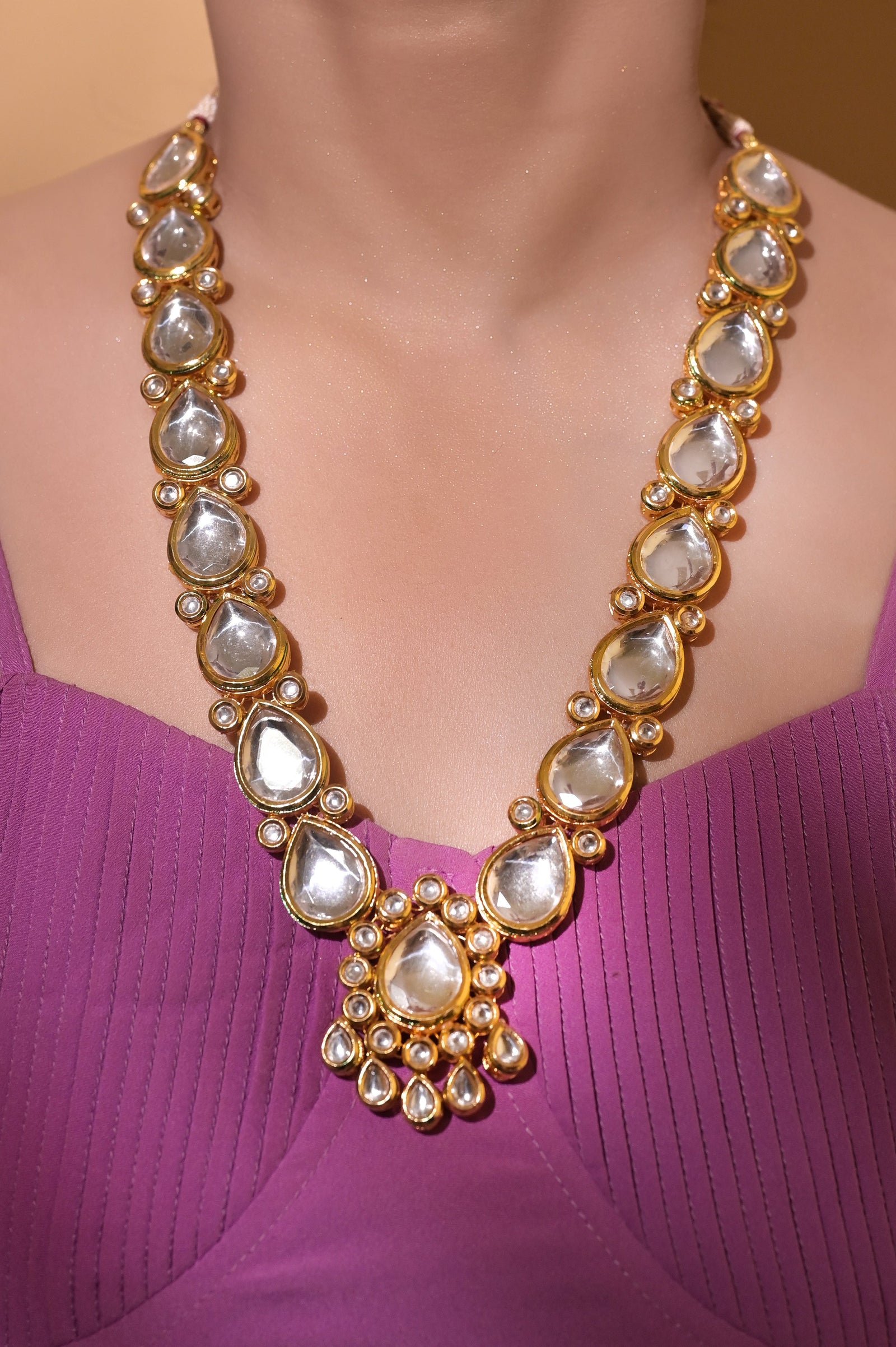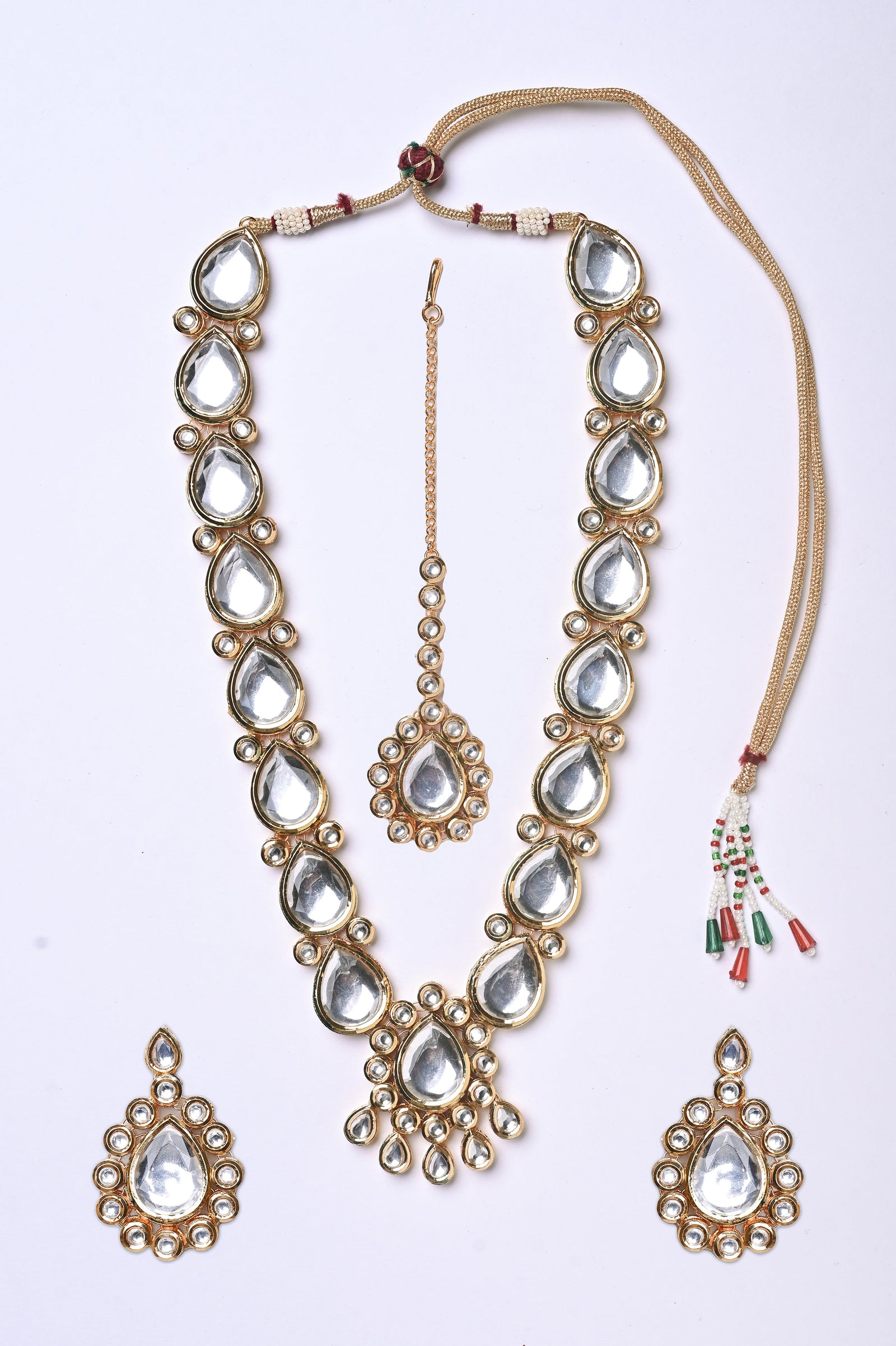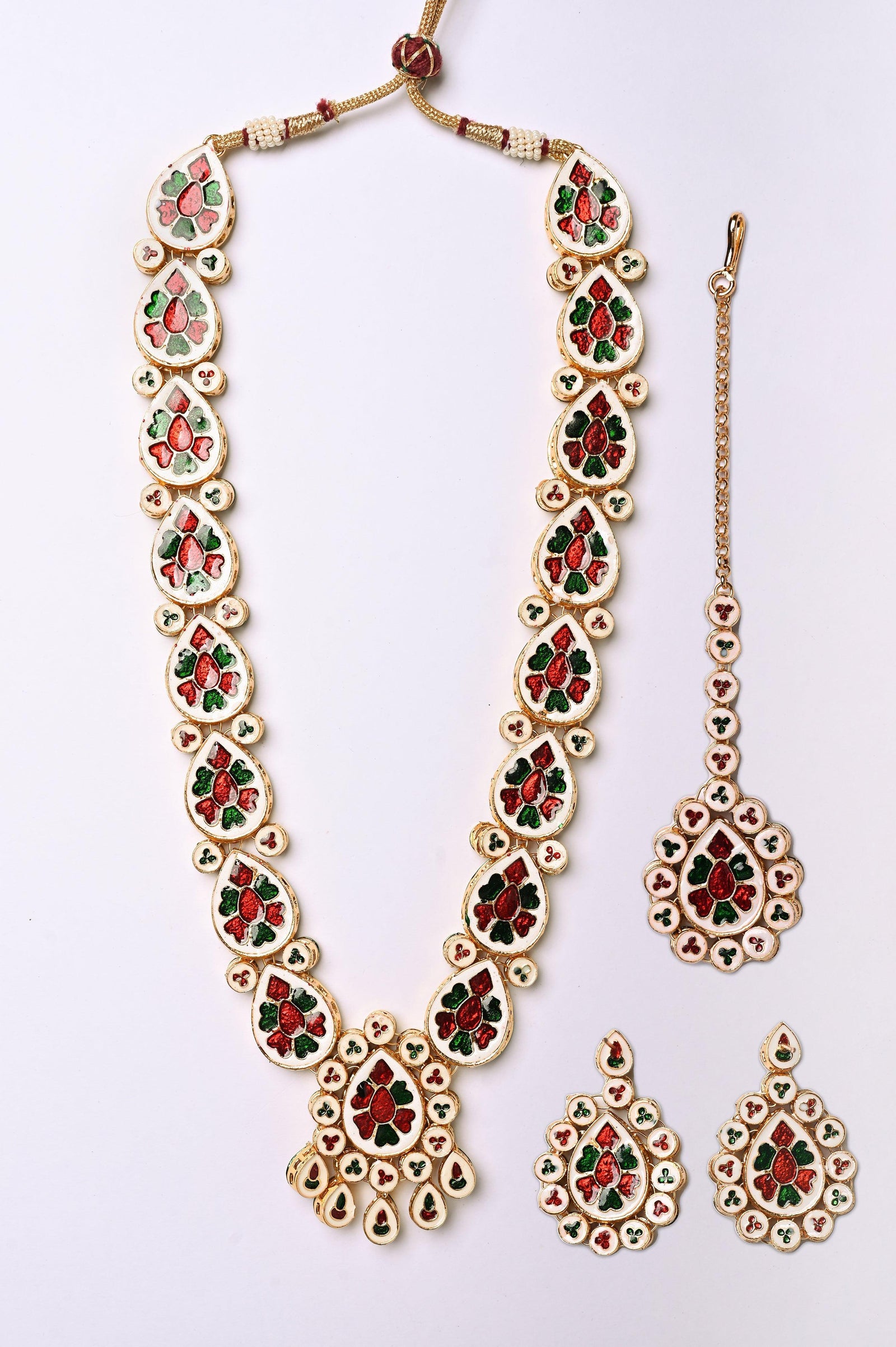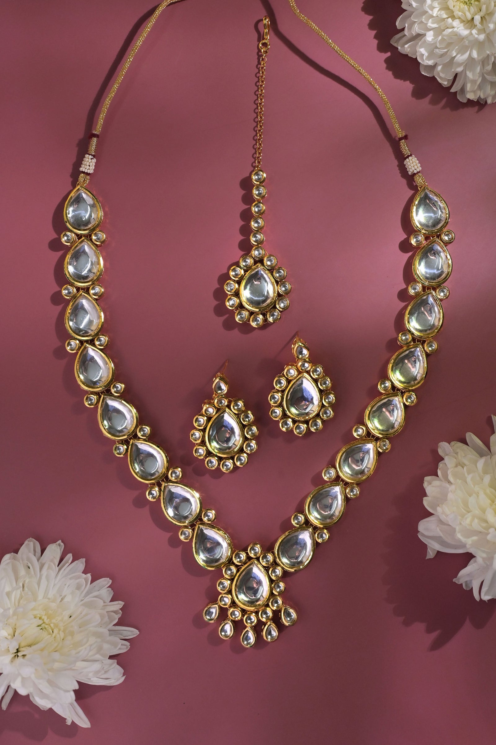 A new age collection perfect for weddings or festivals, designed in a marwar pattern in sitahar style makes this Kundan set one of the rare varieties. A necklace set can be worn double-side. One side has a pure Kundan setting while the other side has a hand-done meenakari setting. It comes with maang-tika and double-sided work jhumka to complete a fashionable look. The penny is kept by the side to help you understand the size of the product.