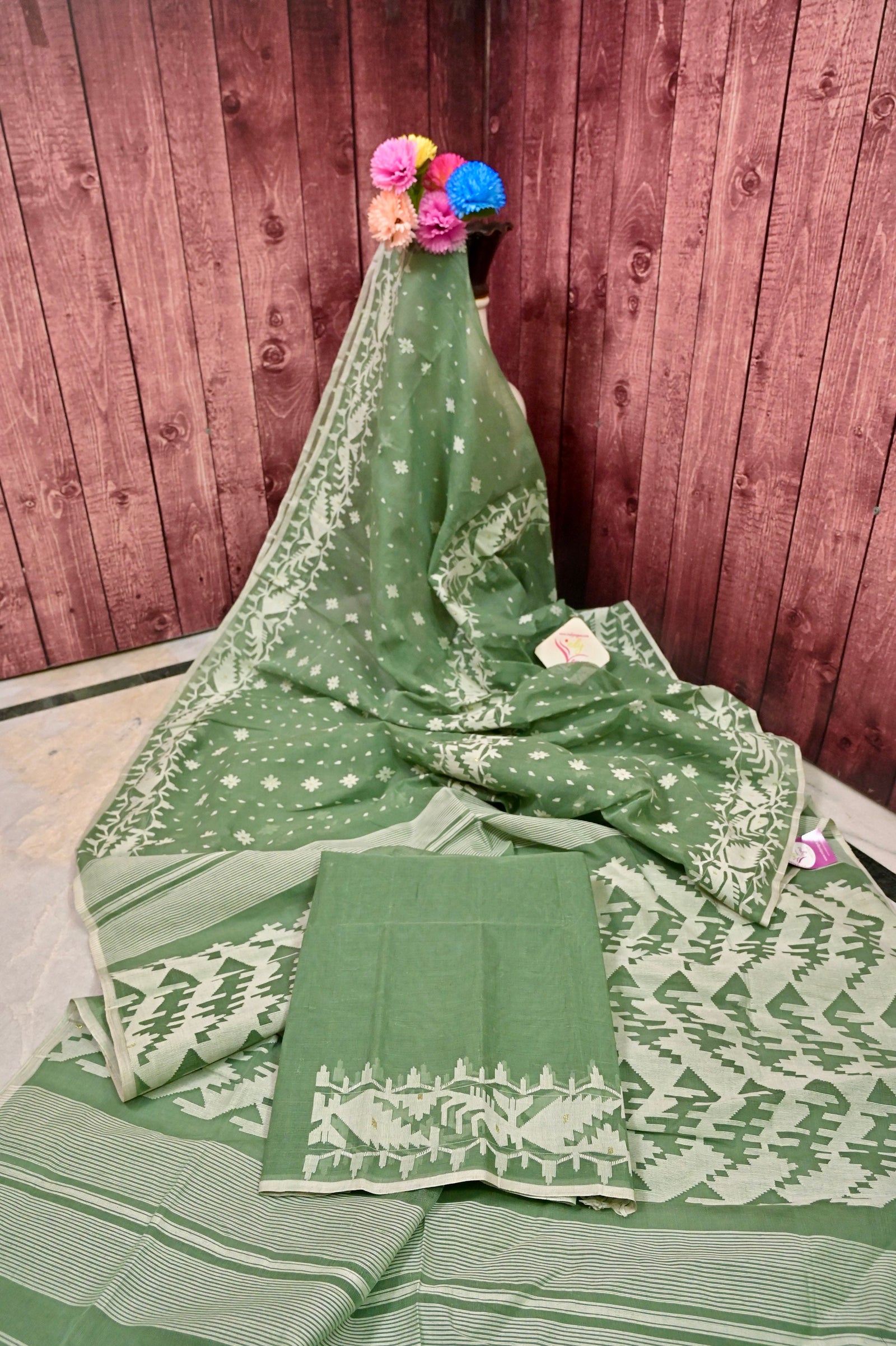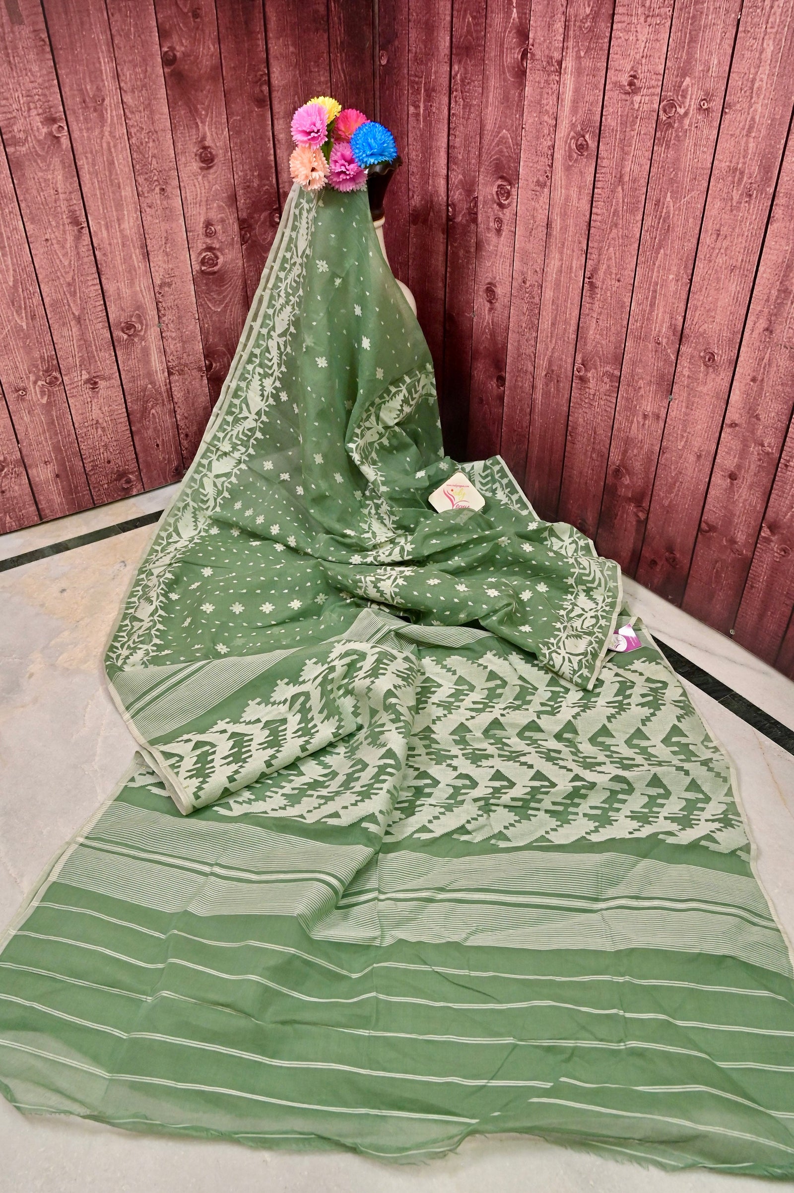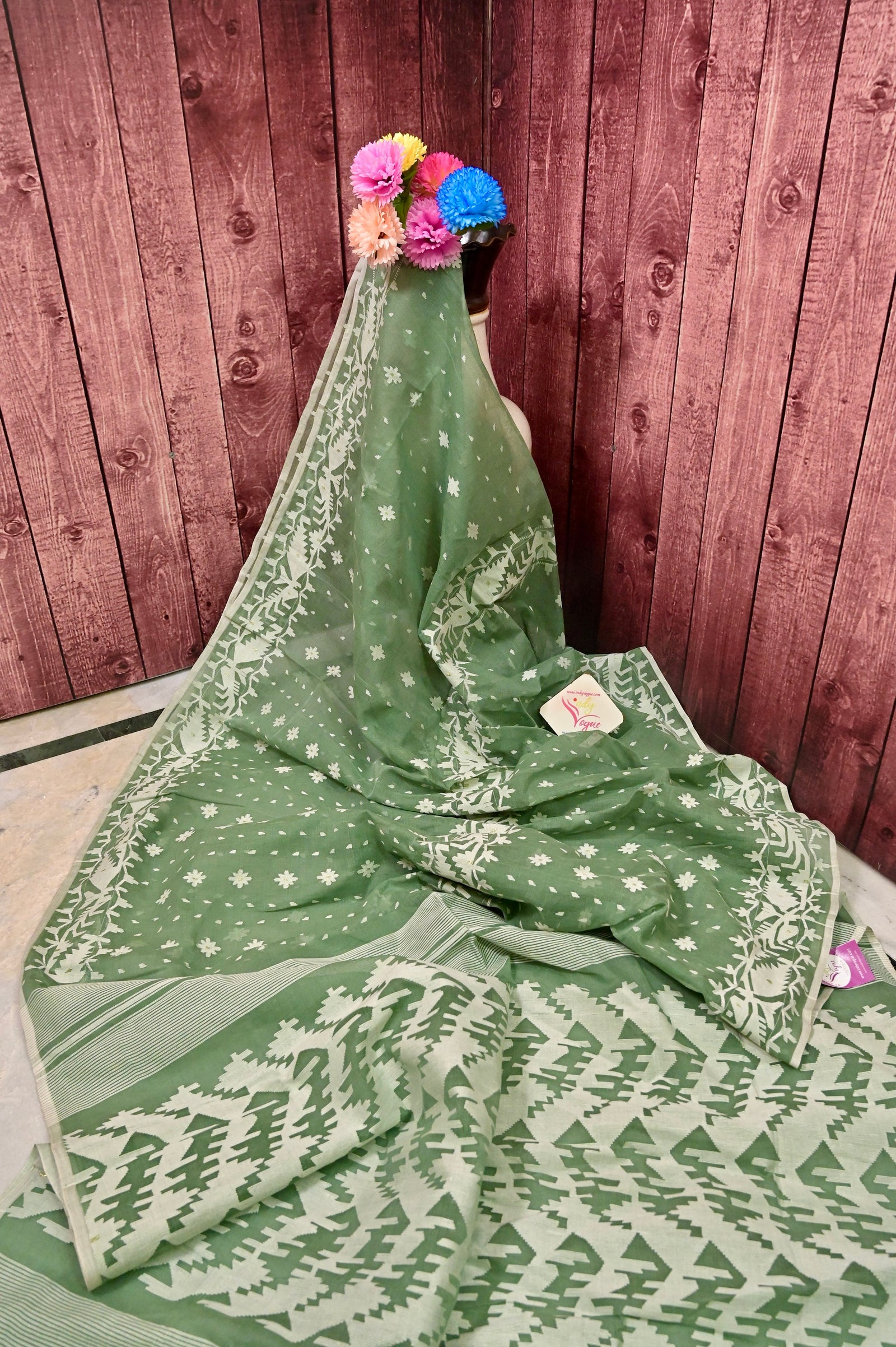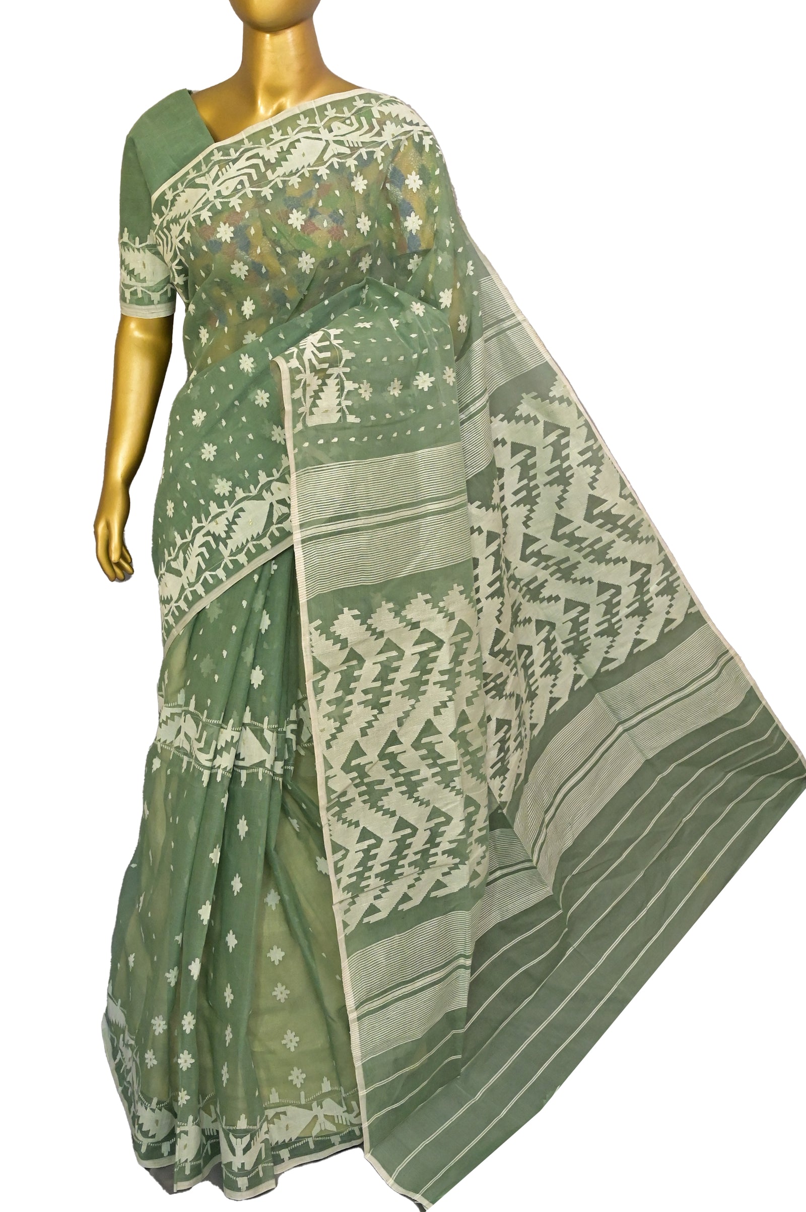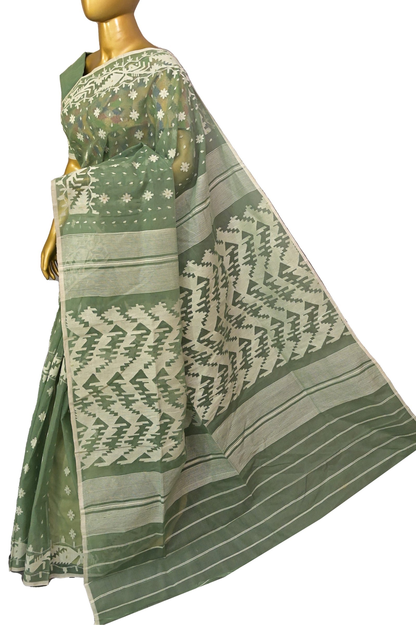 Dusty Green Color Pure Bangladeshi Jamdani Saree with Double Border