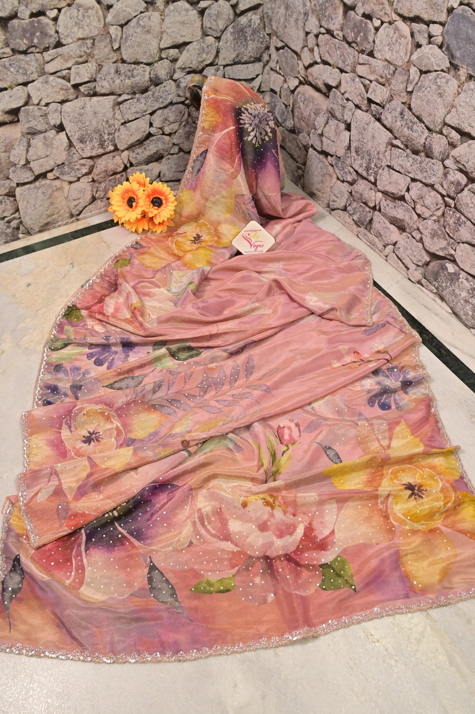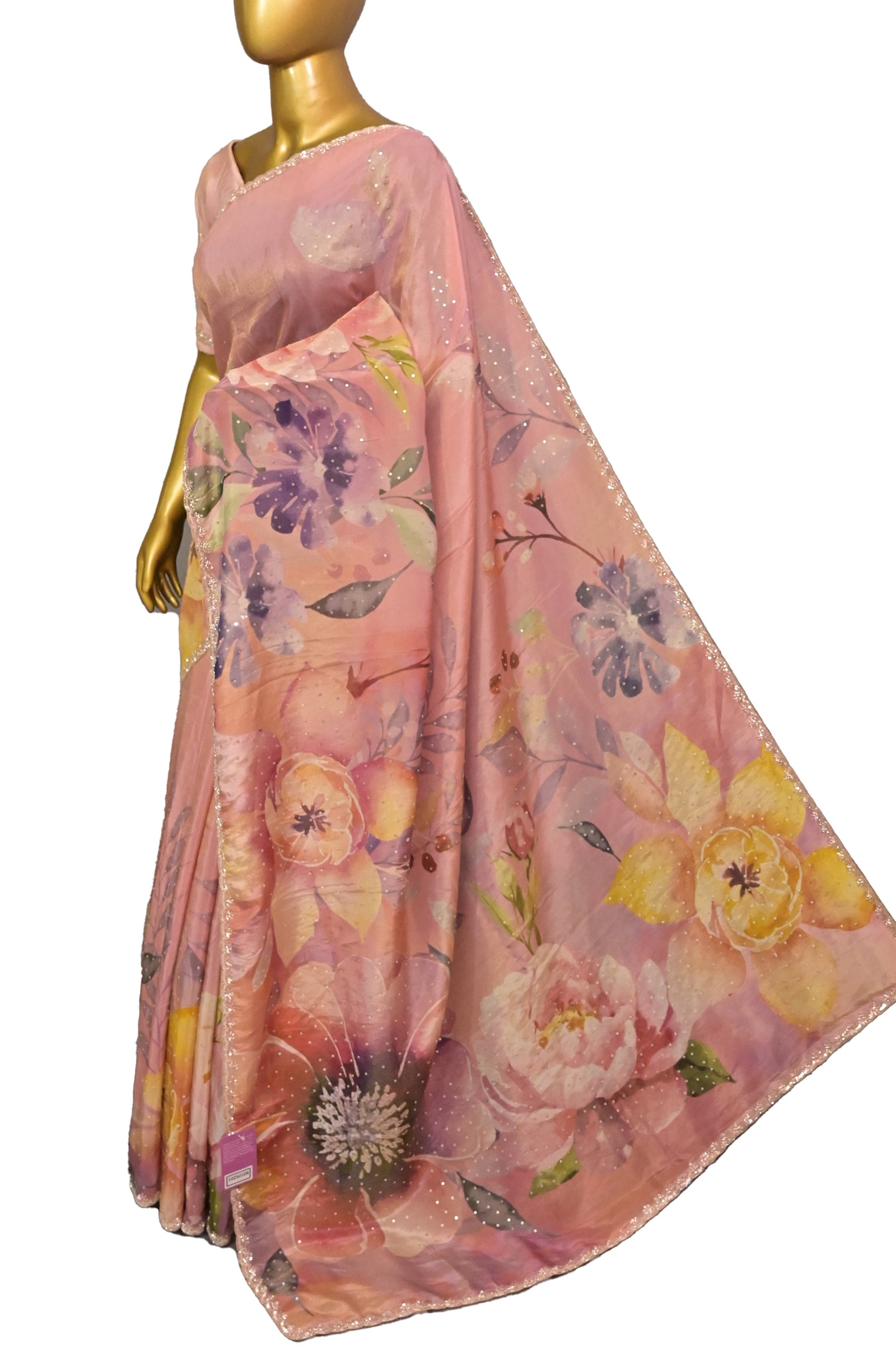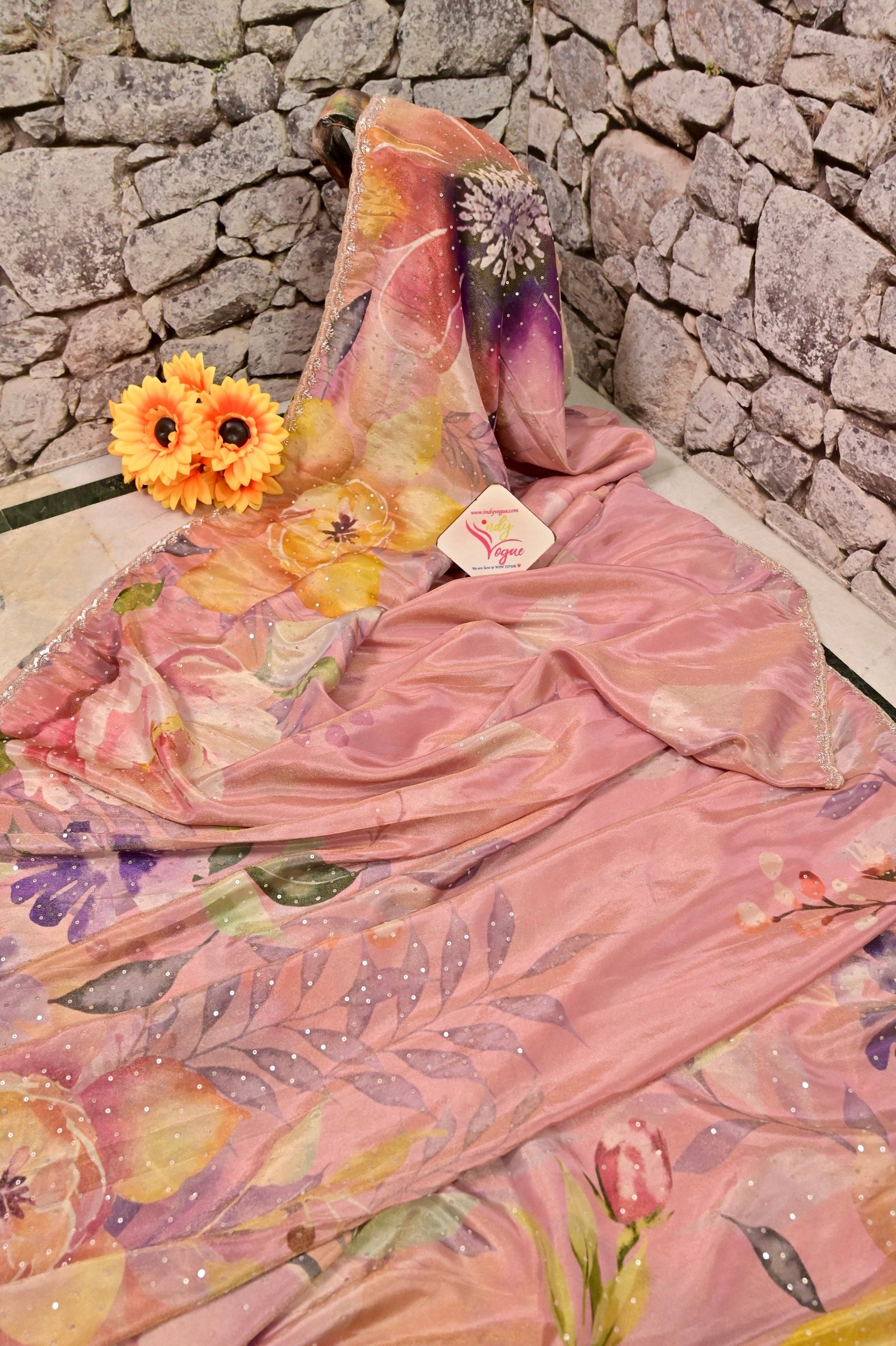 Dusty Pink Color Crepe Tissue Silk Saree with Allover Digital Print and Sequin Embroidery