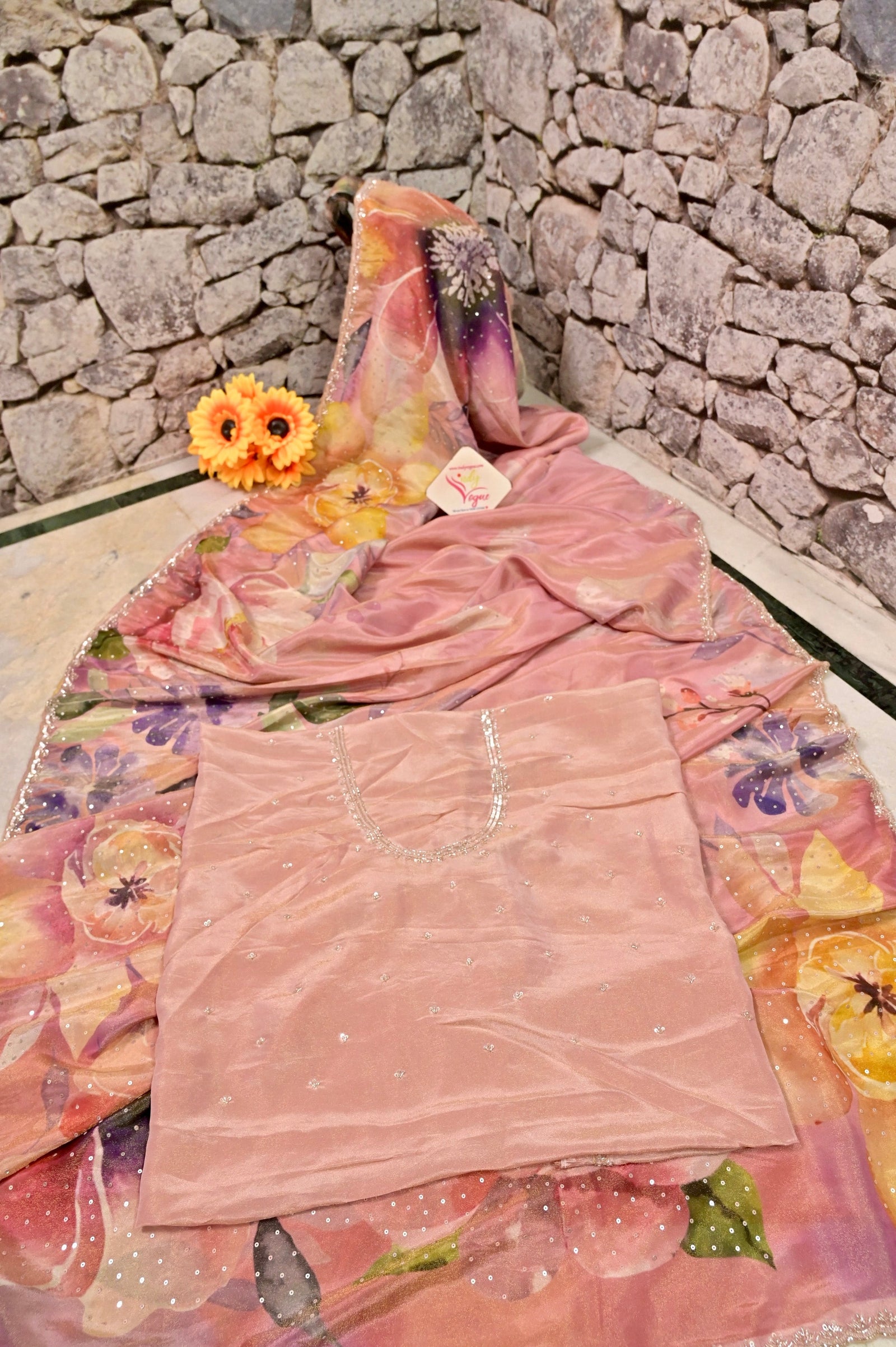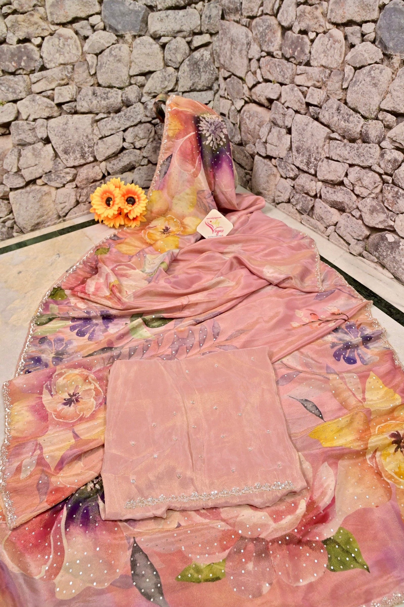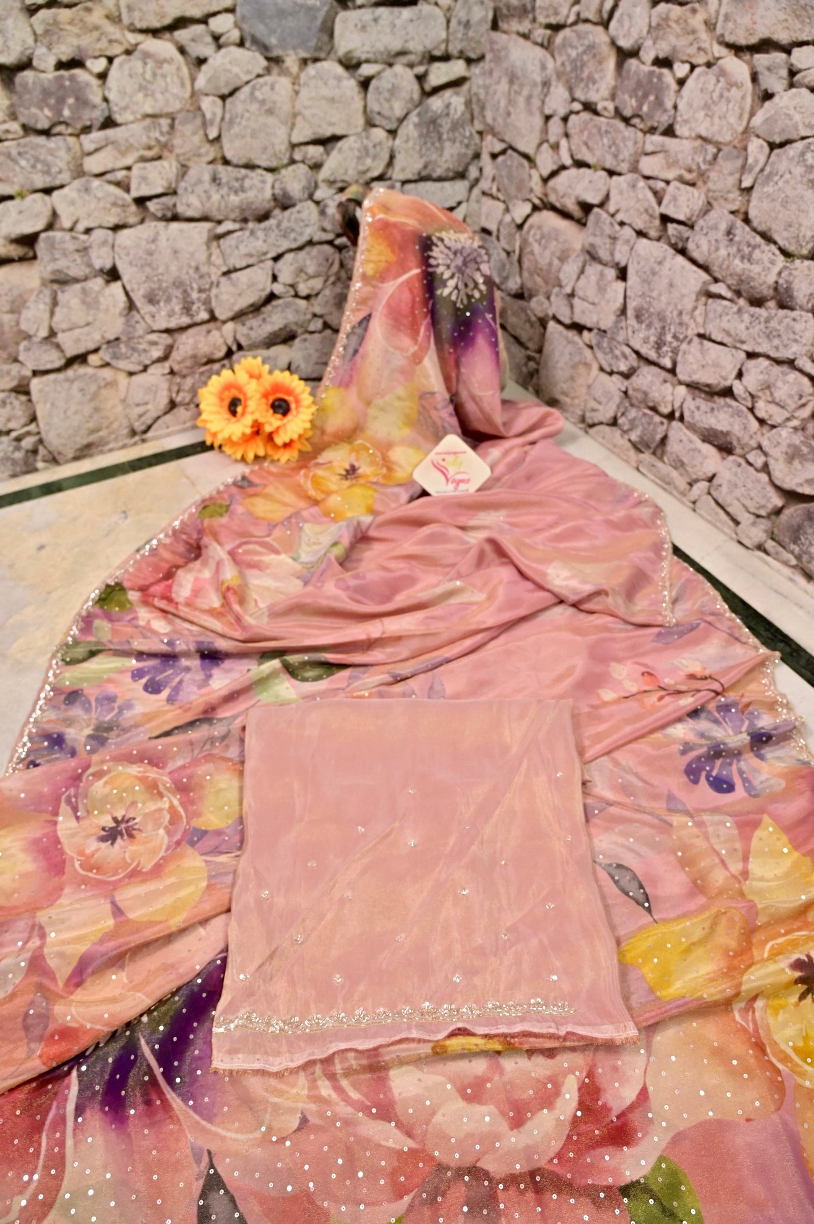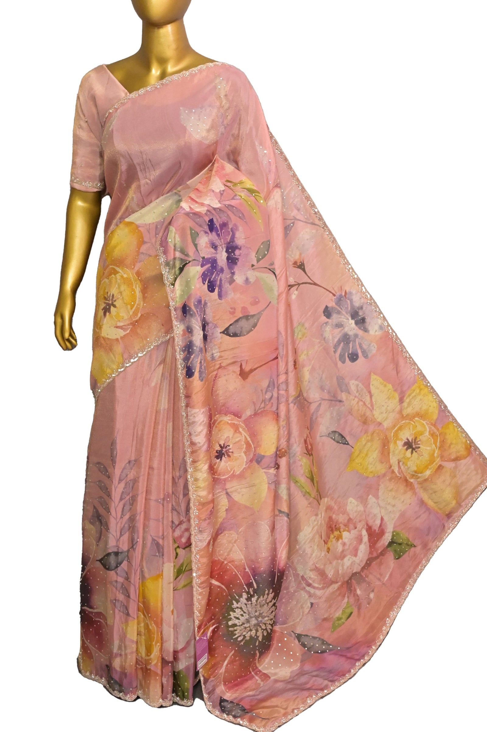 Dusty Pink Color Crepe Tissue Silk Saree with Allover Digital Print and Sequin Embroidery