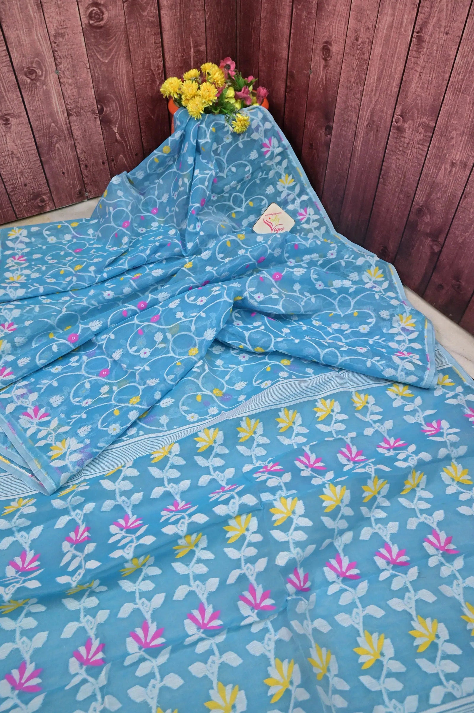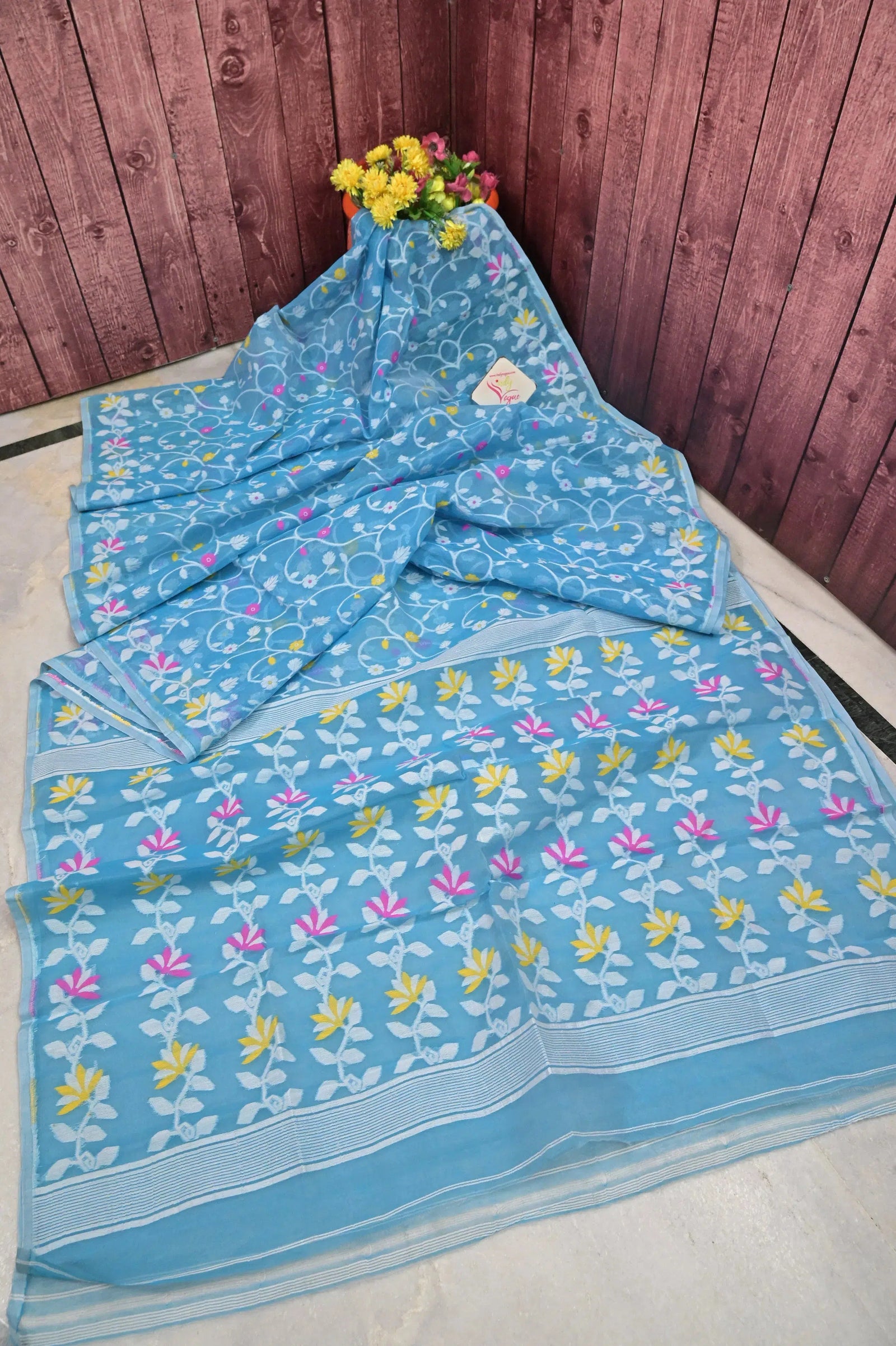 Firozi Blue Color Jamdani Saree with Allover Self-Weaving and Meenakari Work