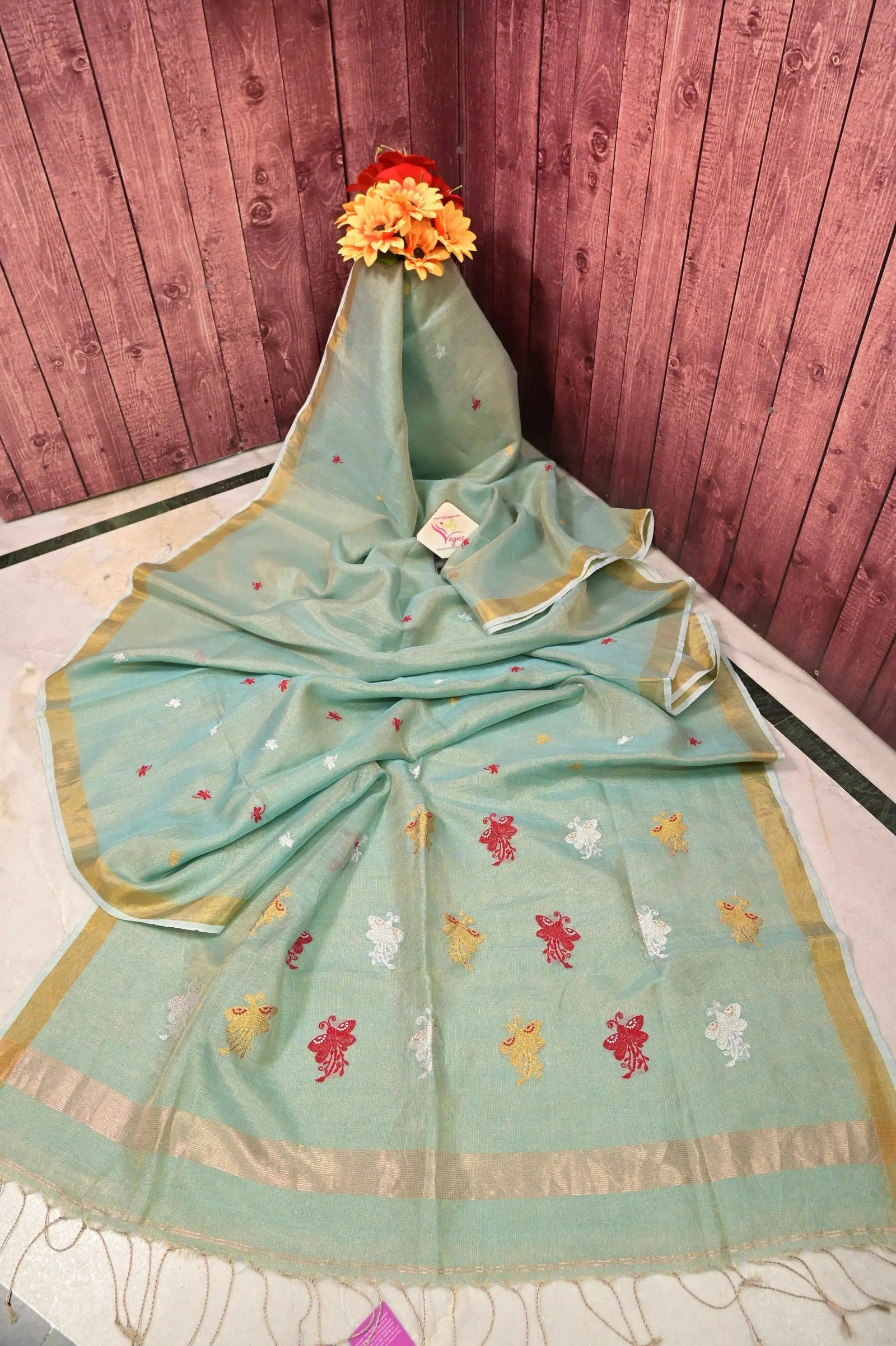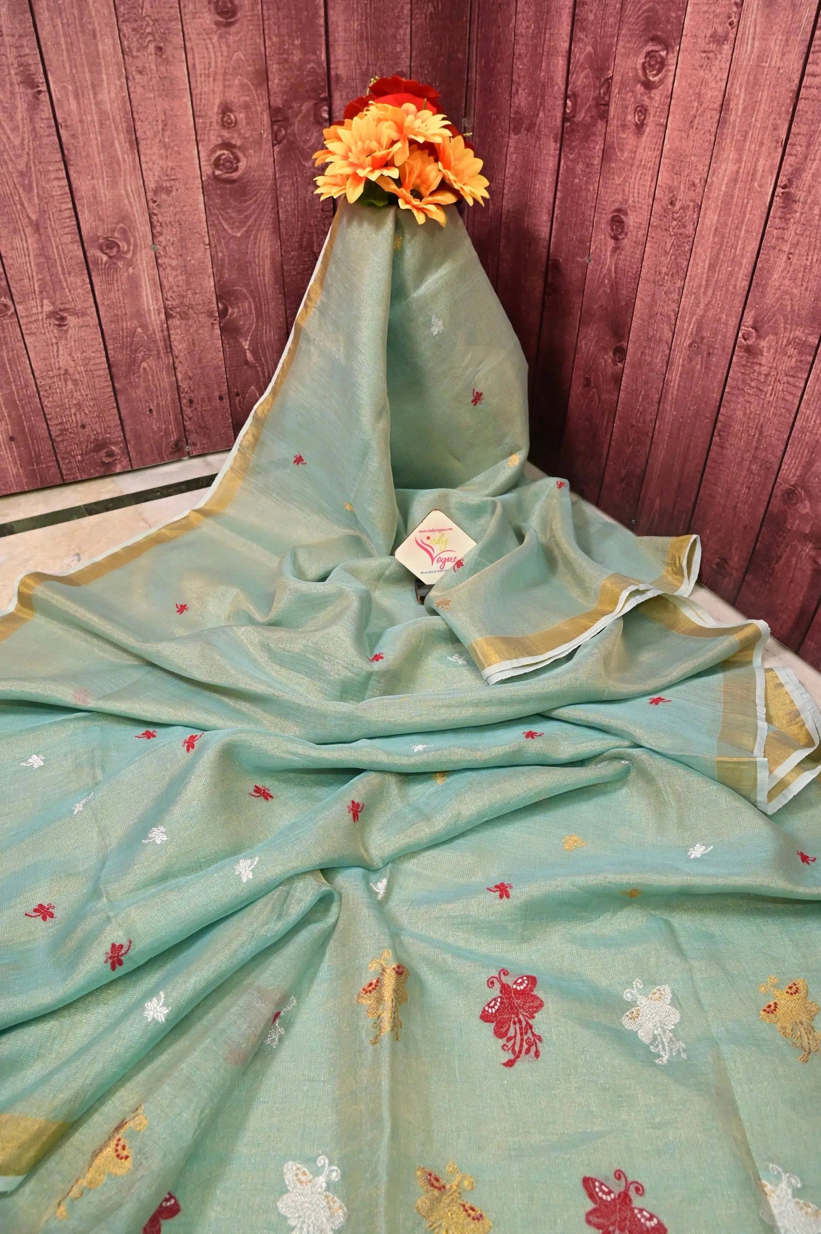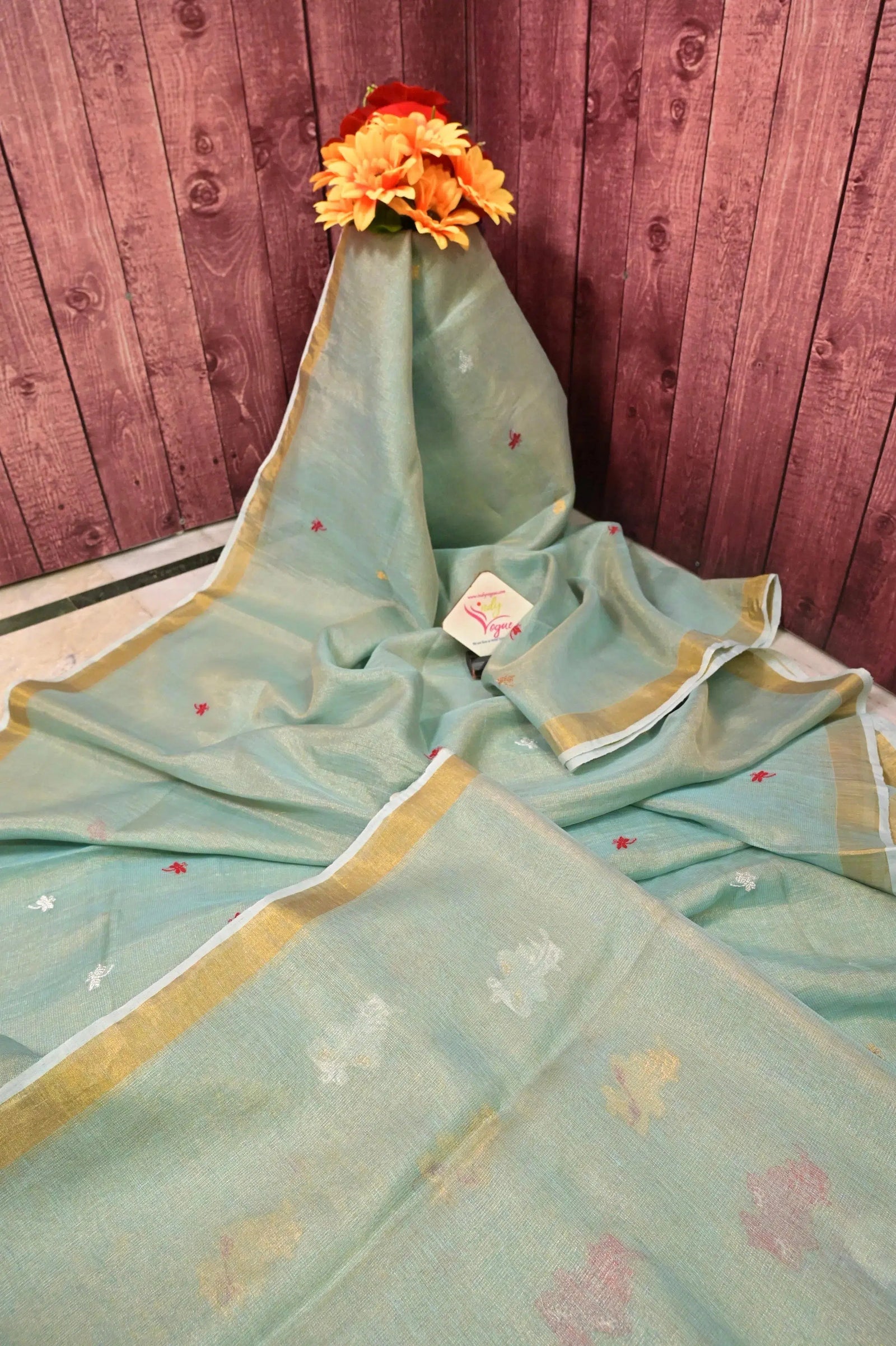 Firozi Color Tissue Linen Saree with Allover Silver and Golden Zari Butta Work