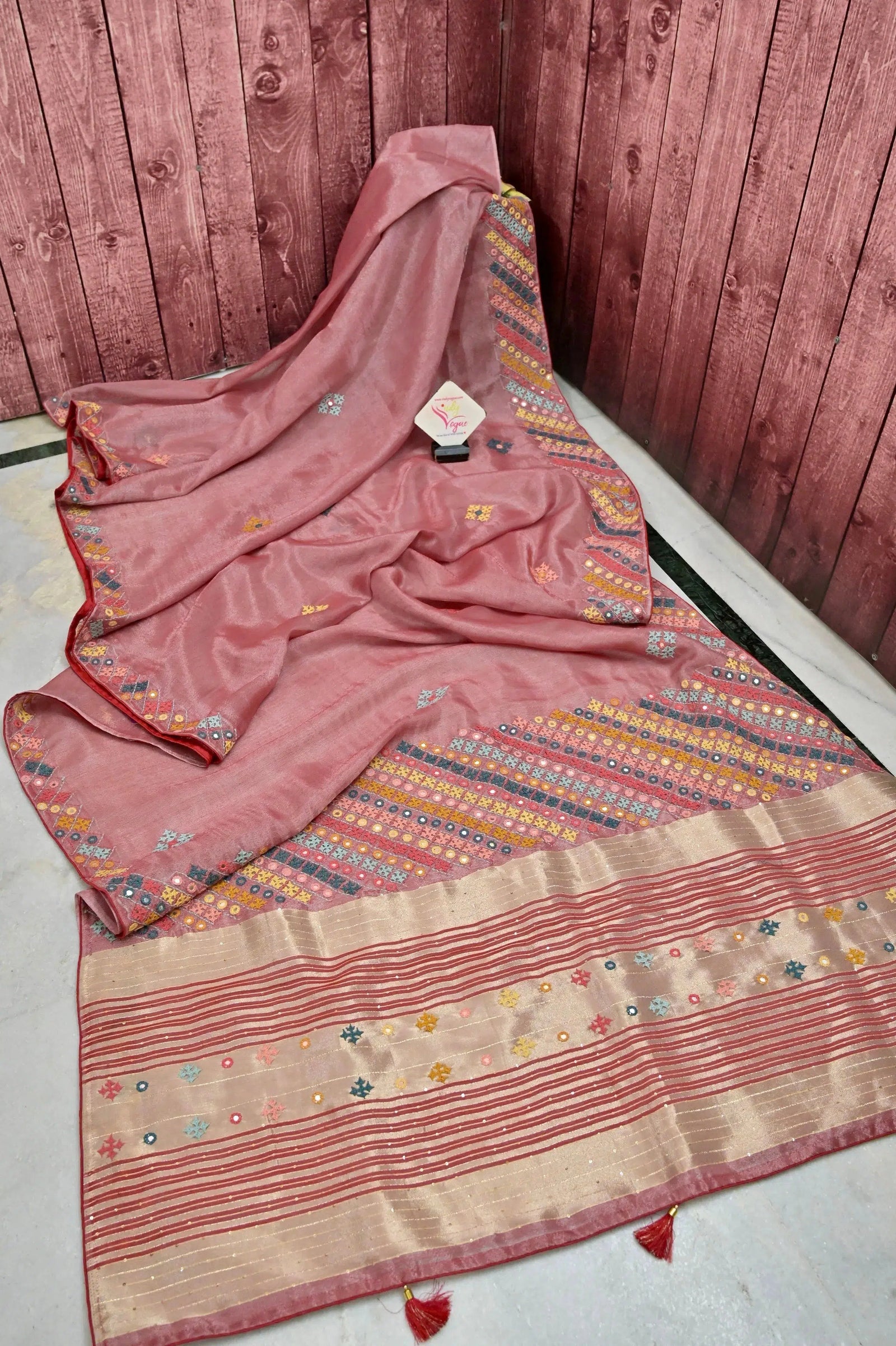 French Onion Color Silk Linen Saree with Hand Gujarati Stitch Work