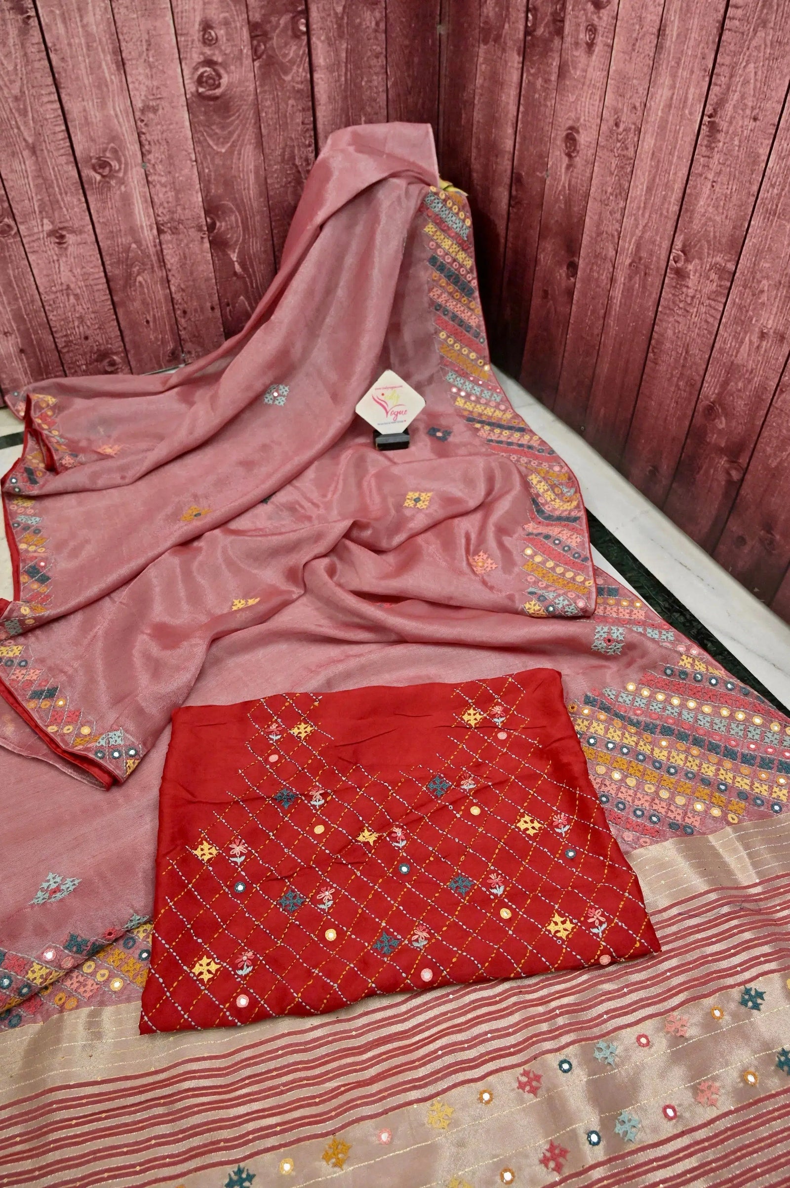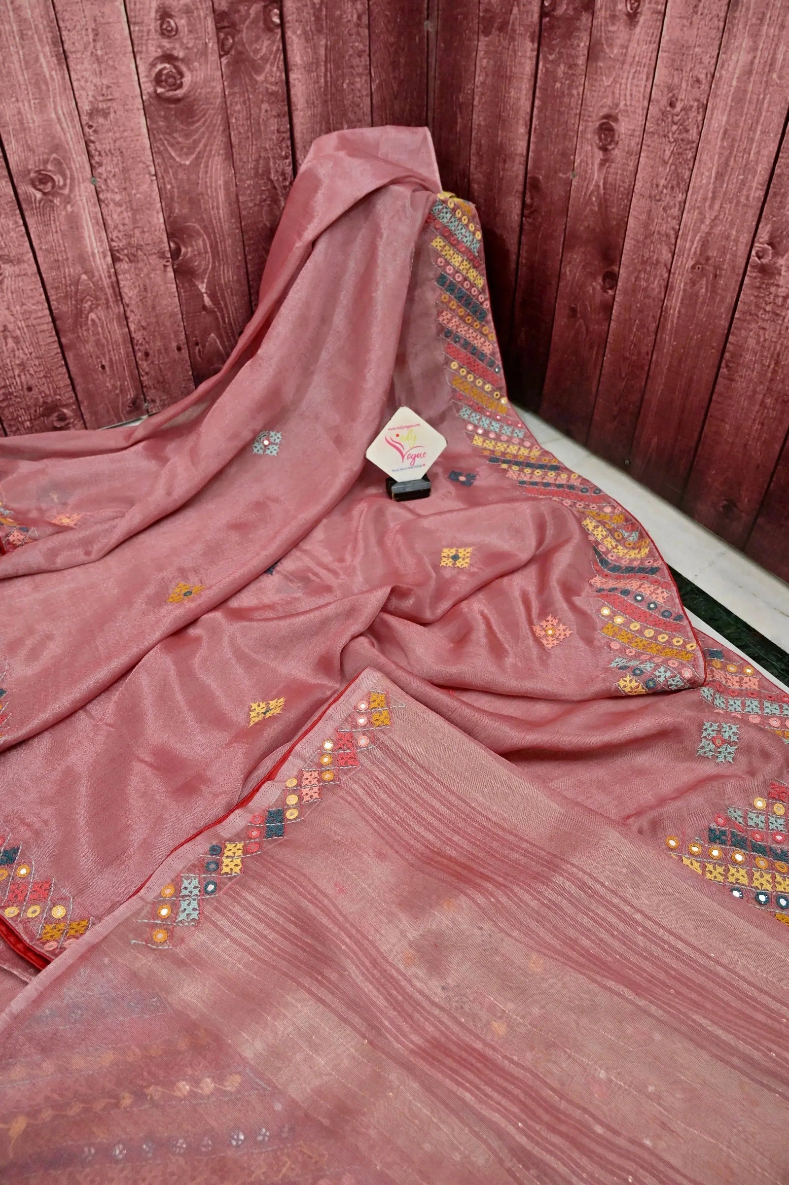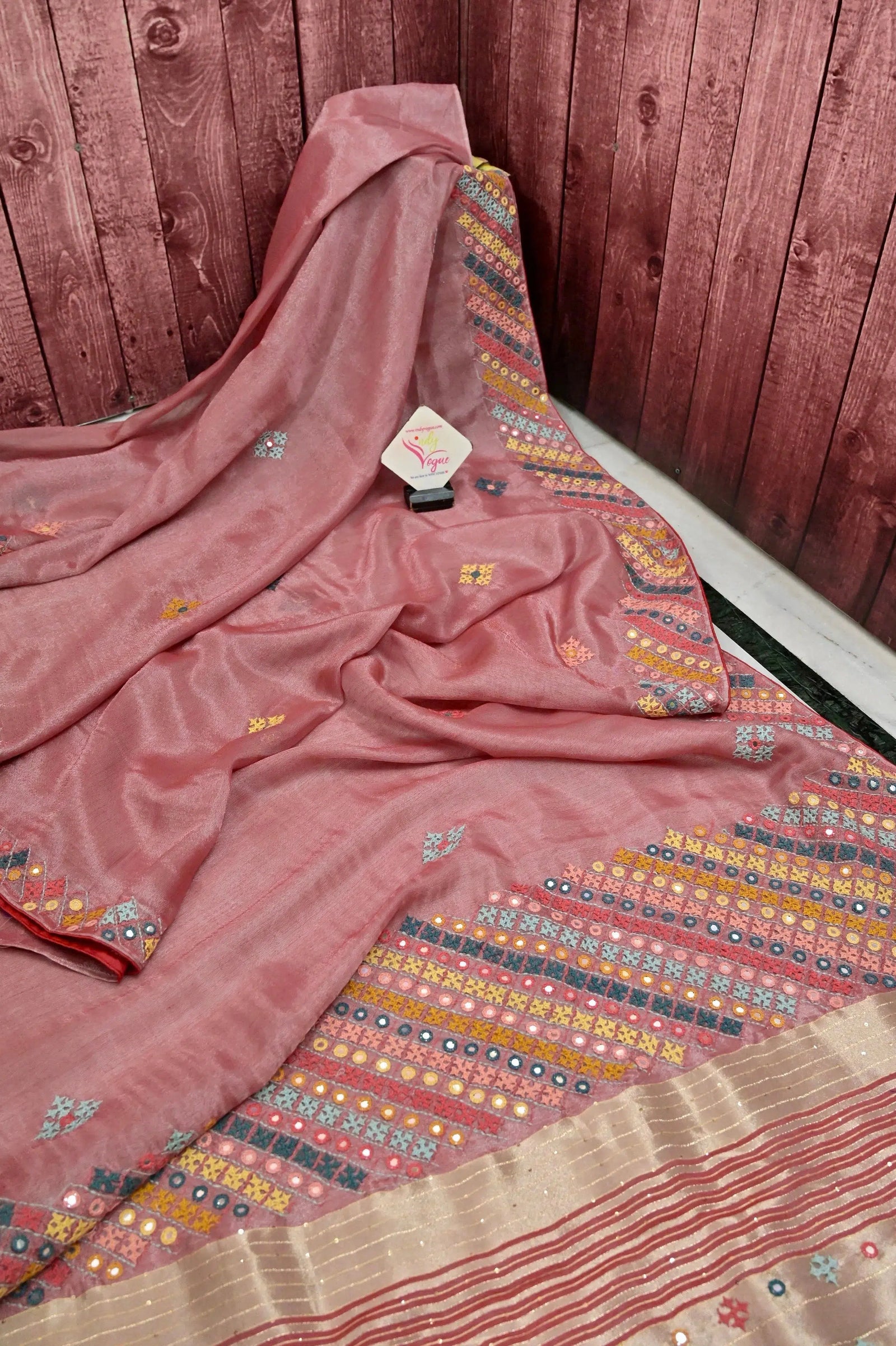 Upgrade your wardrobe look with this excellent French onion color piece of linen silk with Gujarati stitch and hand mirror work done throughout the body of the saree to bring out the perfect gorgeous look.