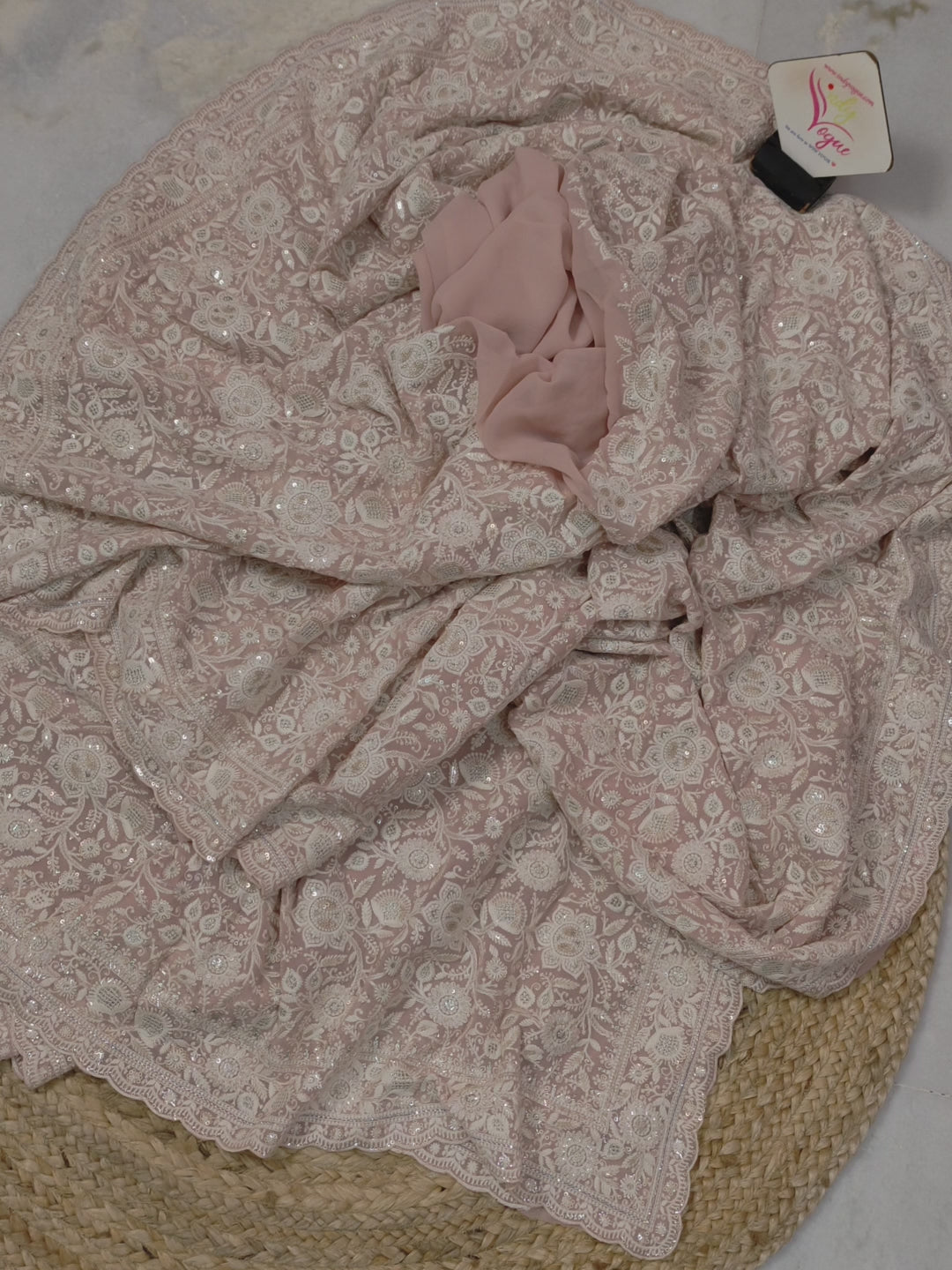 Georgette Saree in Light Pink Color with Allover Chikankari Embroidery and Sequin Work with Scallop Border