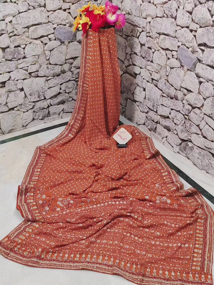 Georgette Saree in Rust Color with Floral Print and Zari and Sequin Embroidery on Pallu with Cod Piping Border