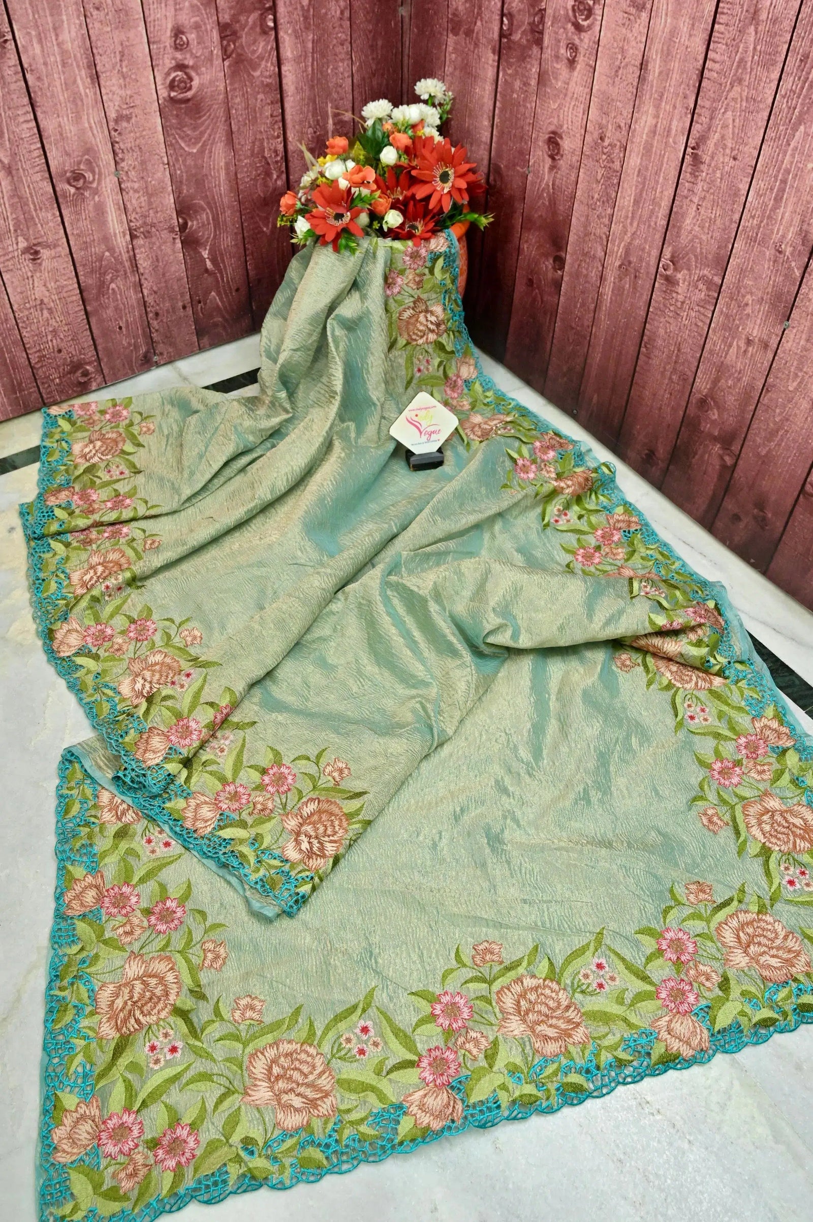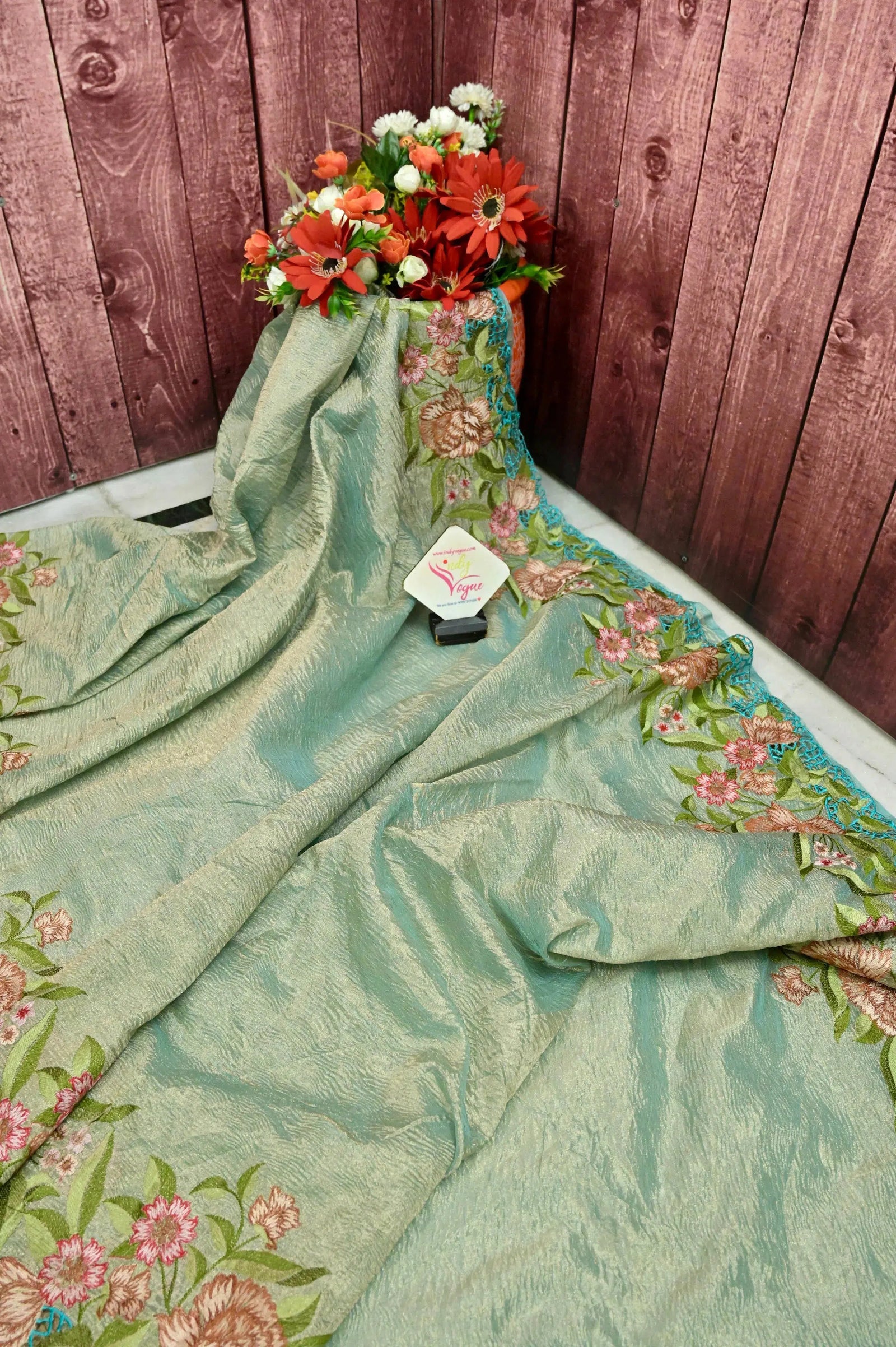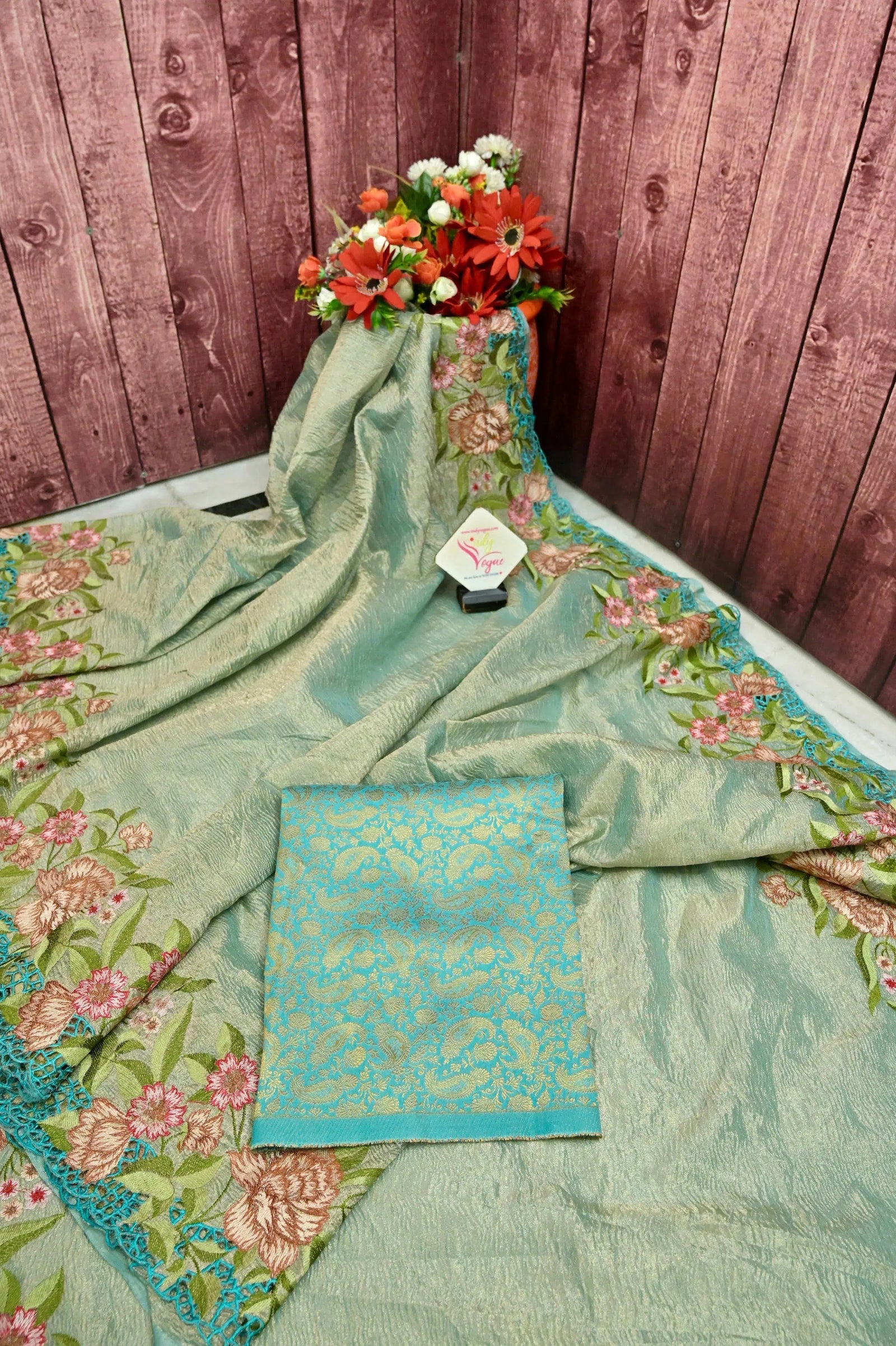 Golden and Blue Undertone Color Crushed Tissue Silk Saree with Embroidery and Cutwork