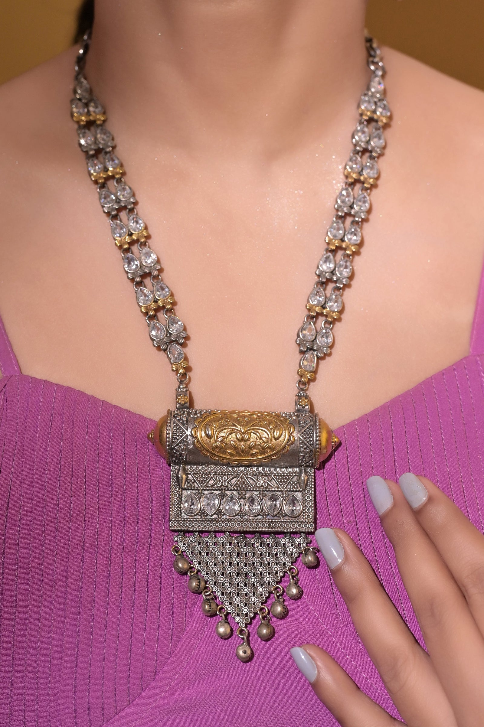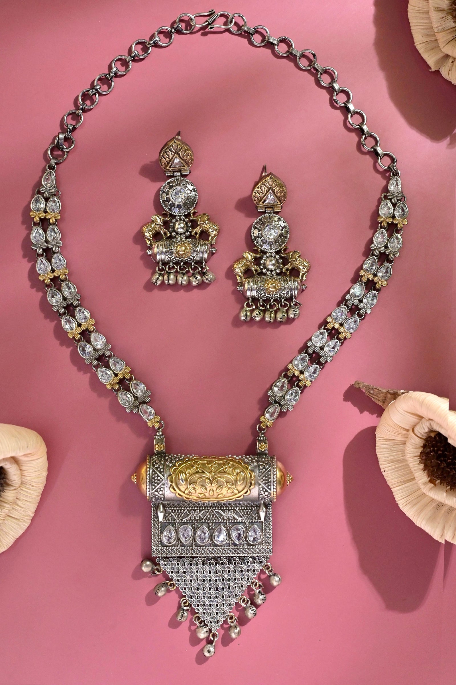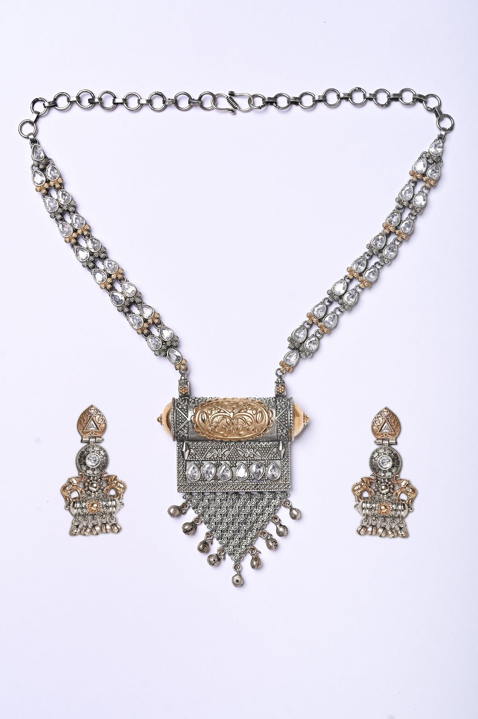 Get acquainted with a new age fashion lingo with our latest collection of silver and golden metal dual-tone collar necklaces set with Stone work on the neckline to make it more unique. It is paired with a beautiful silver and golden metal dual-tone jhumka. The penny is kept by the side to help you understand the size of the product.